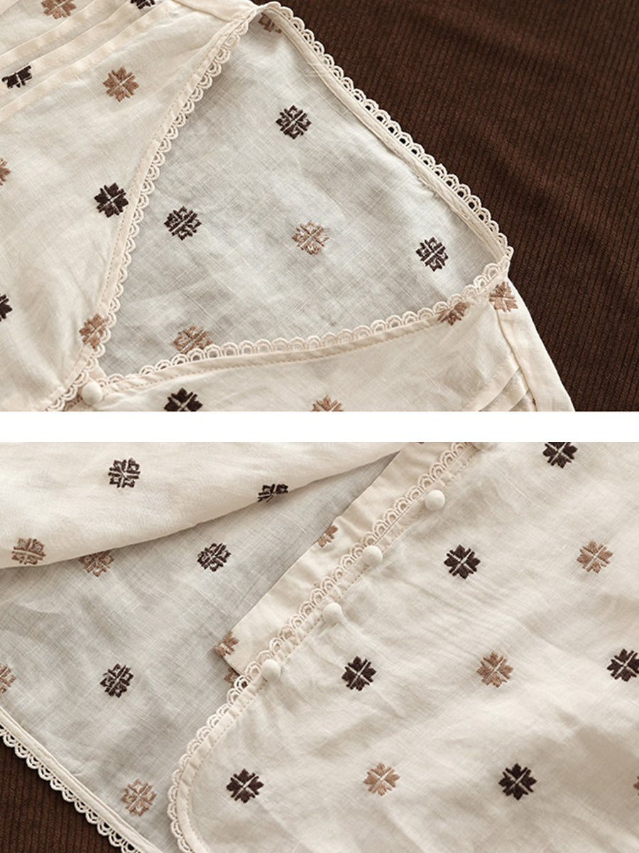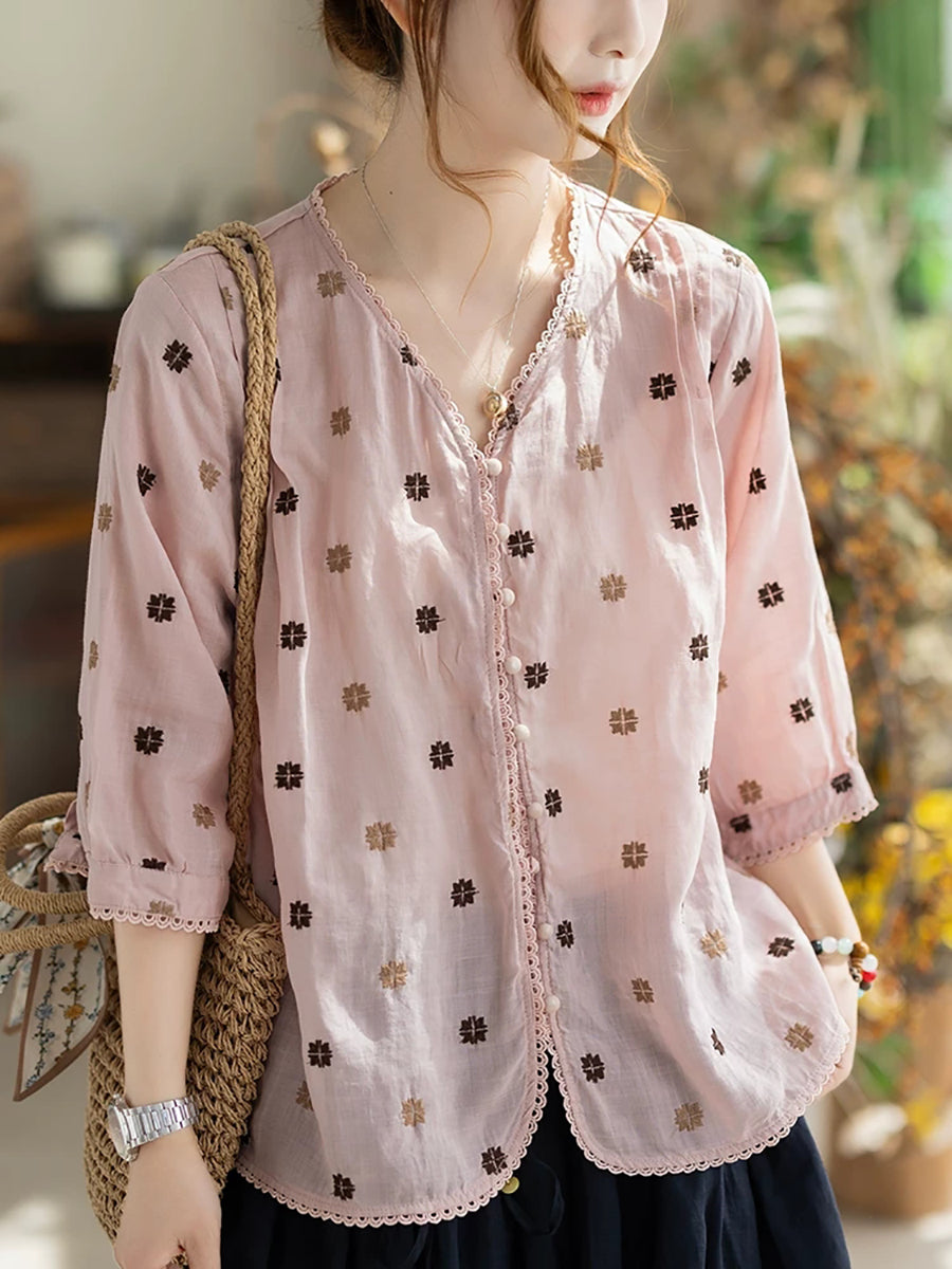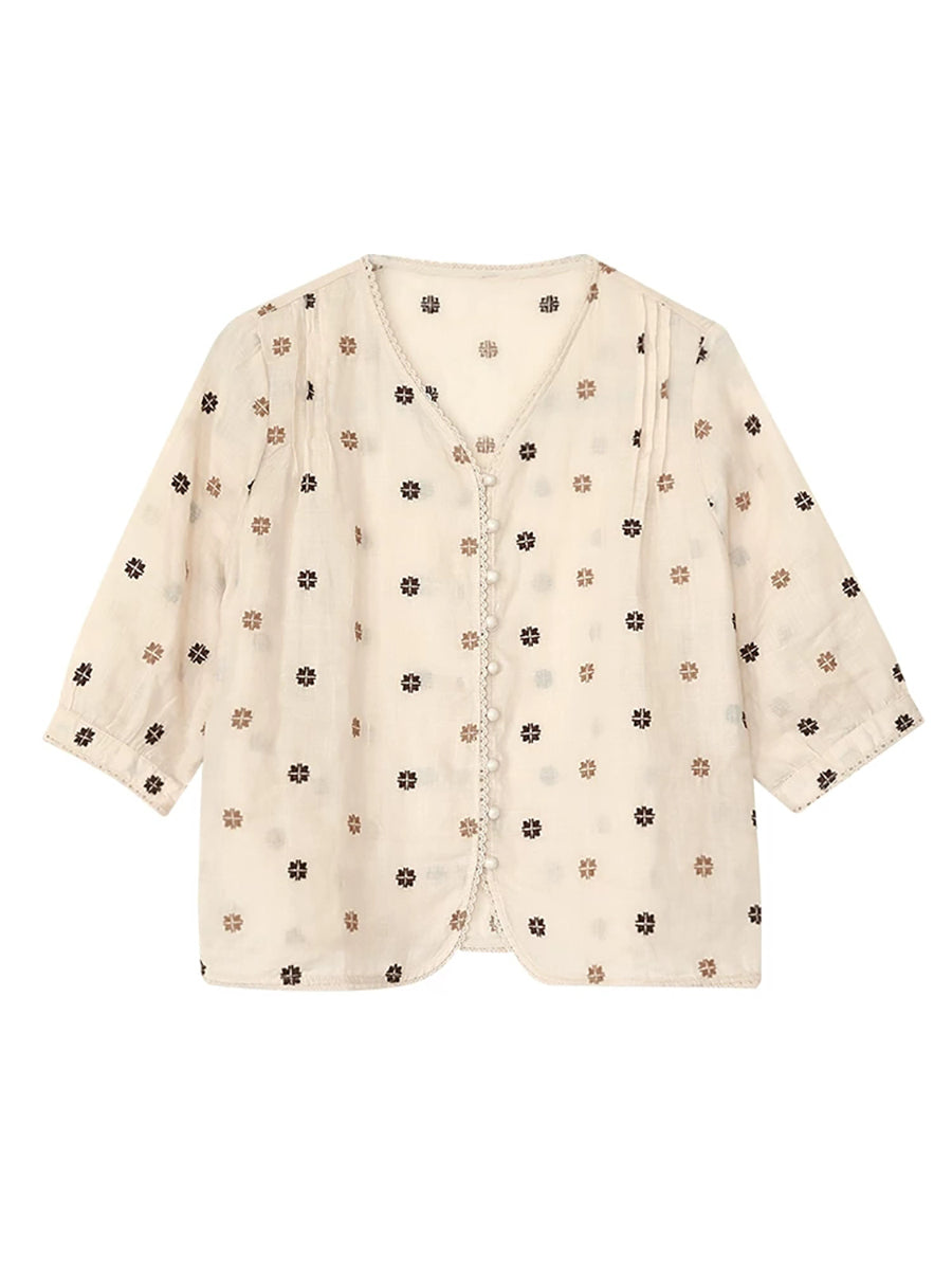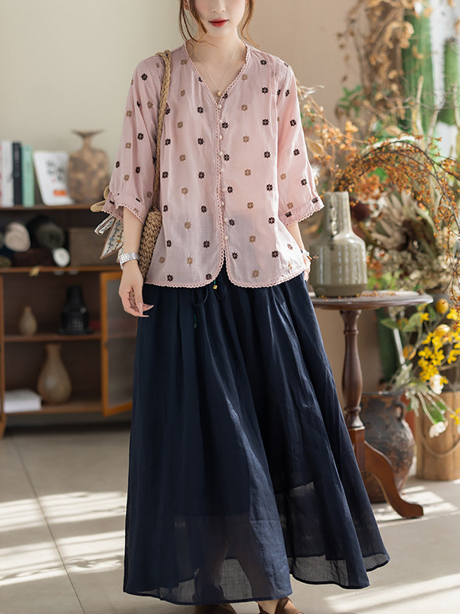 Women Summer Artsy Embroidery V-Neck 100%Ramie Shirt