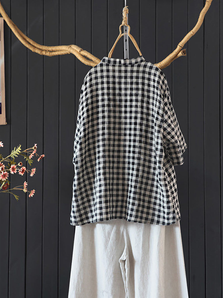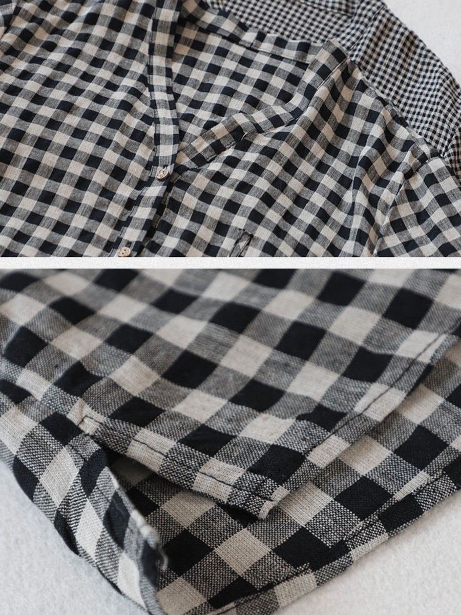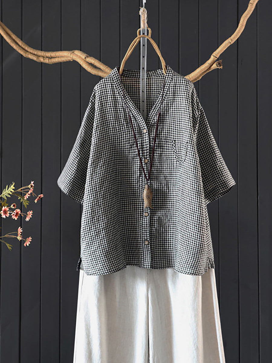 Women Summer Plaid V-Neck 100%Linen Shirt