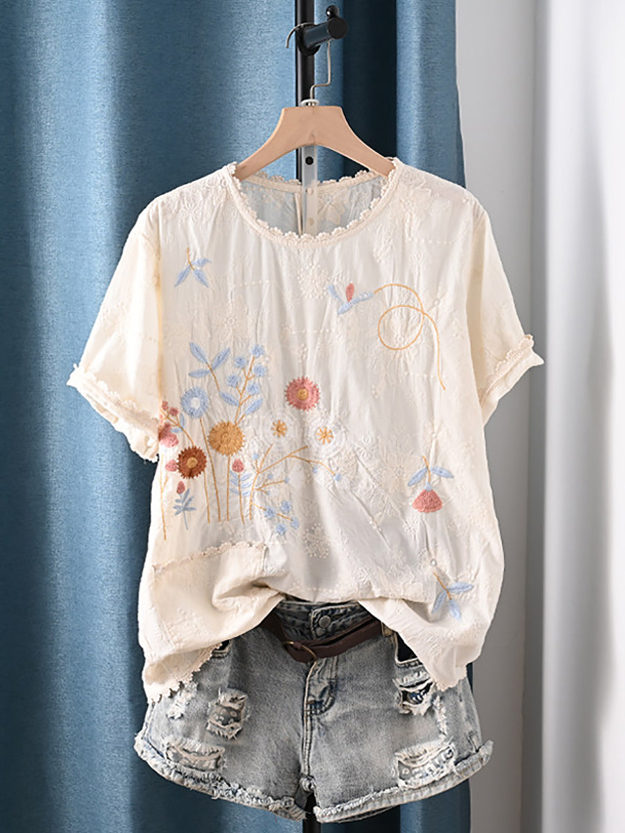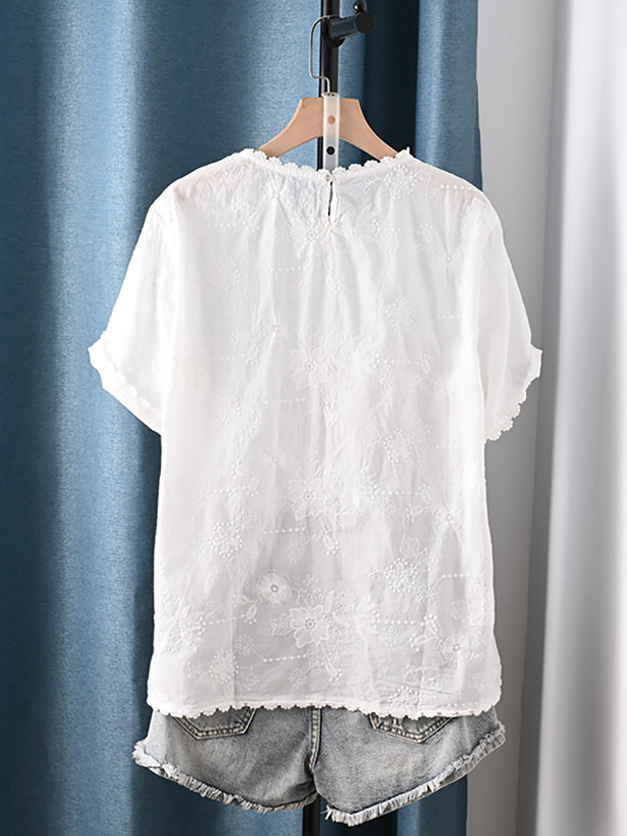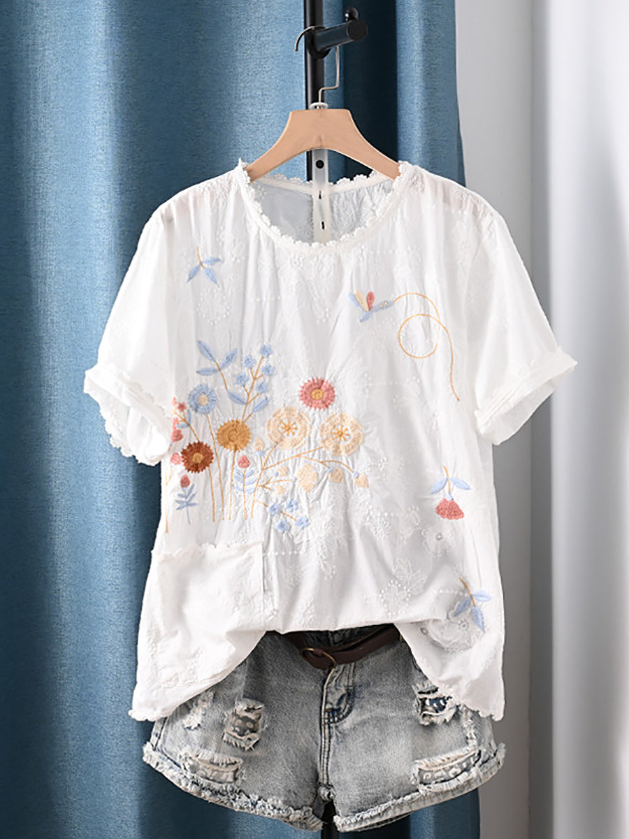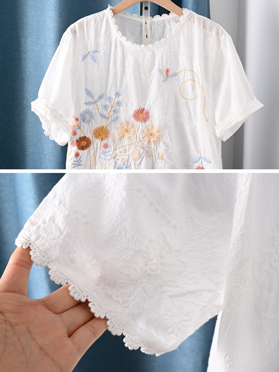 Women Summer Artsy Flower Embroidery 100%Cotton Blouse