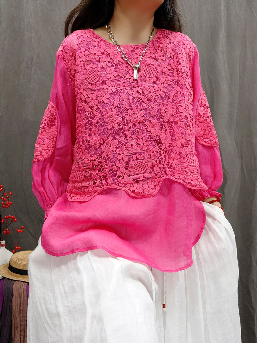 Women Summer Artsy Flower Lace O-Neck 100%Ramie Shirt