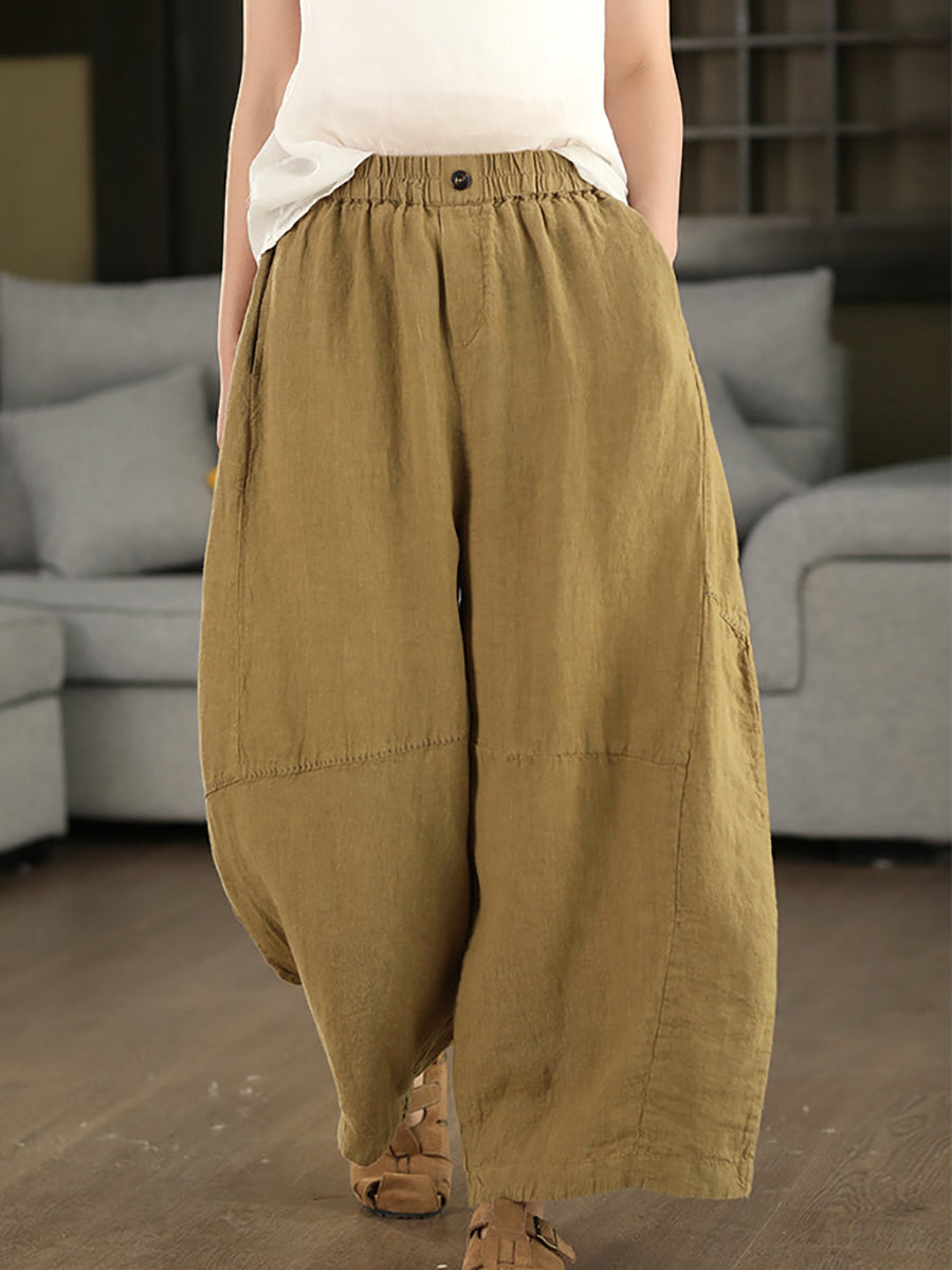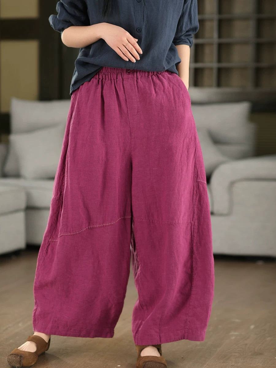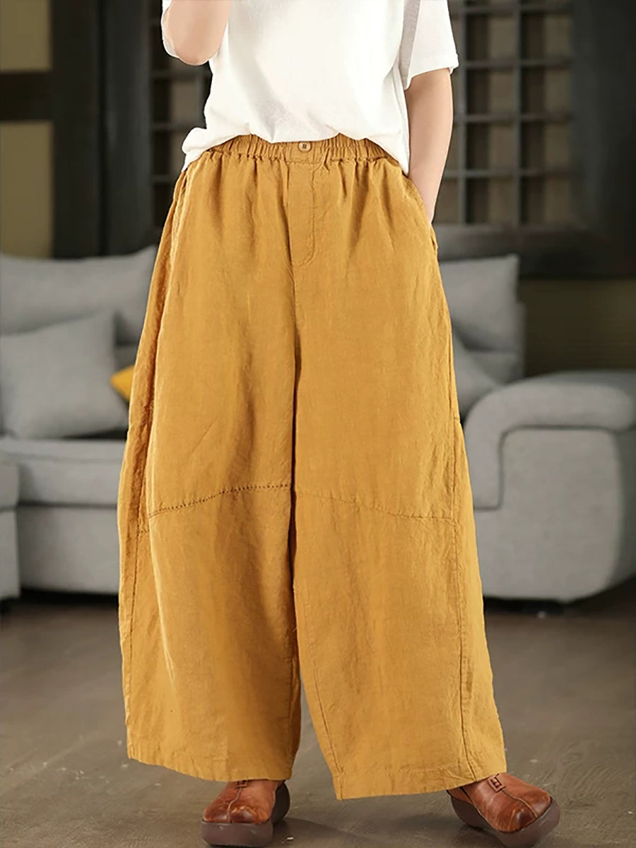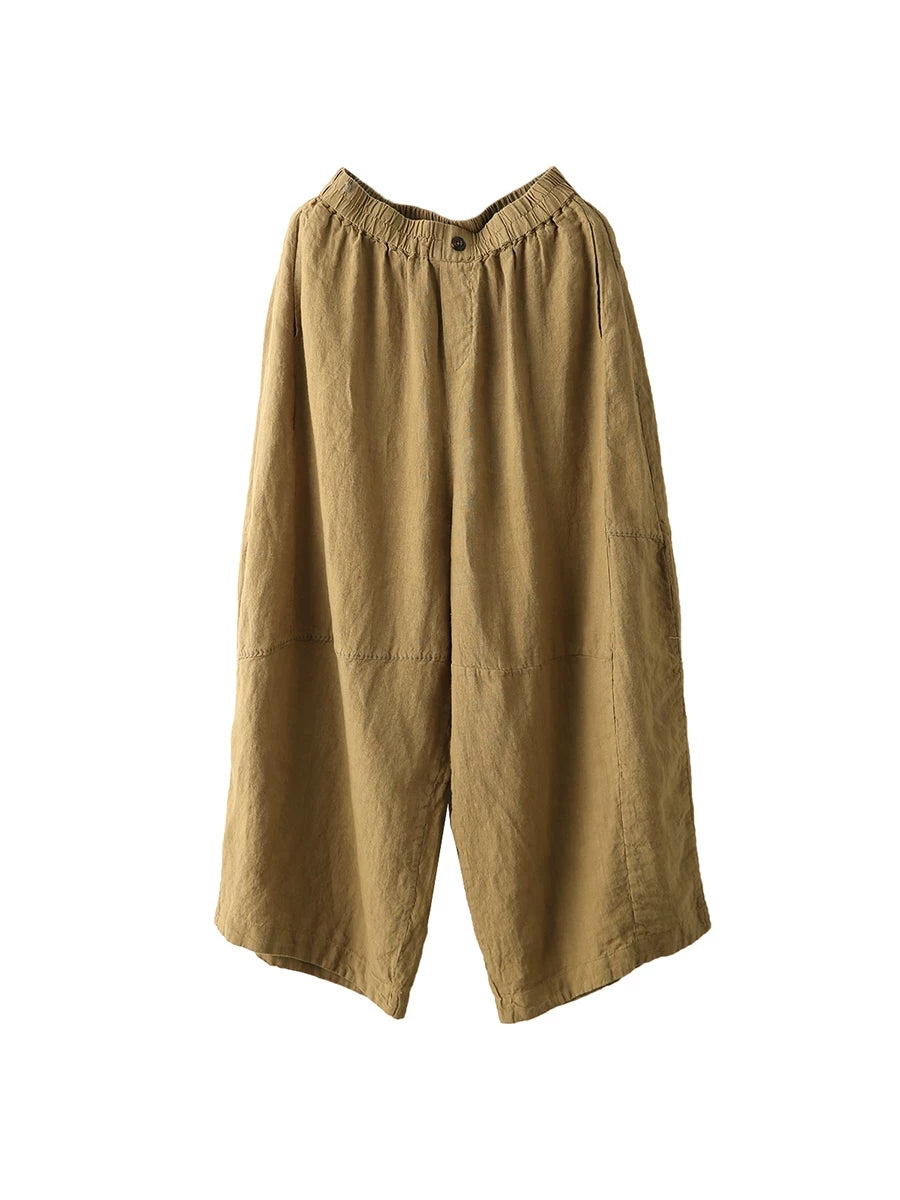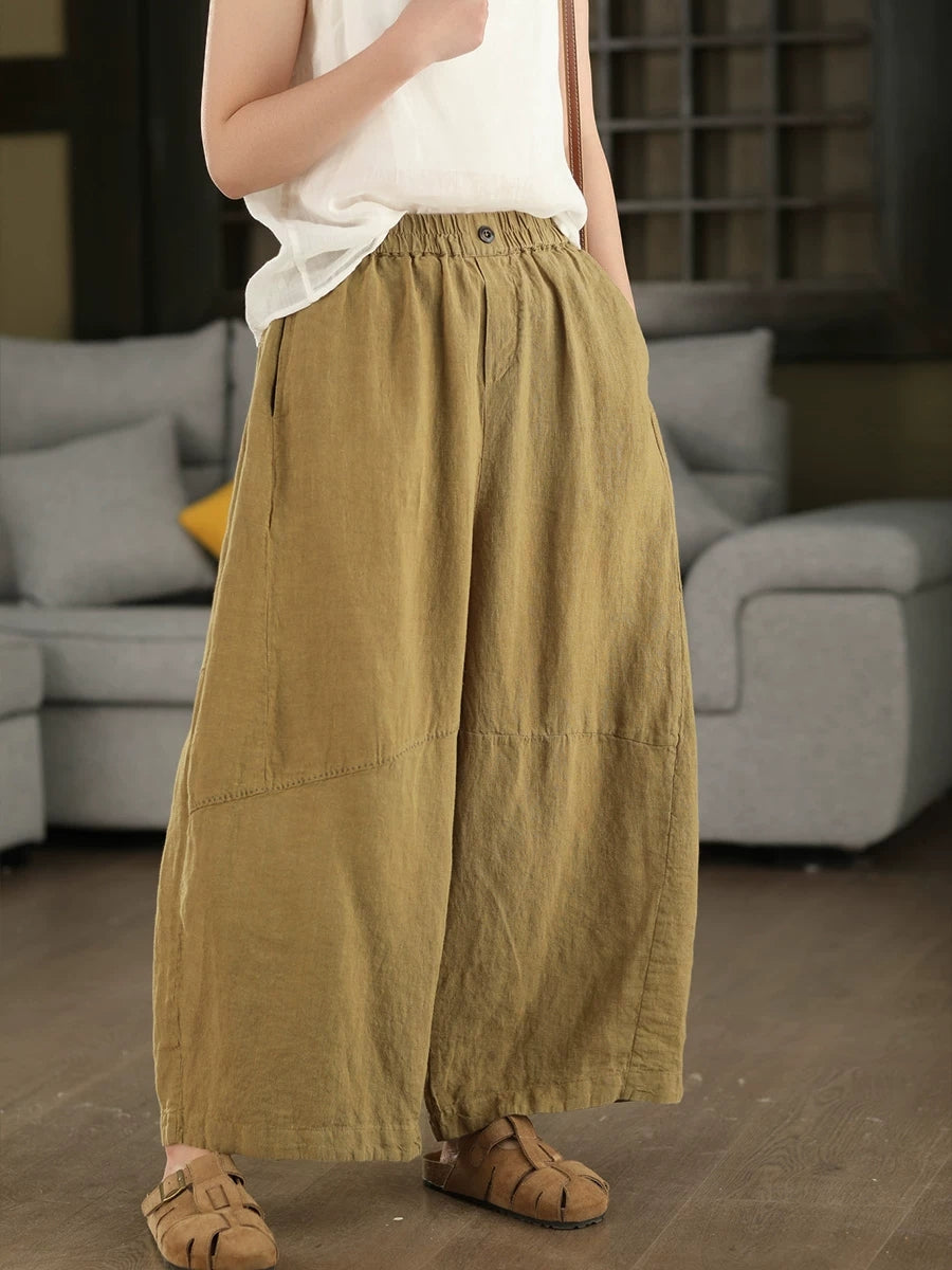 Women Summer Retro Pure Color 100%Linen Wide-leg Pants