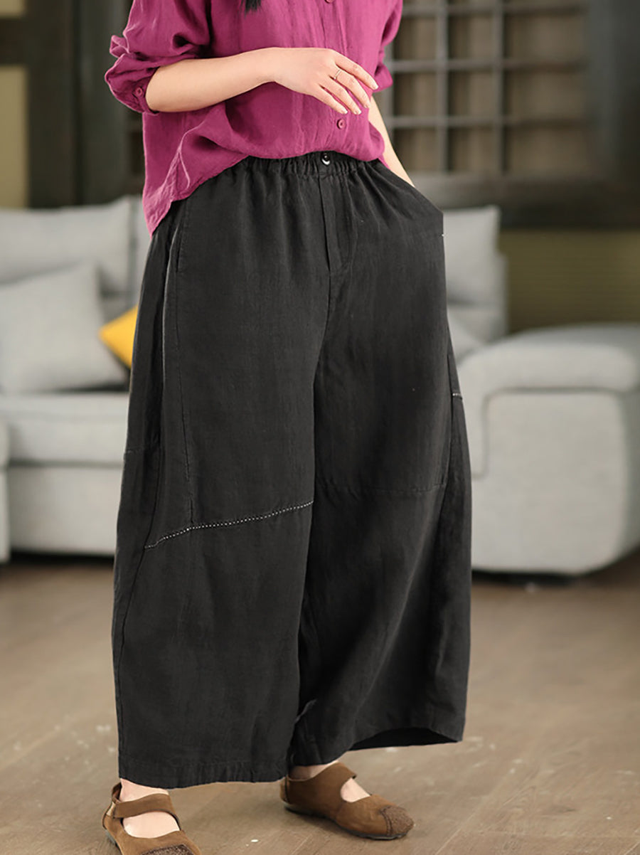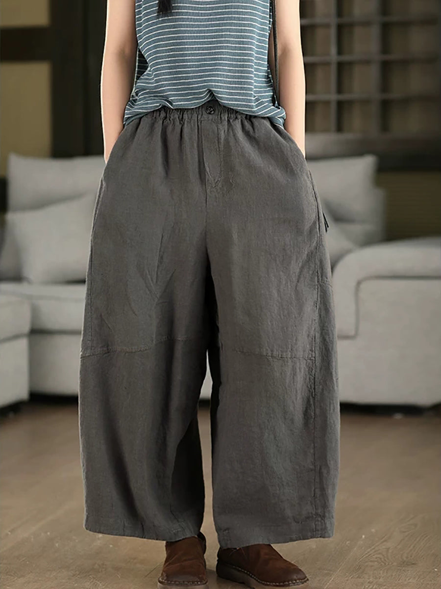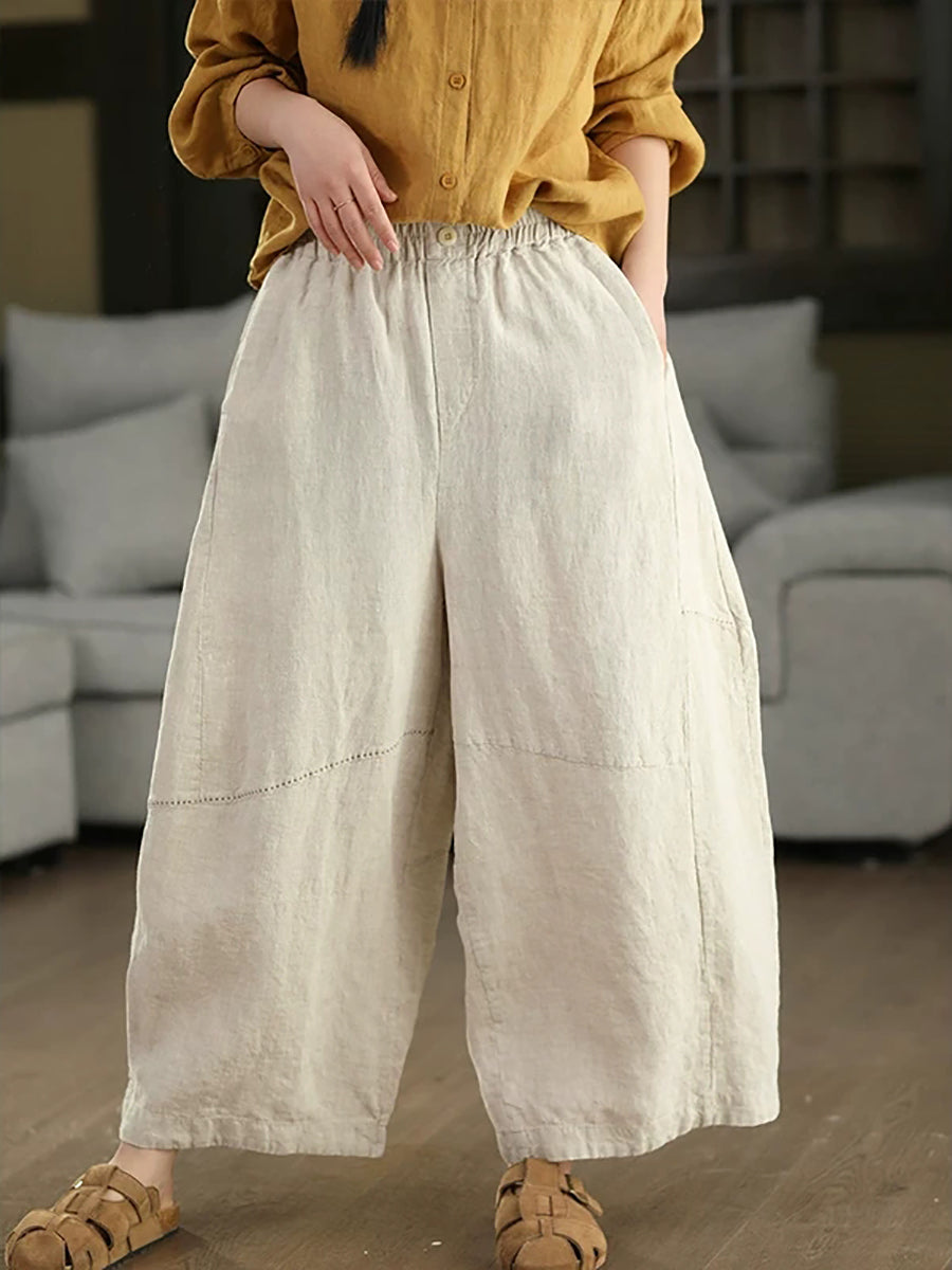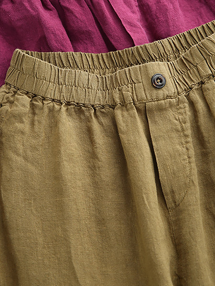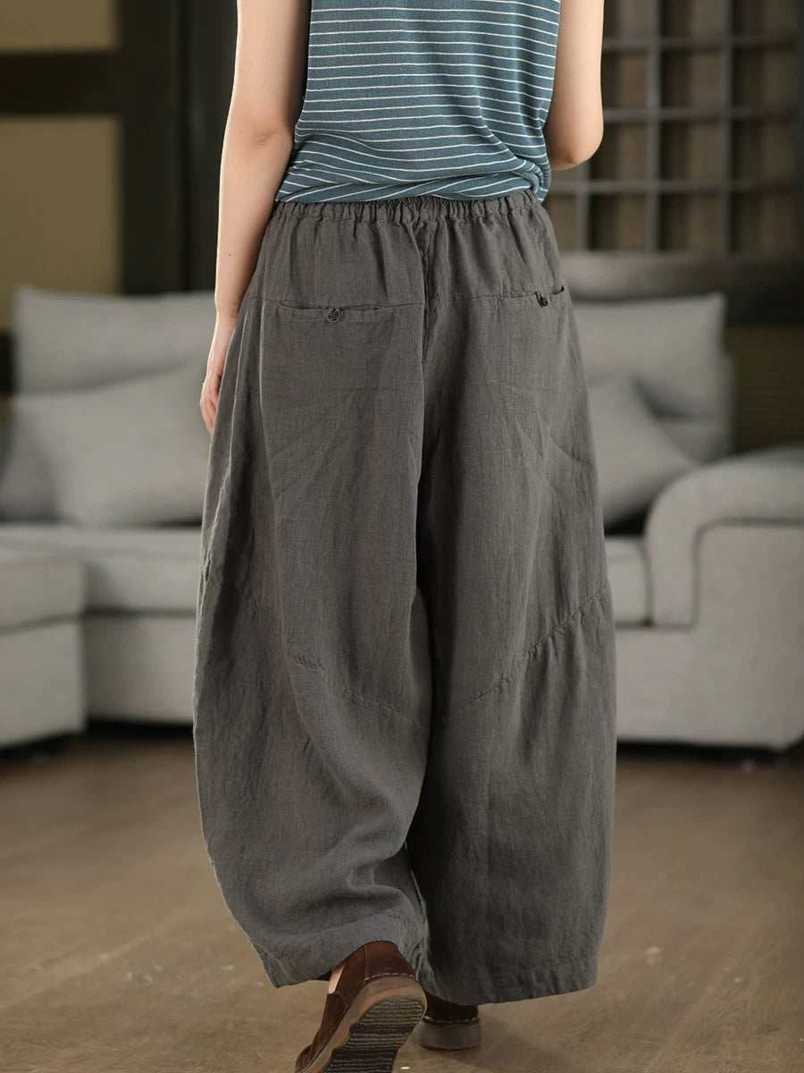 Women Summer Retro Pure Color 100%Linen Wide-leg Pants