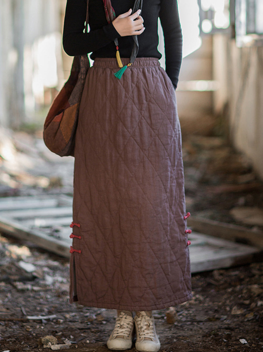 Women Autumn Ethnic Pure Color A-Shape Ramie Padded Skirt