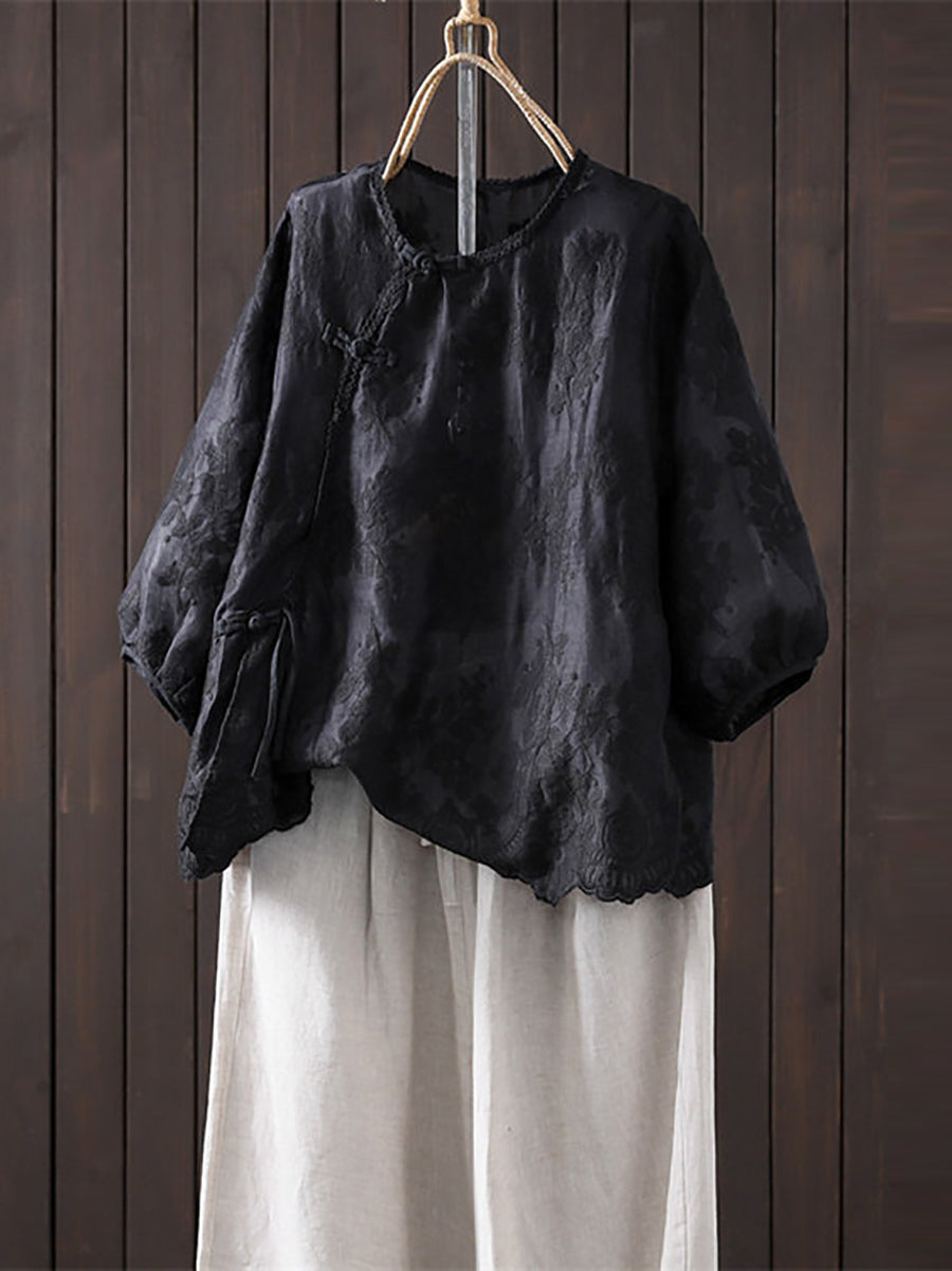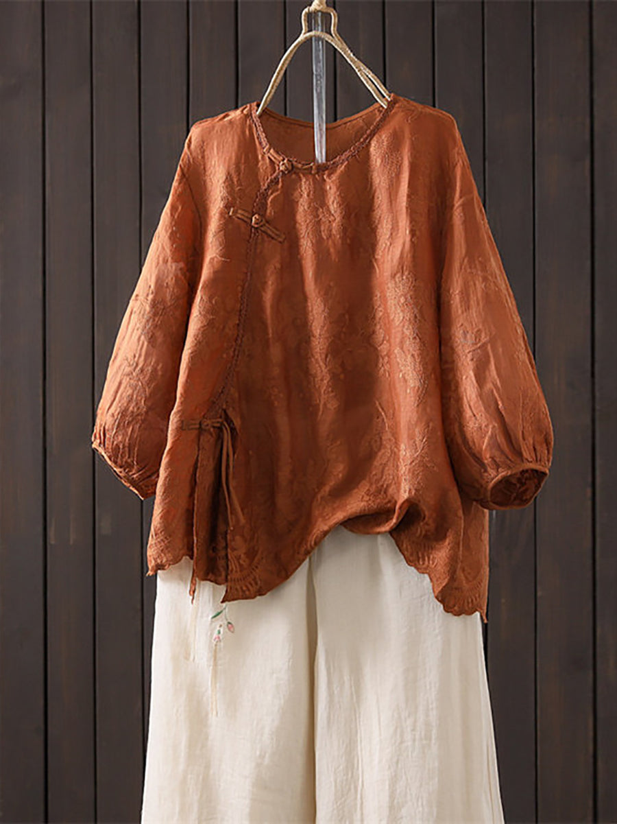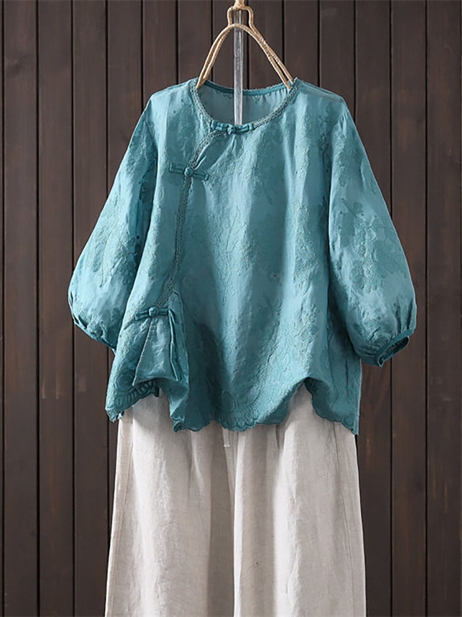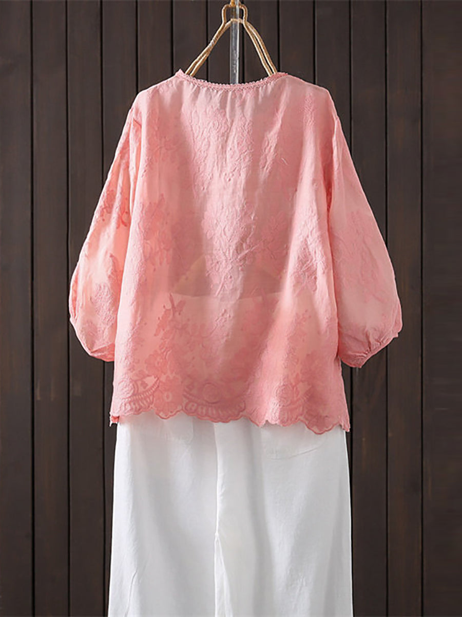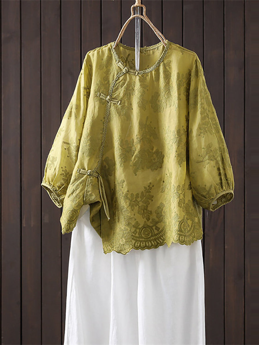 Women Summer Artsy Embroidery 100%Ramie O-Neck Blouse