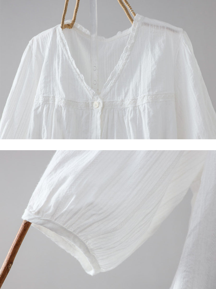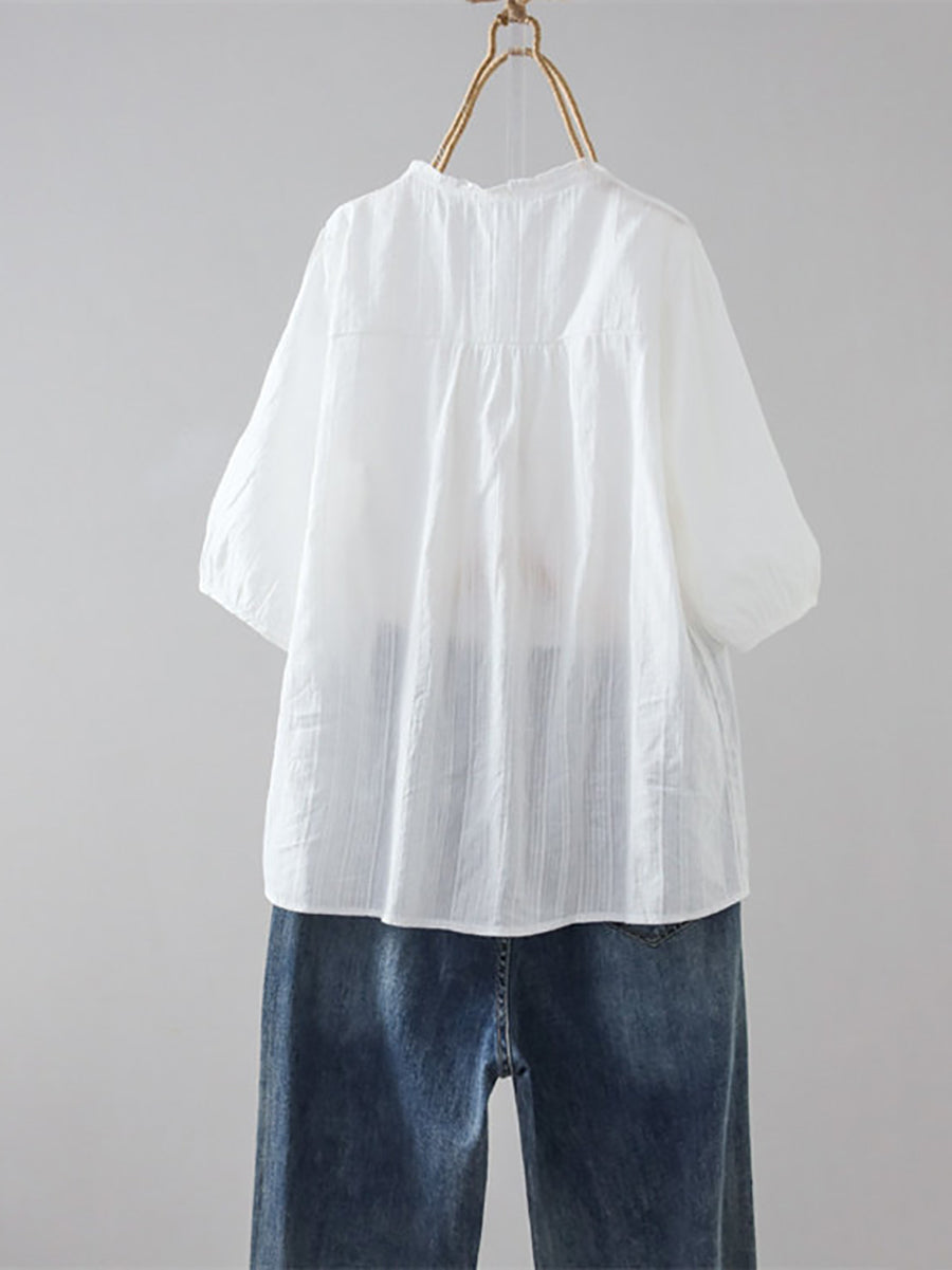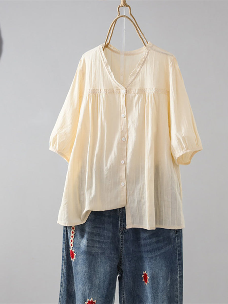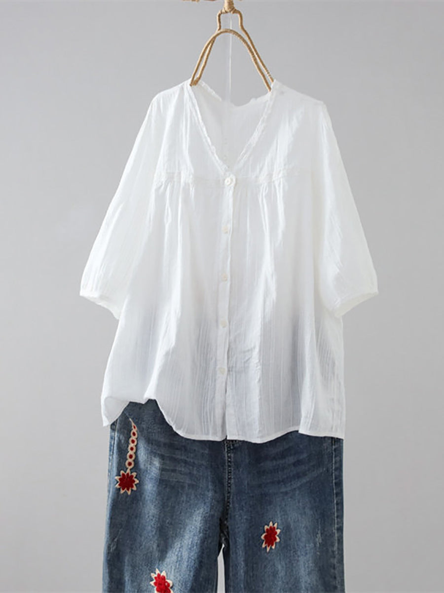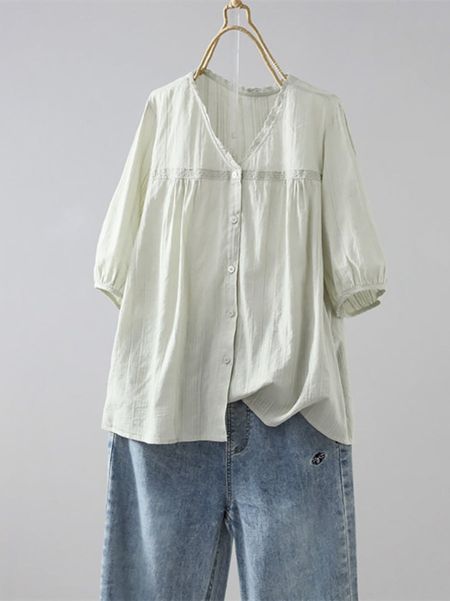 Women Summer Artsy Pure Color 100%Cotton V-Neck Shirt