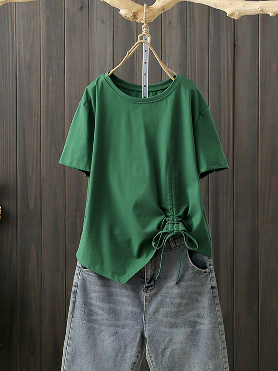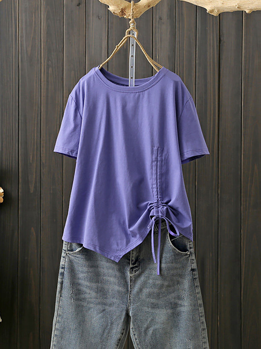 Plus Size Women Summer Artsy Irregular O-Neck Cotton T-Shirt
