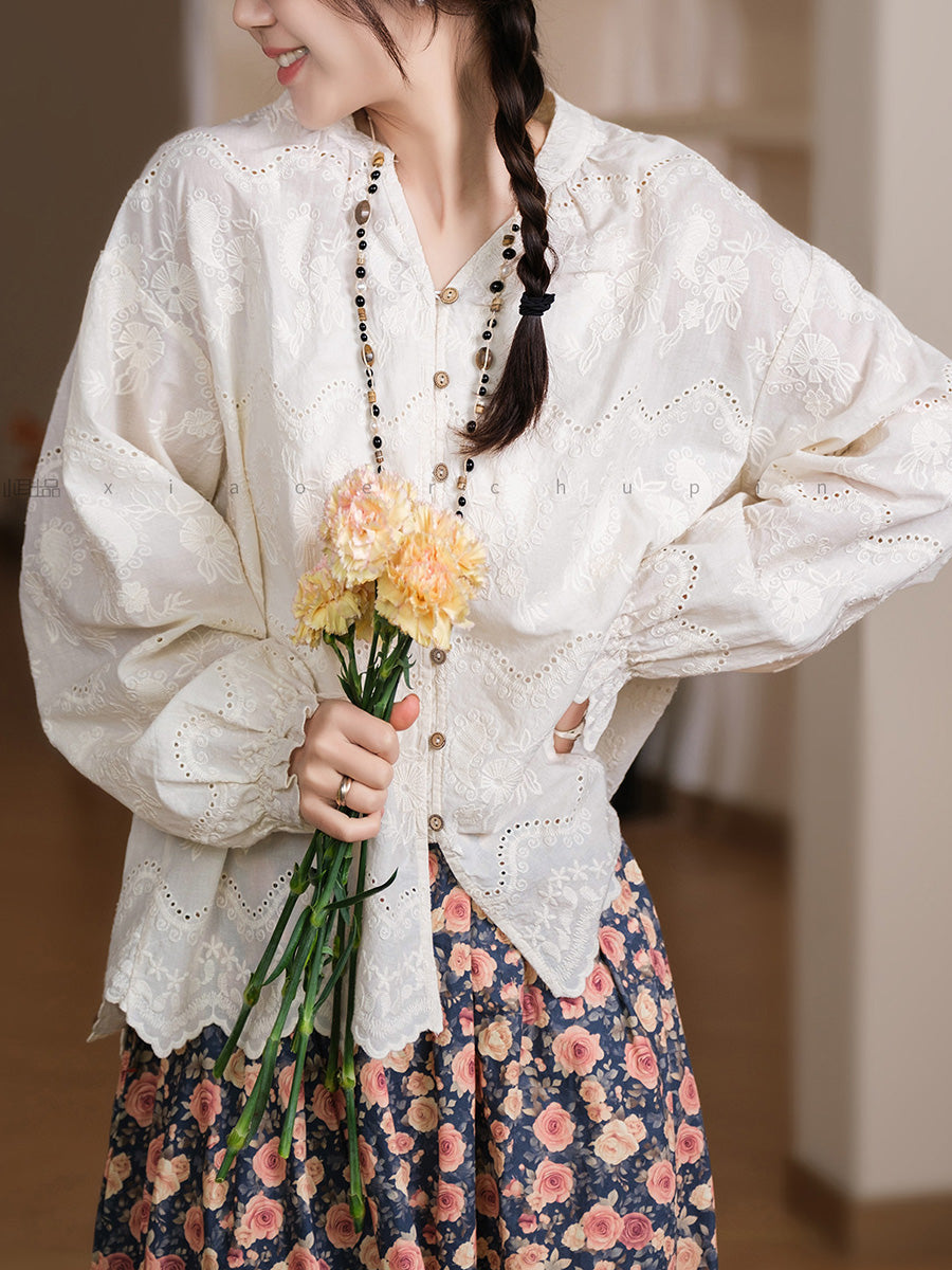 Women Spring Artsy Embroidery 100%Cotton Shirt
