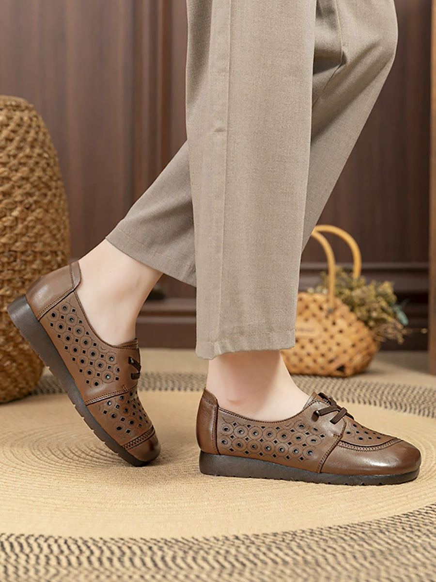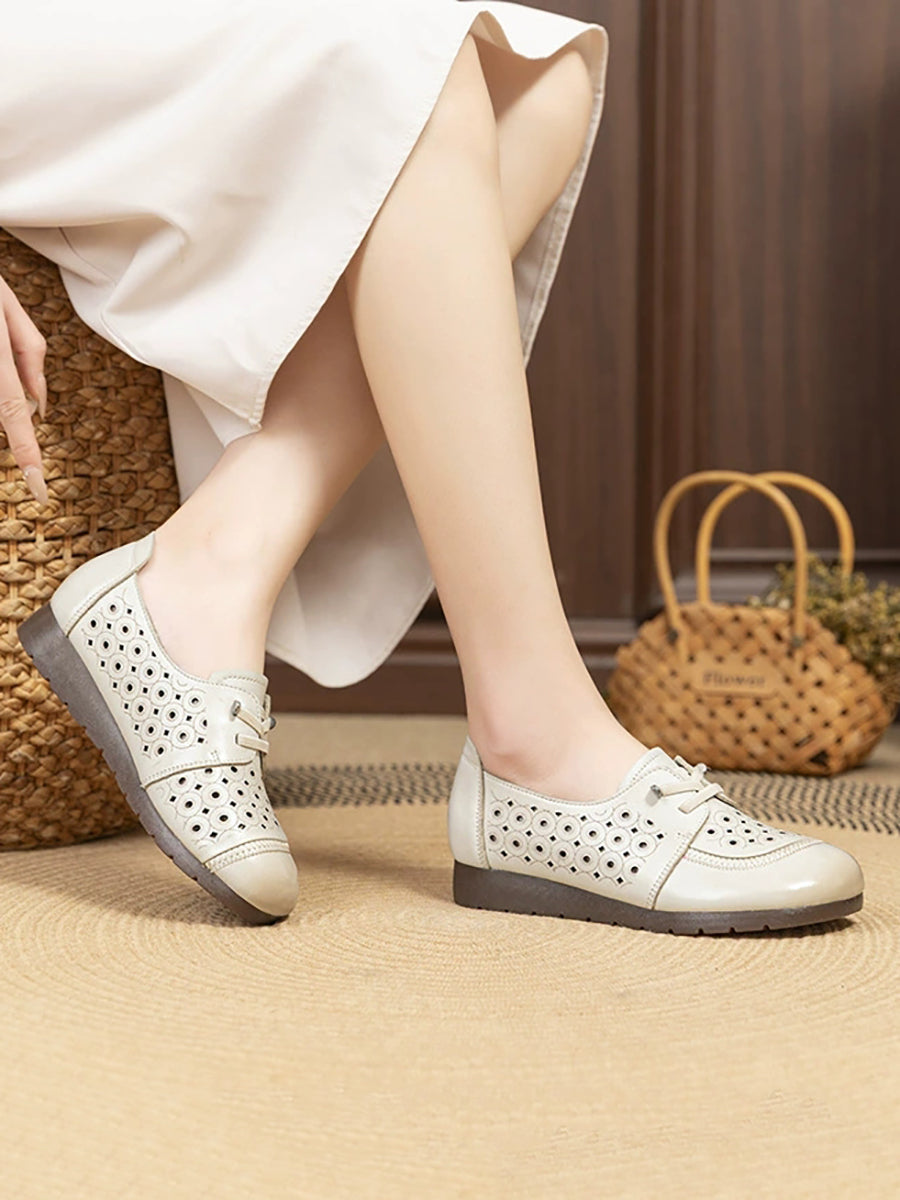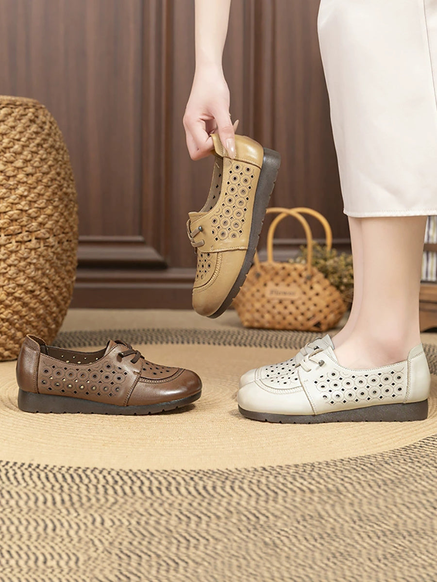 Women Retro Hole Genuine Leather Flat Shoes