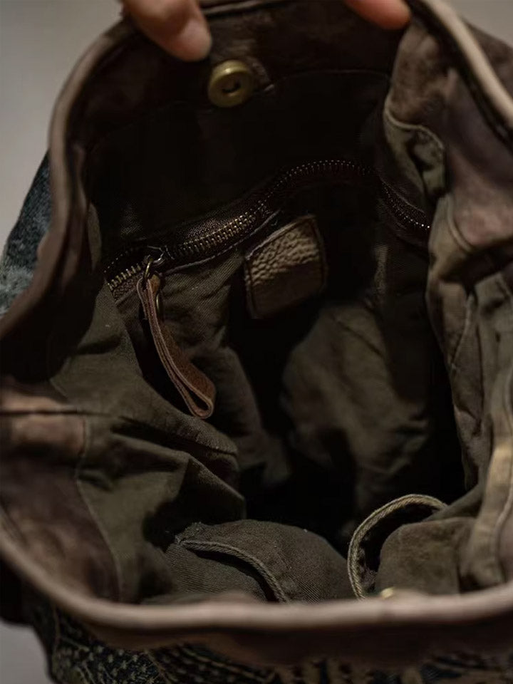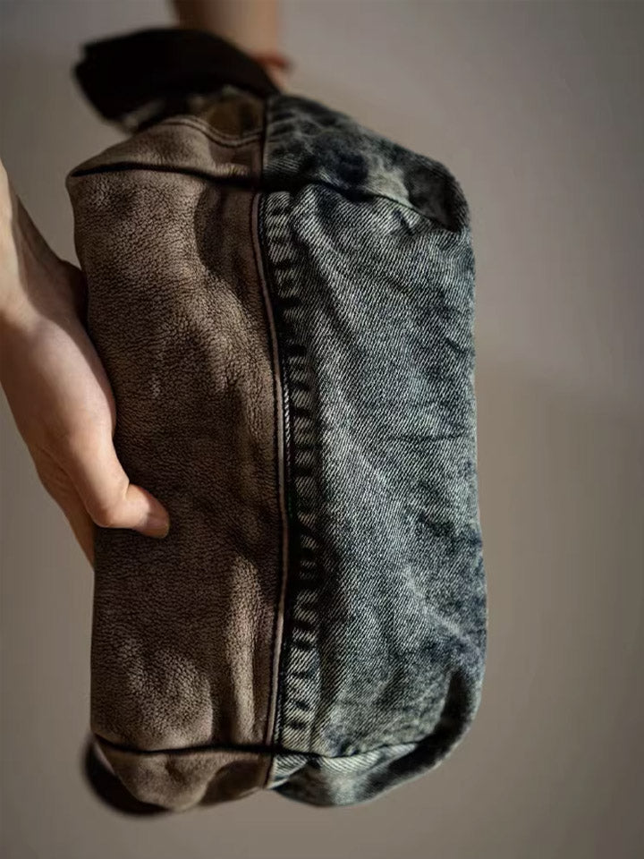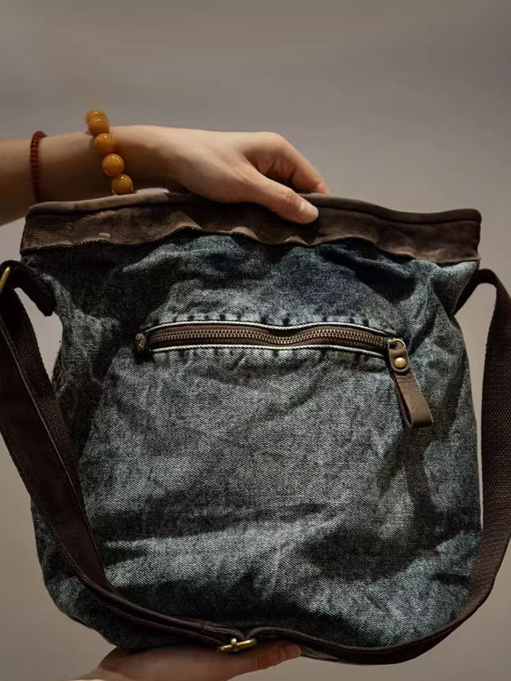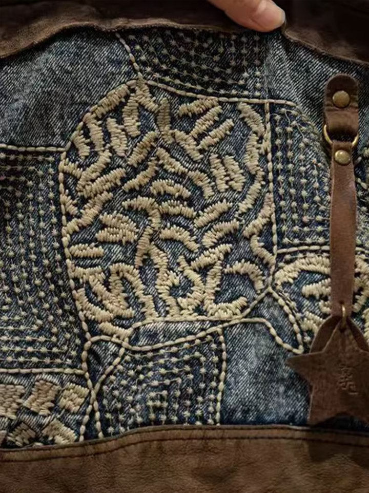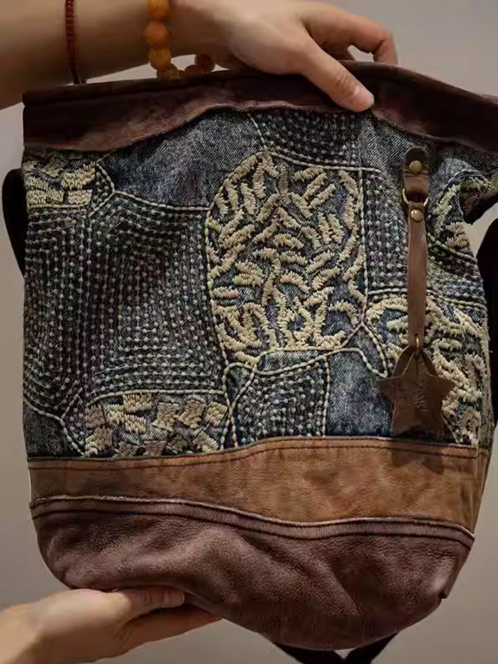 Leather Spliced Ethnic Embroidered Crossbody Bag