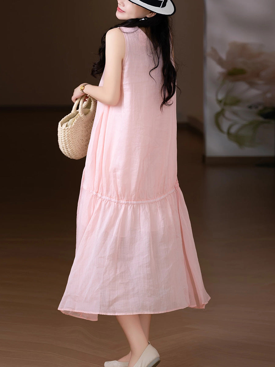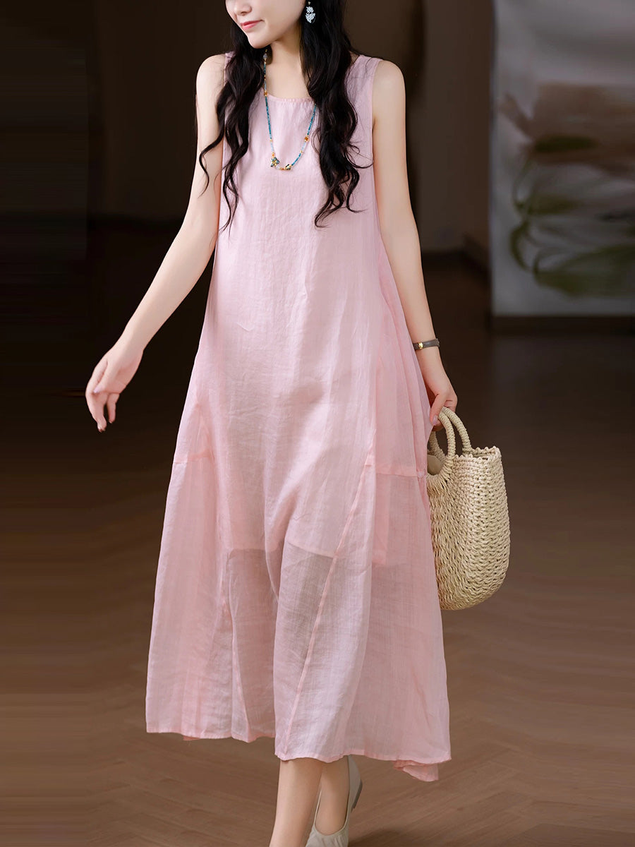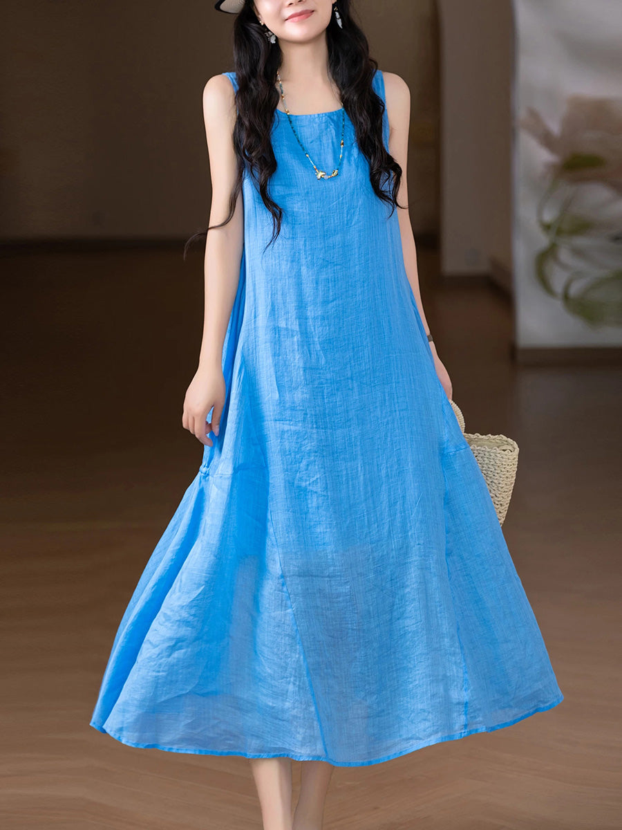 Women Summer Artsy Pure Color 100%Ramie Vest Dress