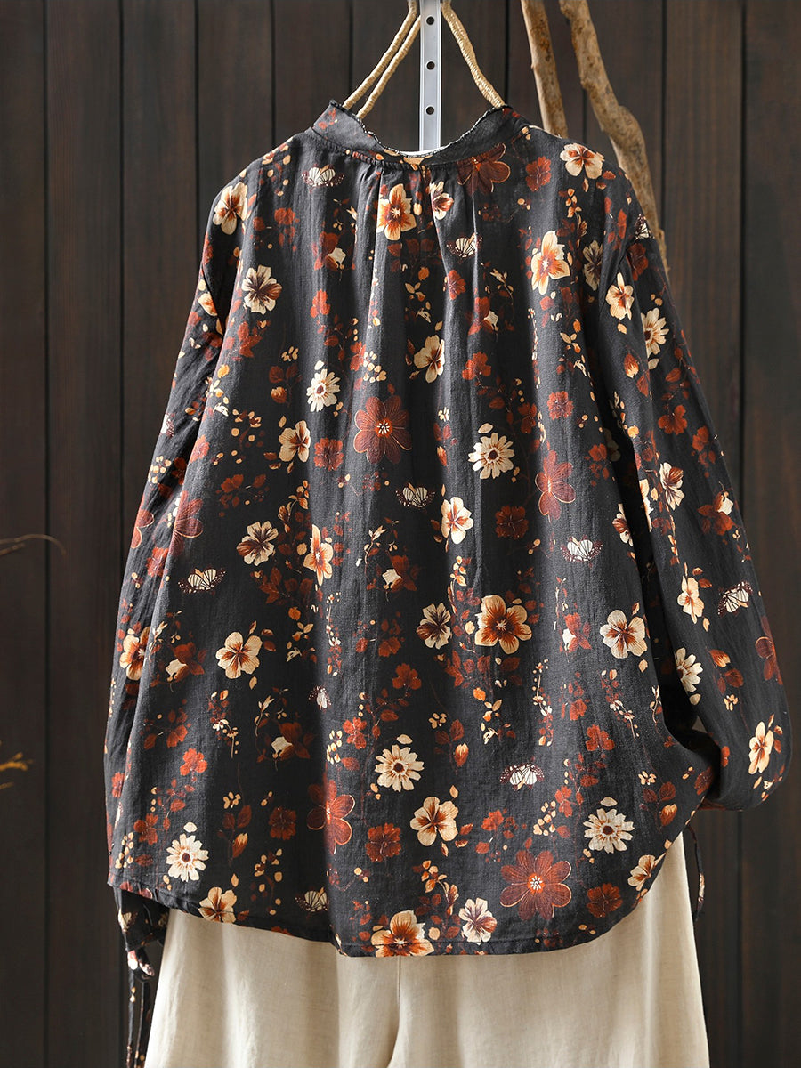 Women Spring Artsy Flower 100%Linen Blouse