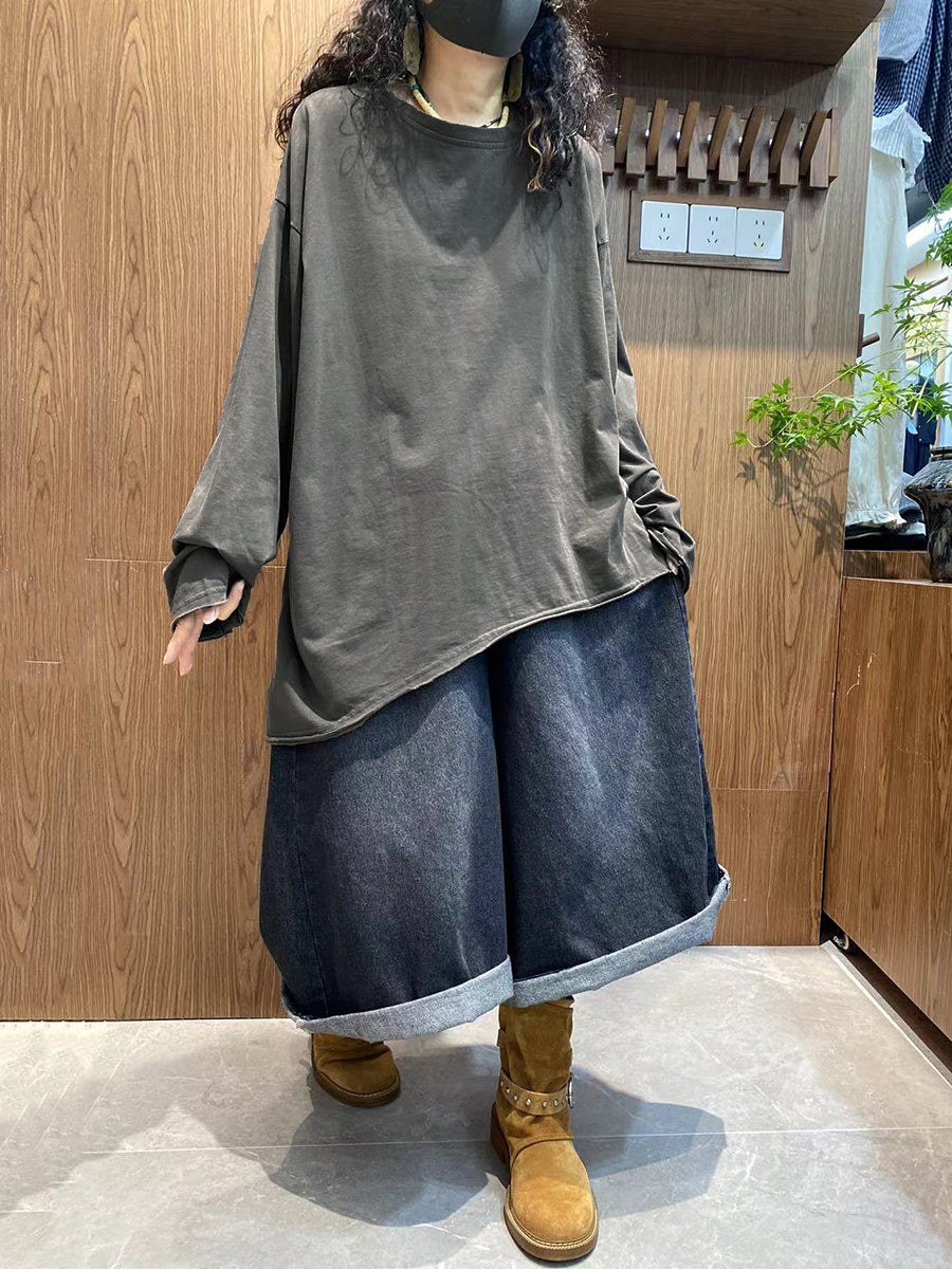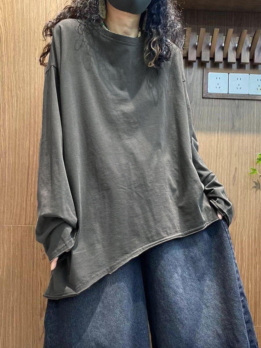 Plus Size Women Autumn Casual Pure Color 100%Cotton O-Neck Shirt