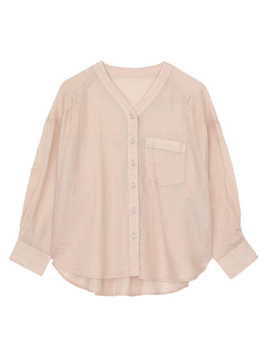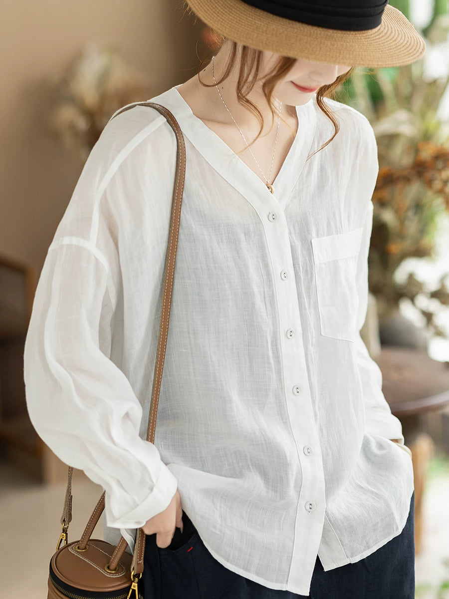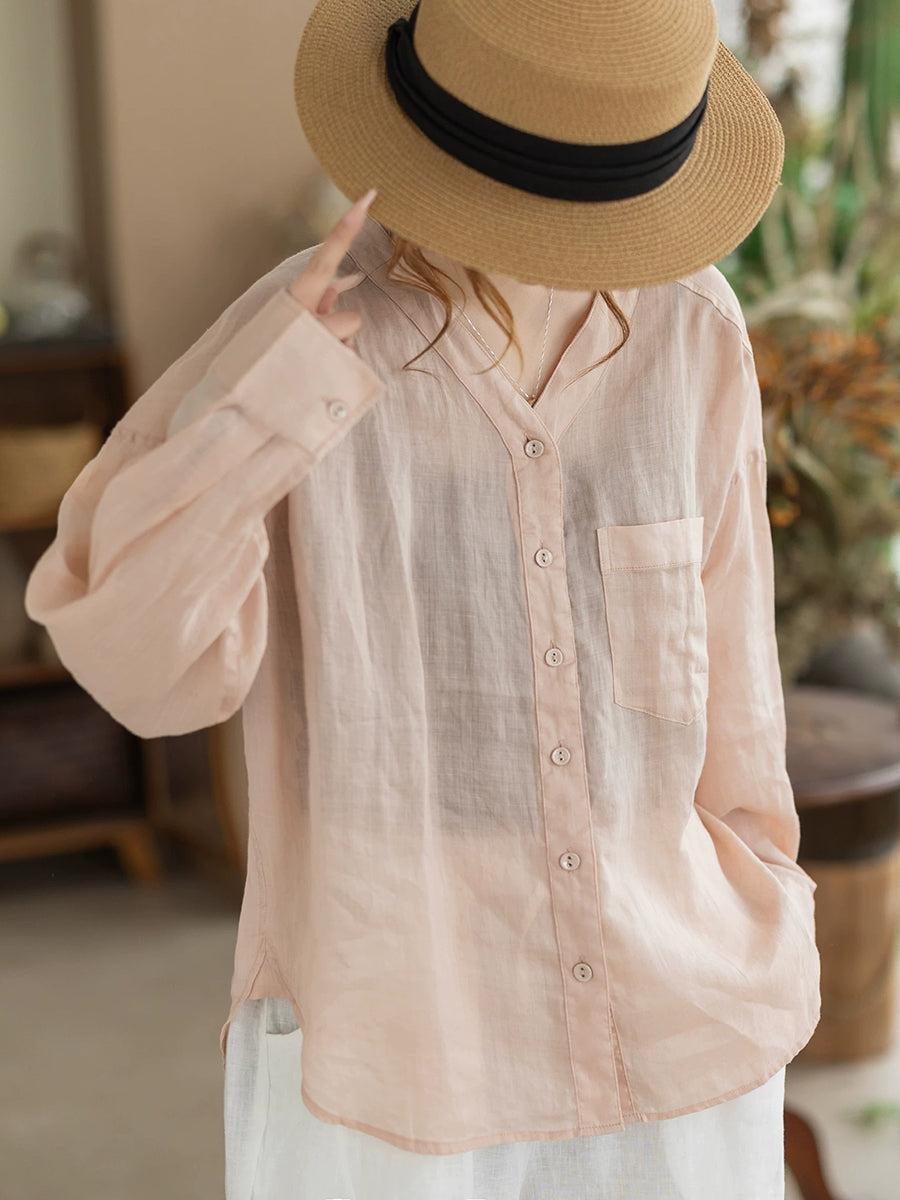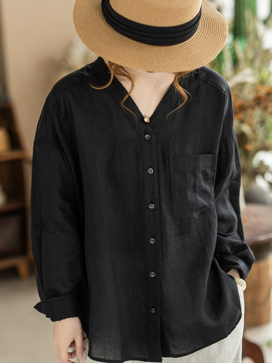 Women Summer Artsy Pure Color V-Neck 100%Ramie Shirt