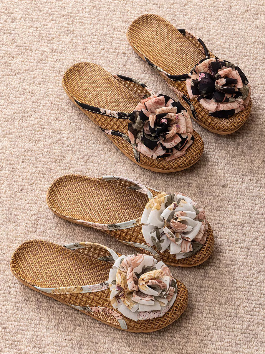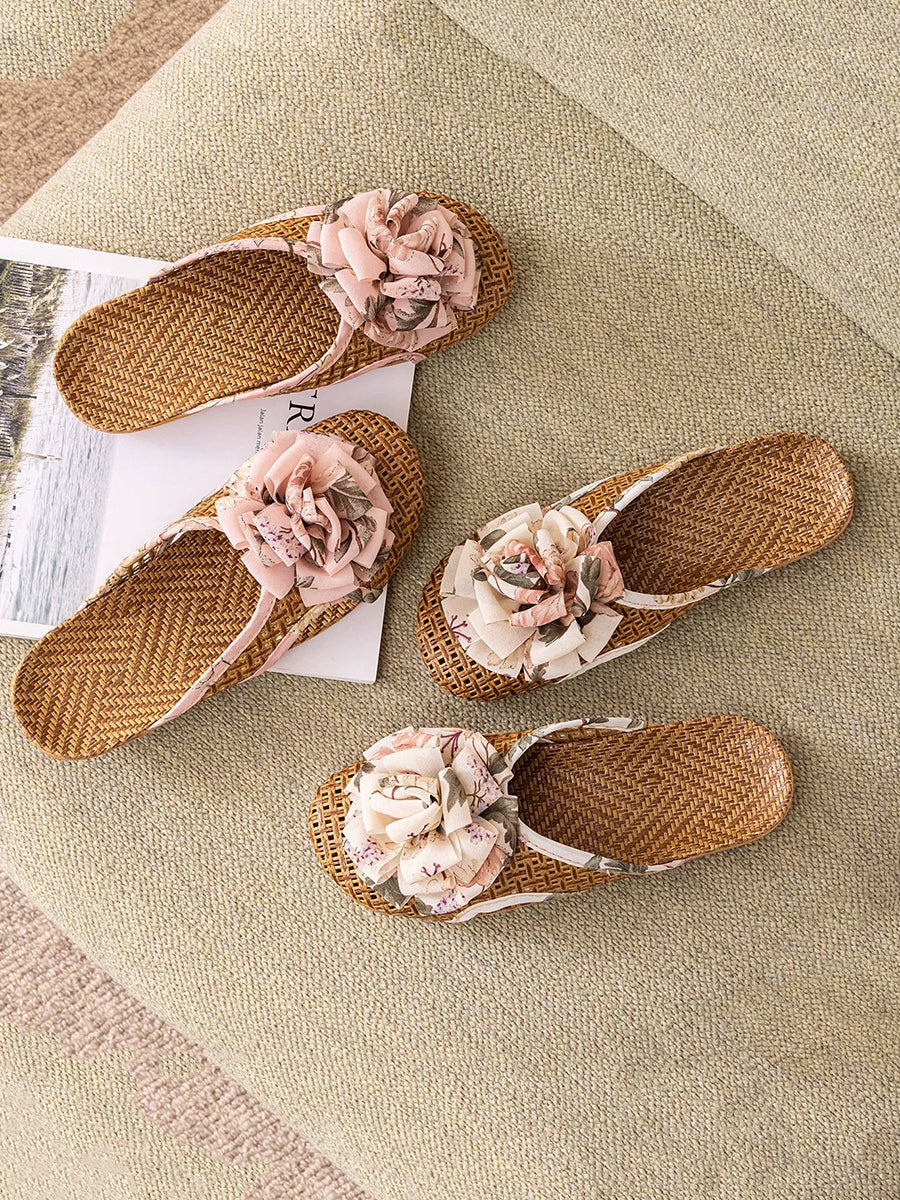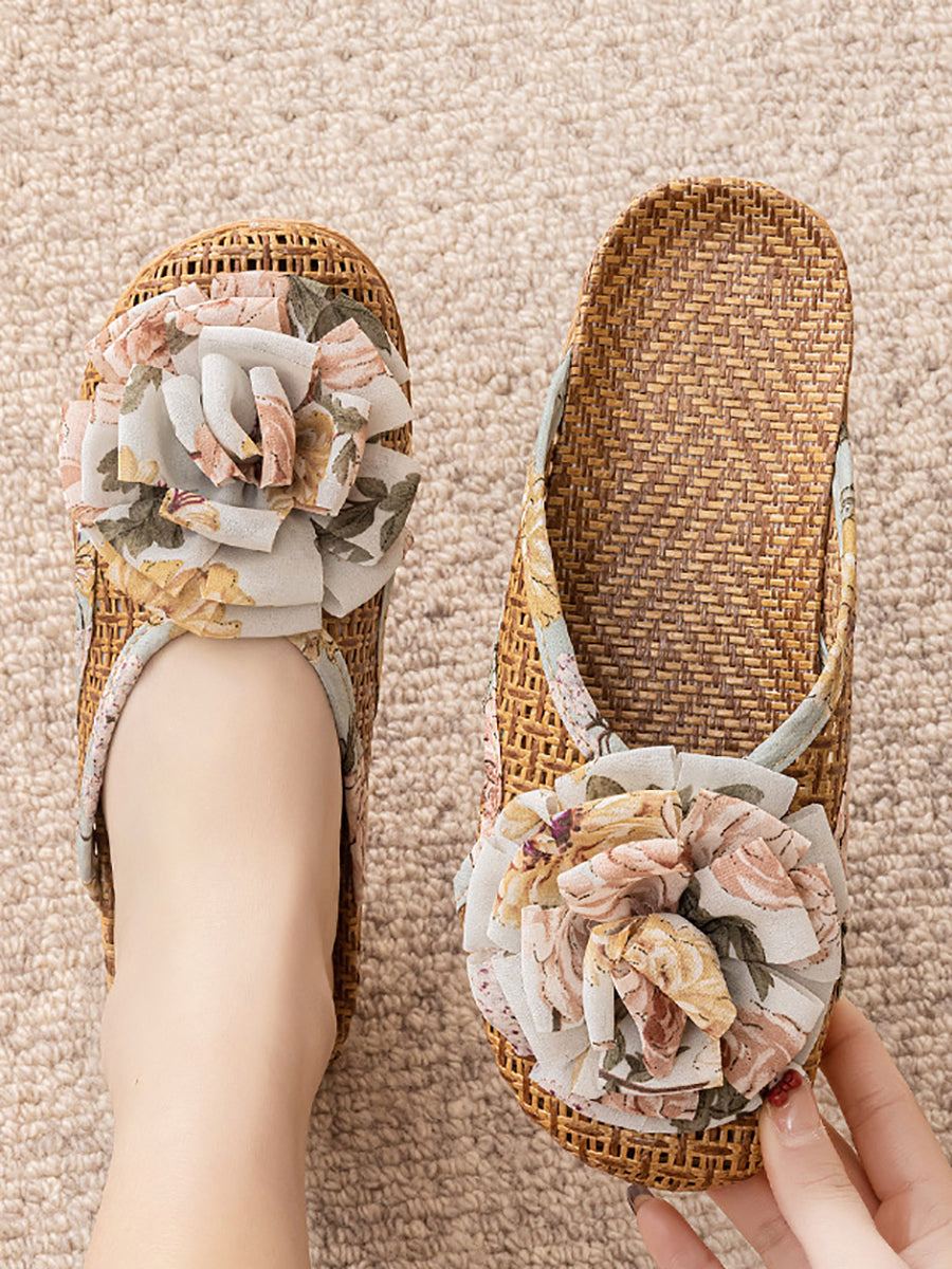 Women Summer Artsy Straw Weave Flower Slippers