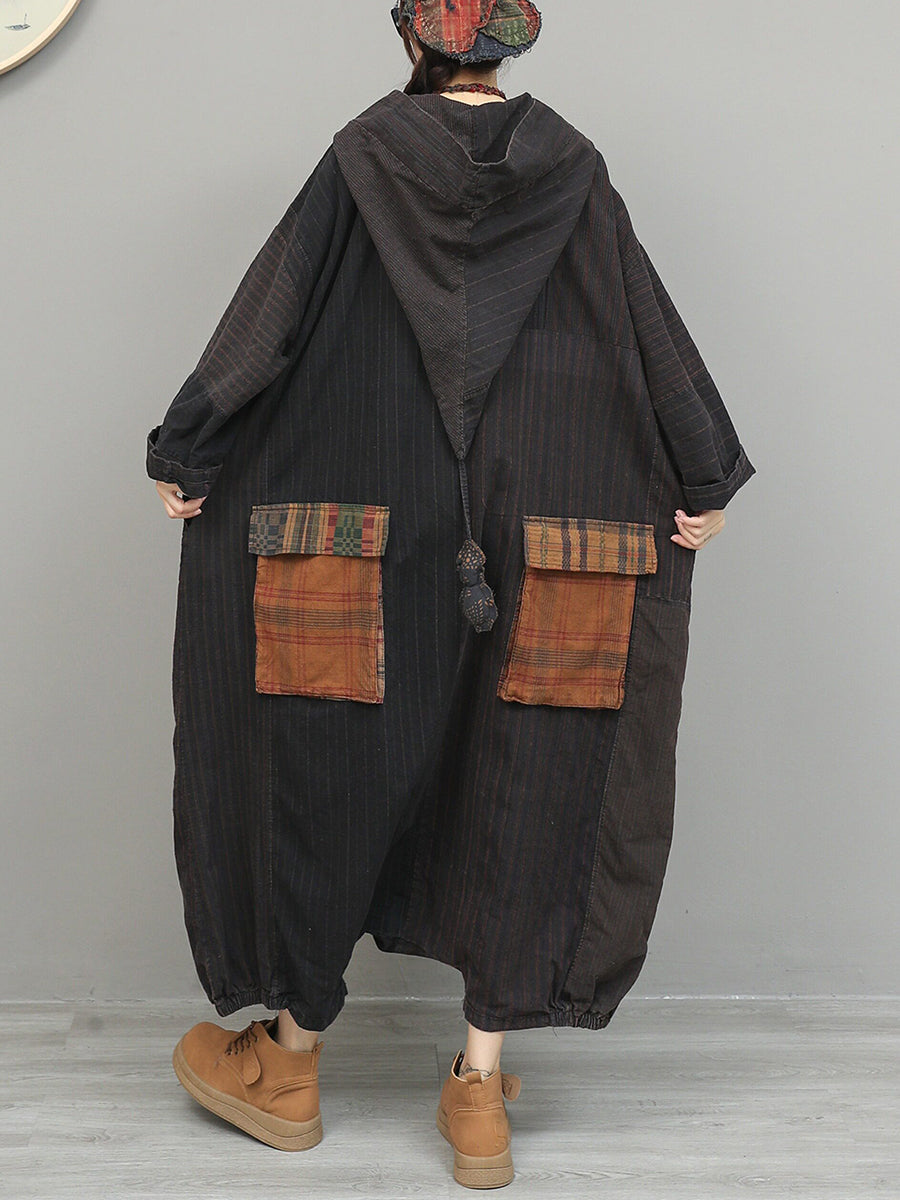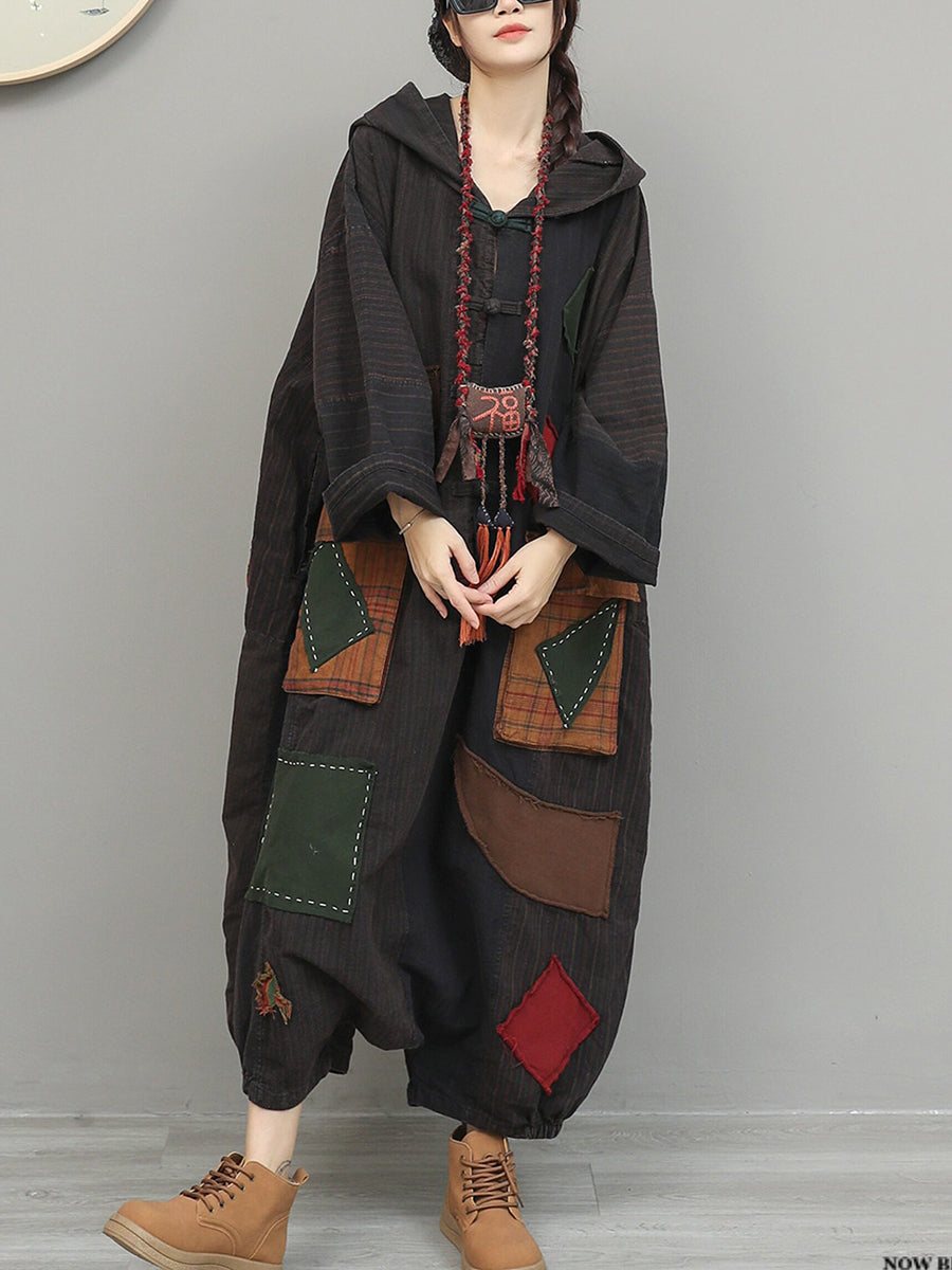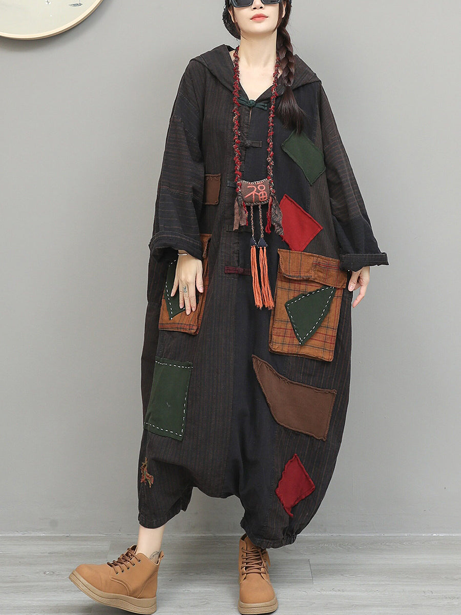 Women Spring Retro Patchwork Low Crotch Hooded Jumpsuits