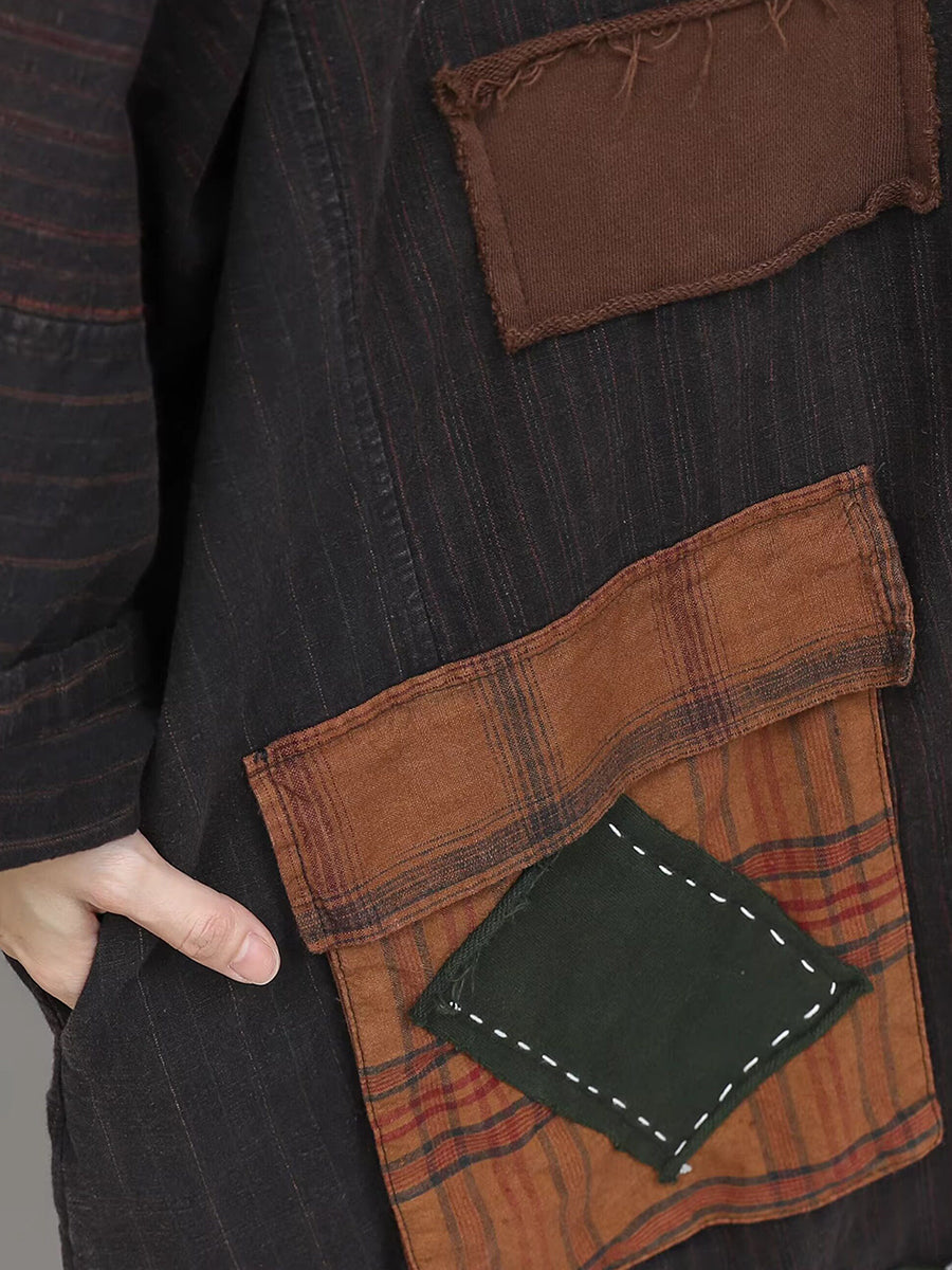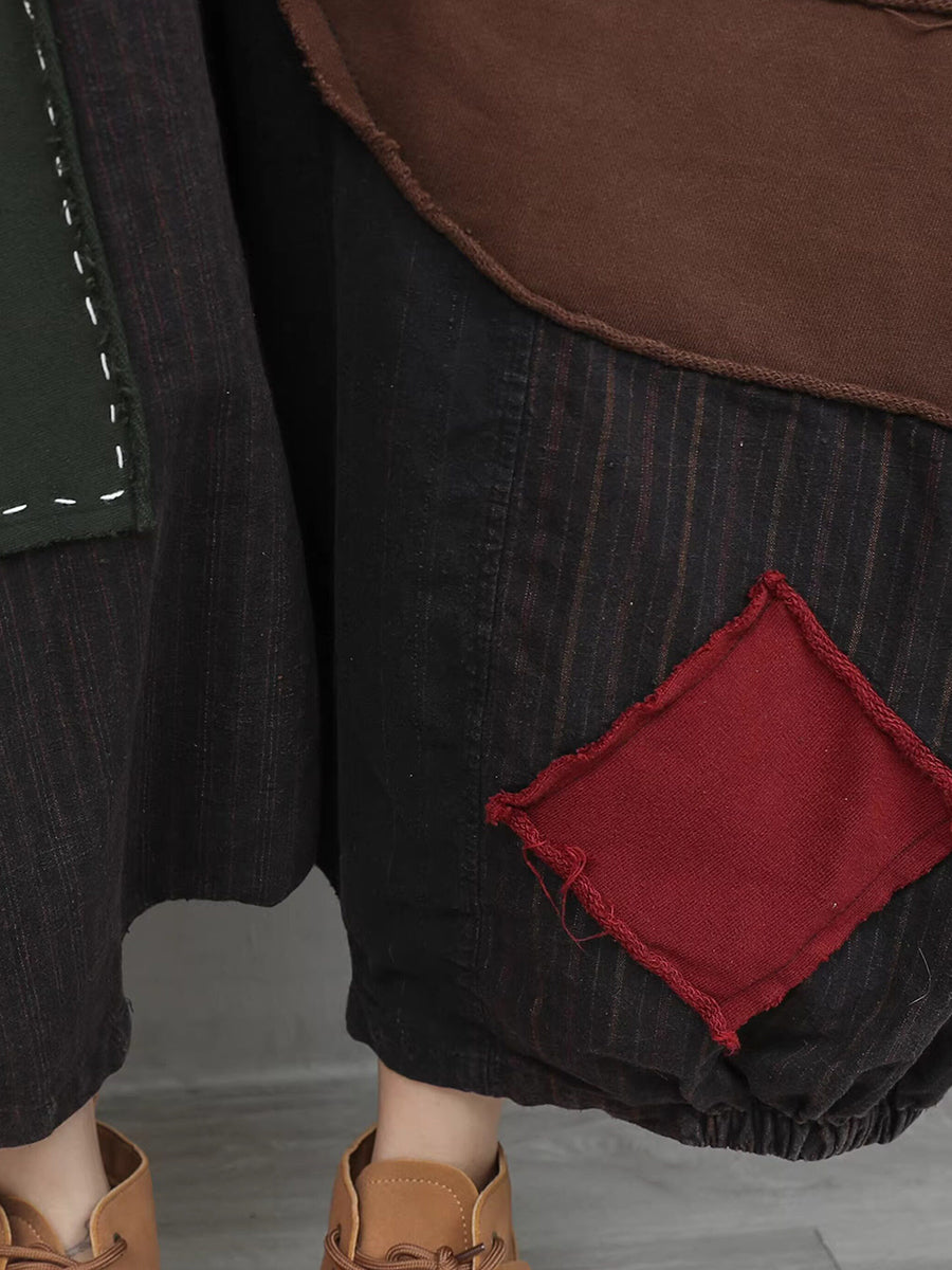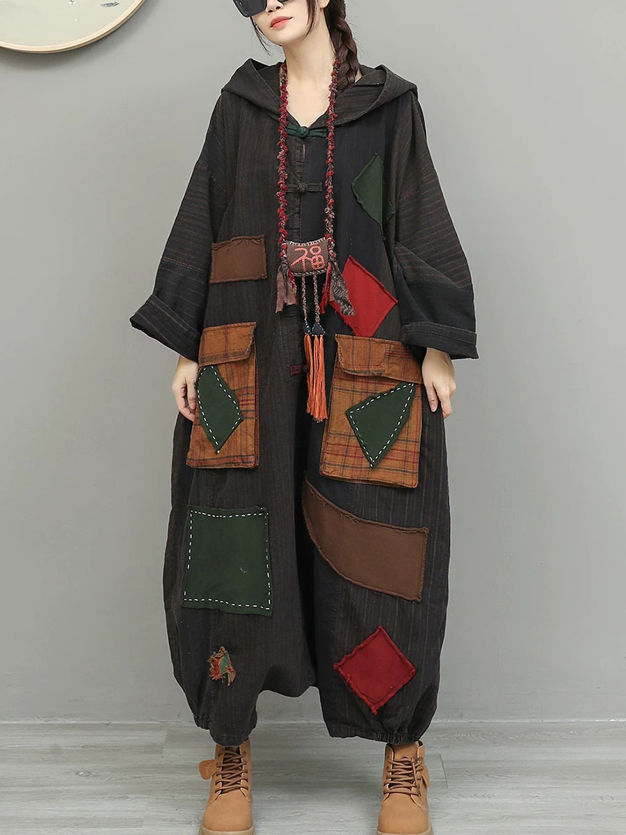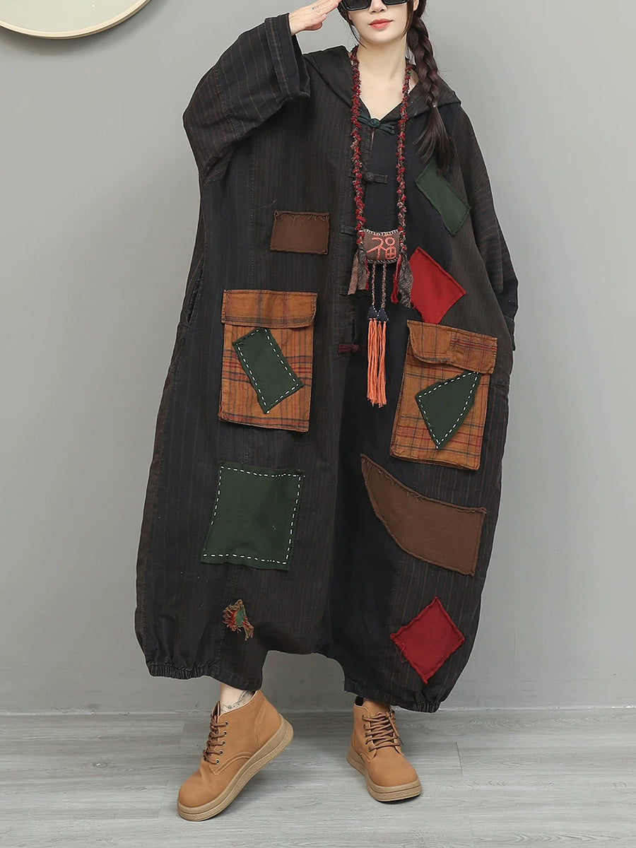 Women Spring Retro Patchwork Low Crotch Hooded Jumpsuits