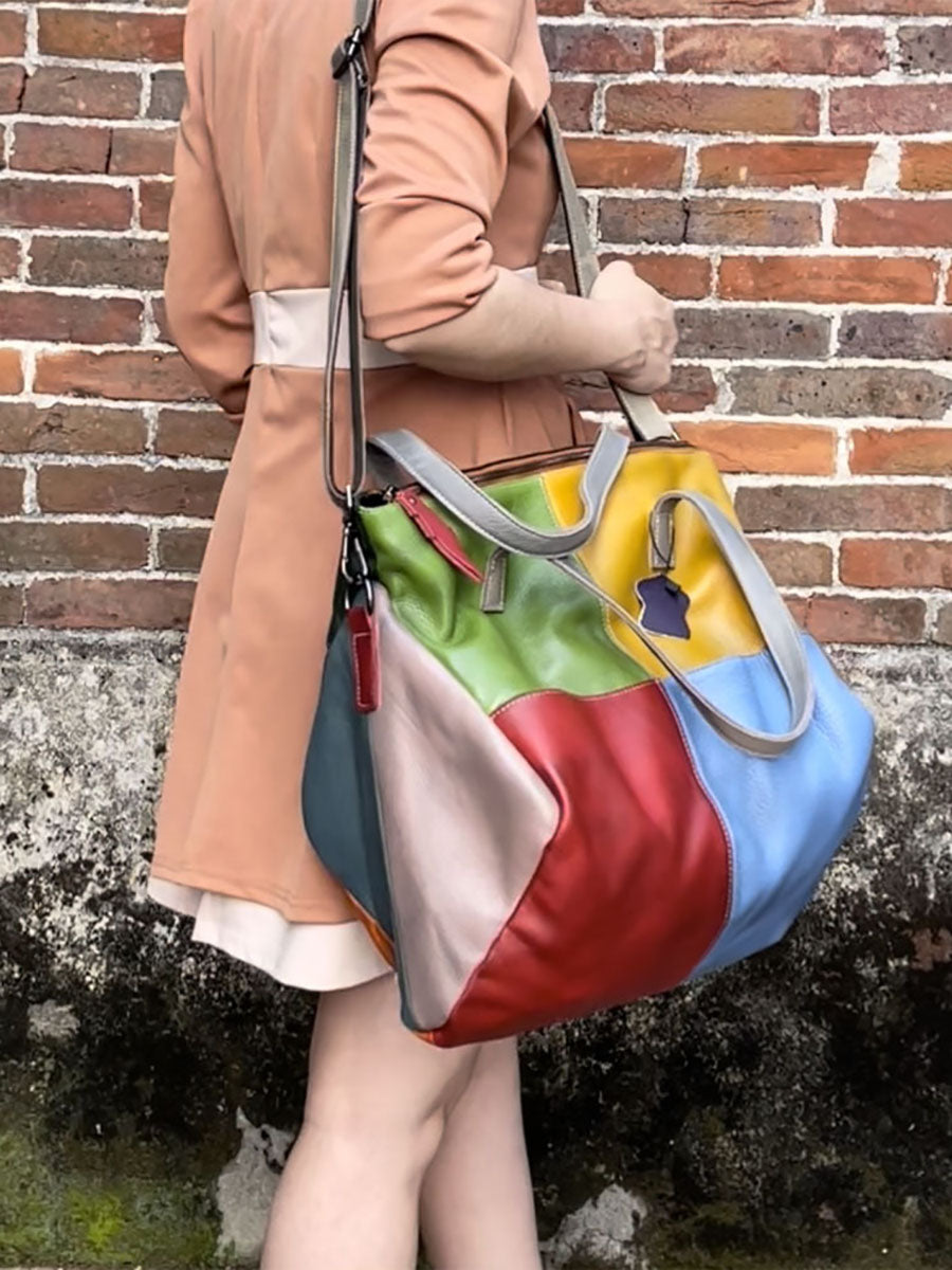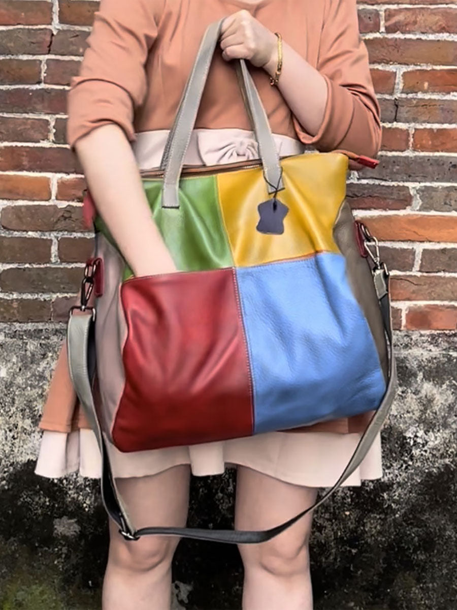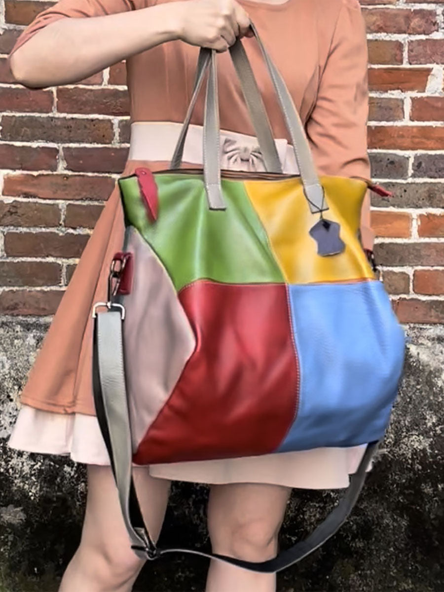 Retro Leather Colorblock Spliced Large Capacity Crossbody Bag