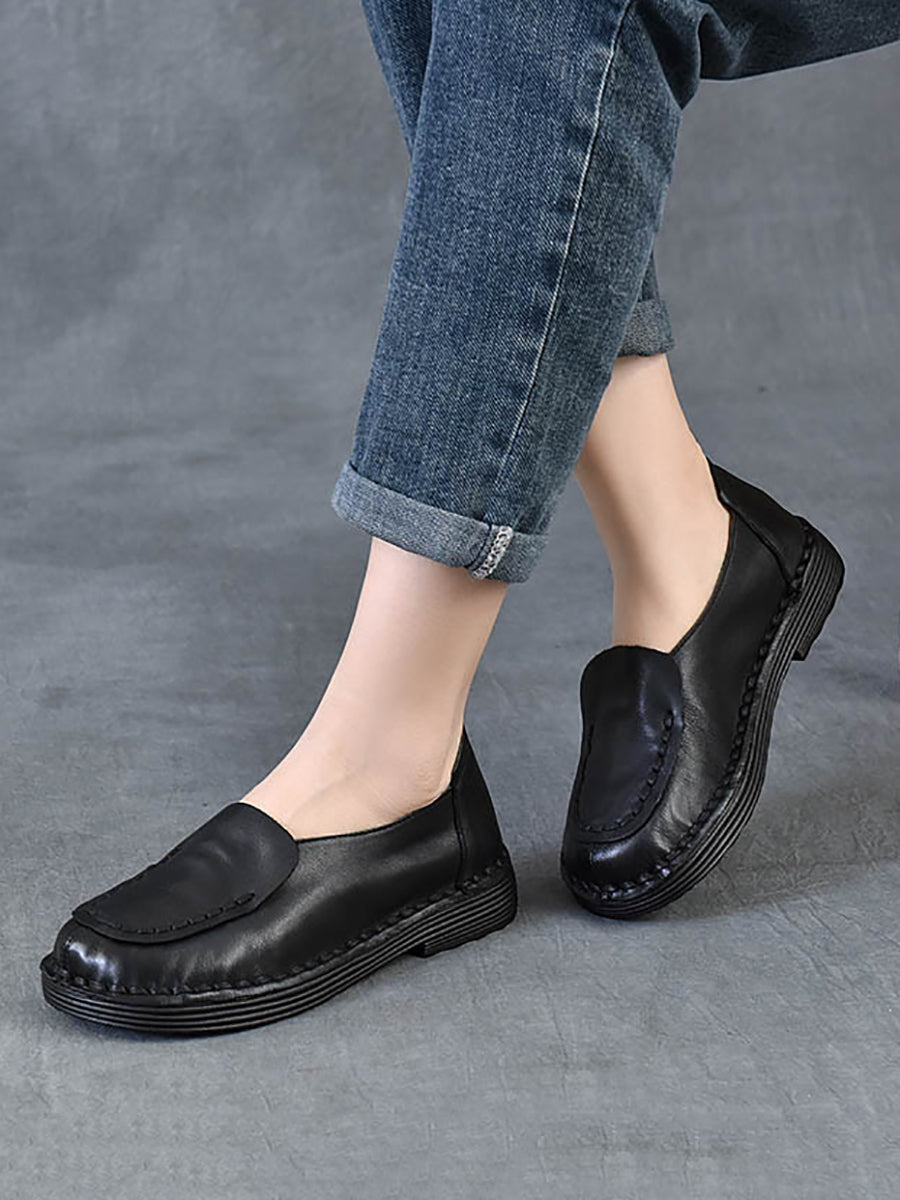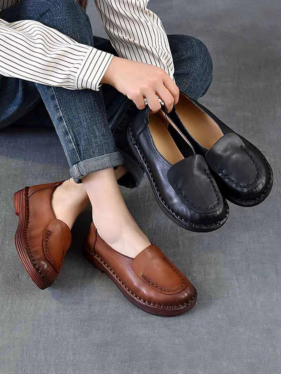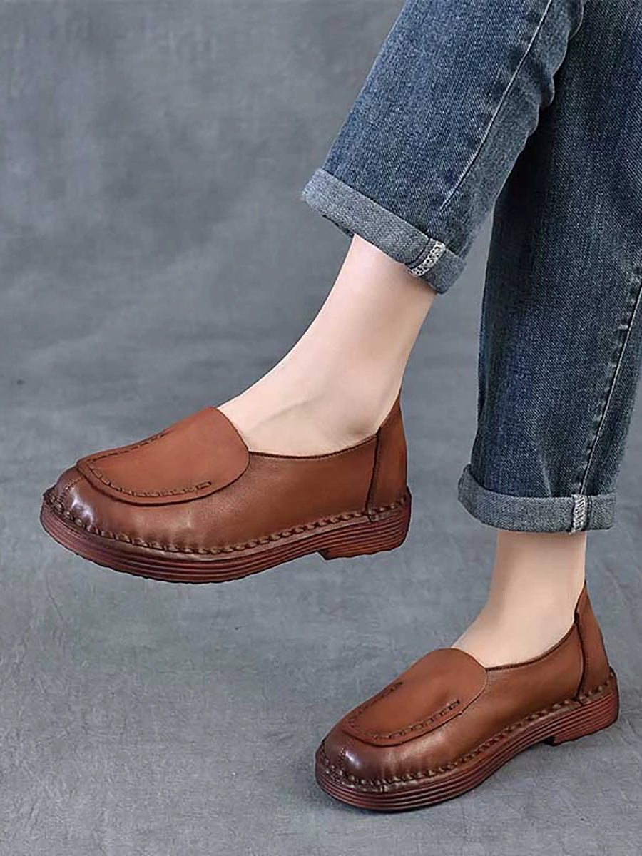 Women Spring Retro Genuine Leather Spliced Low Heel Shoes