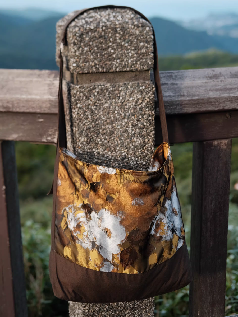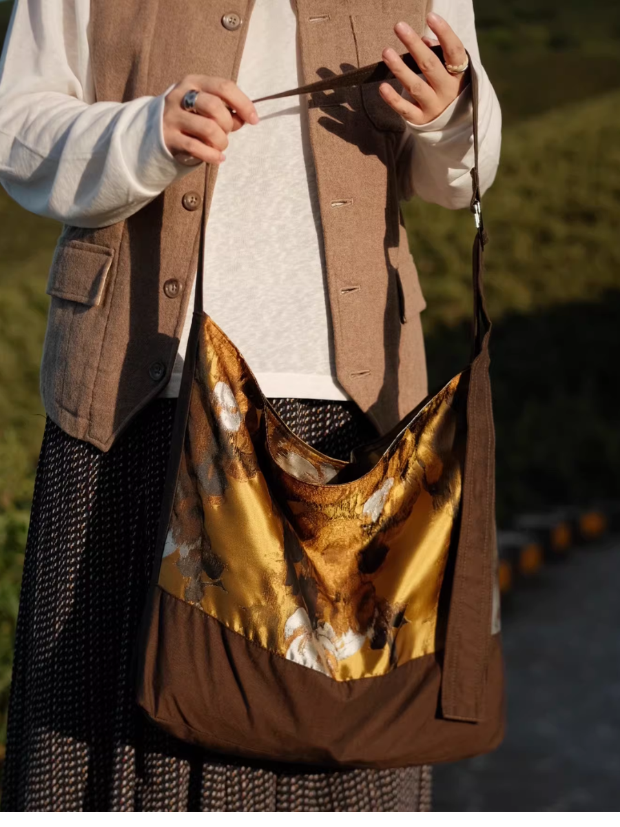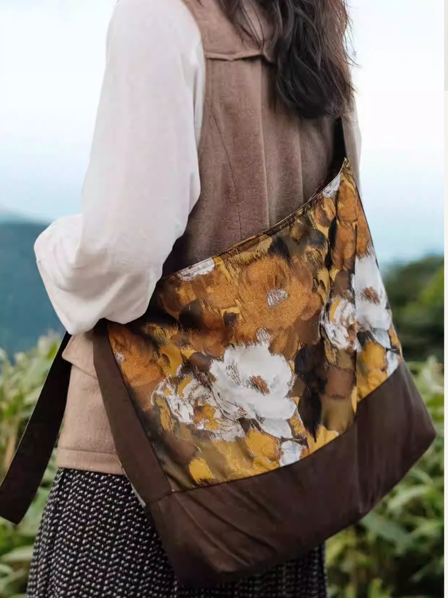 Brown Floral Painting Spliced Crossbody Bag