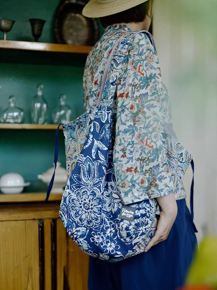 Retro Blue Floral Spliced Shoulder Bag