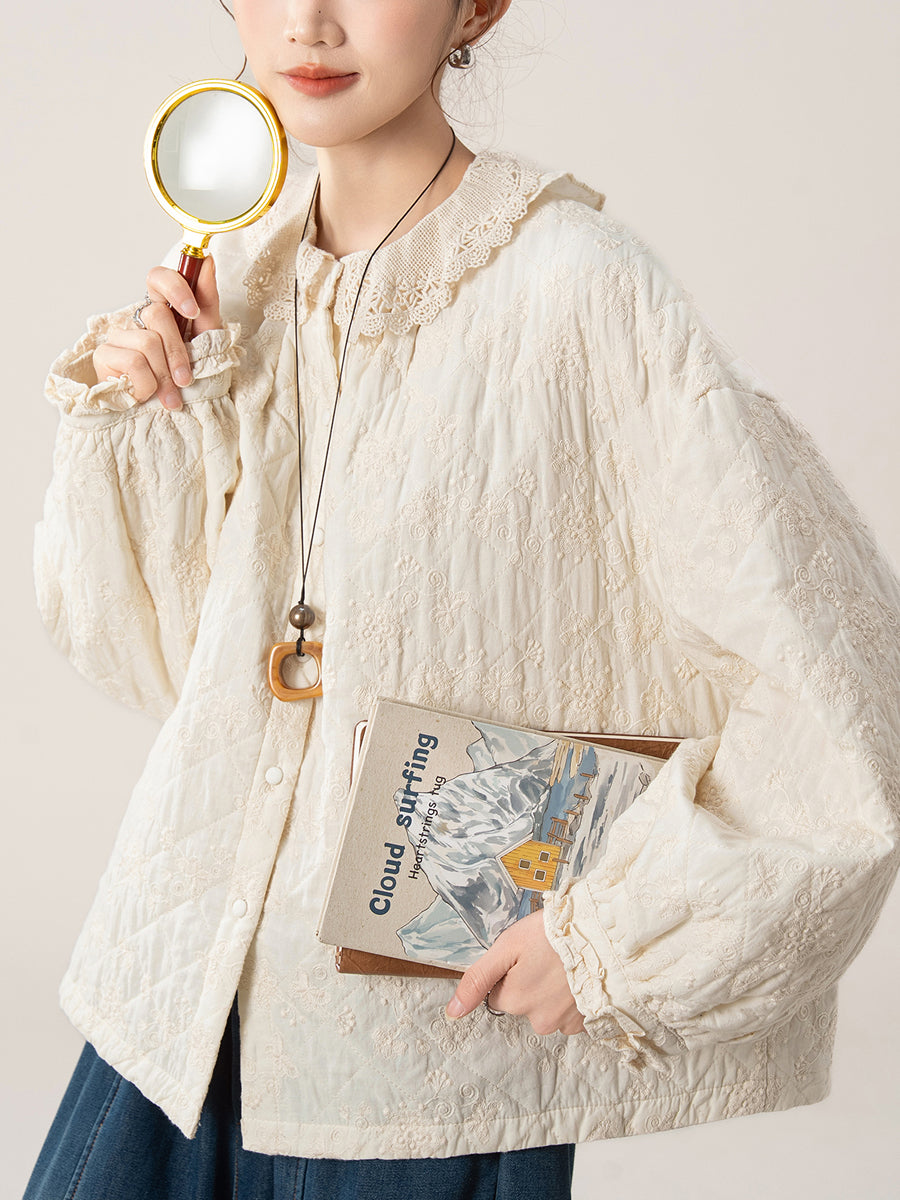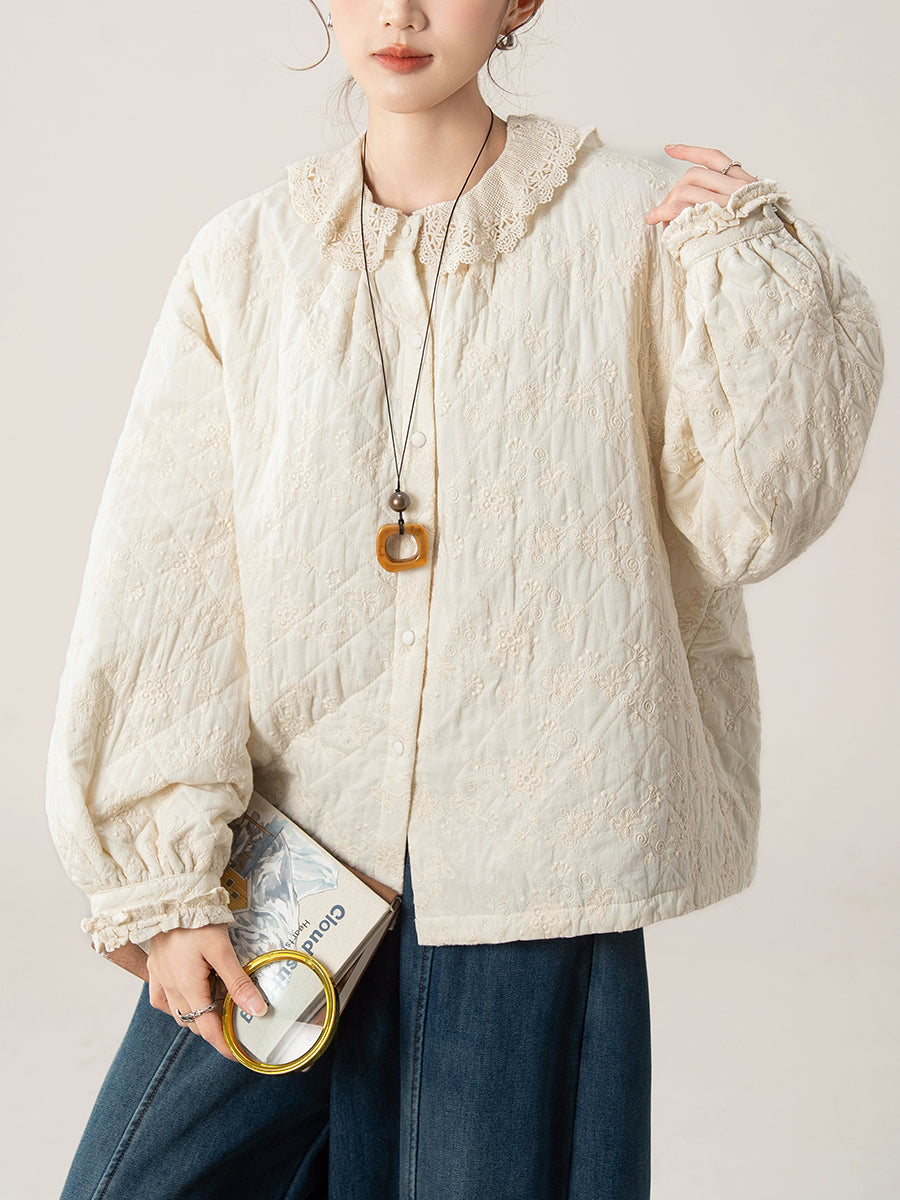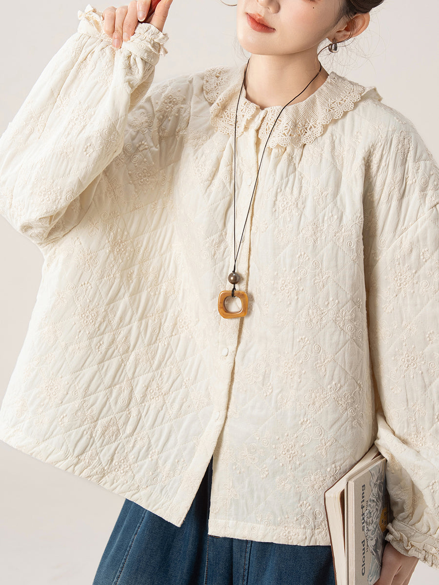Women Artsy Autumn Embroidery Lace Collar Shirt