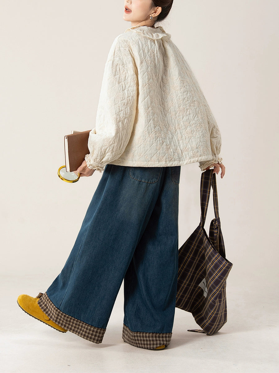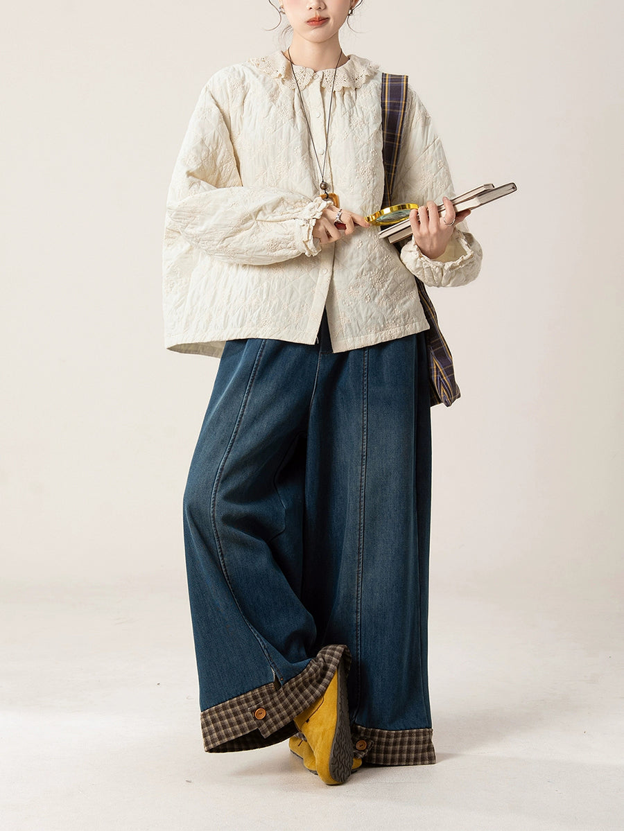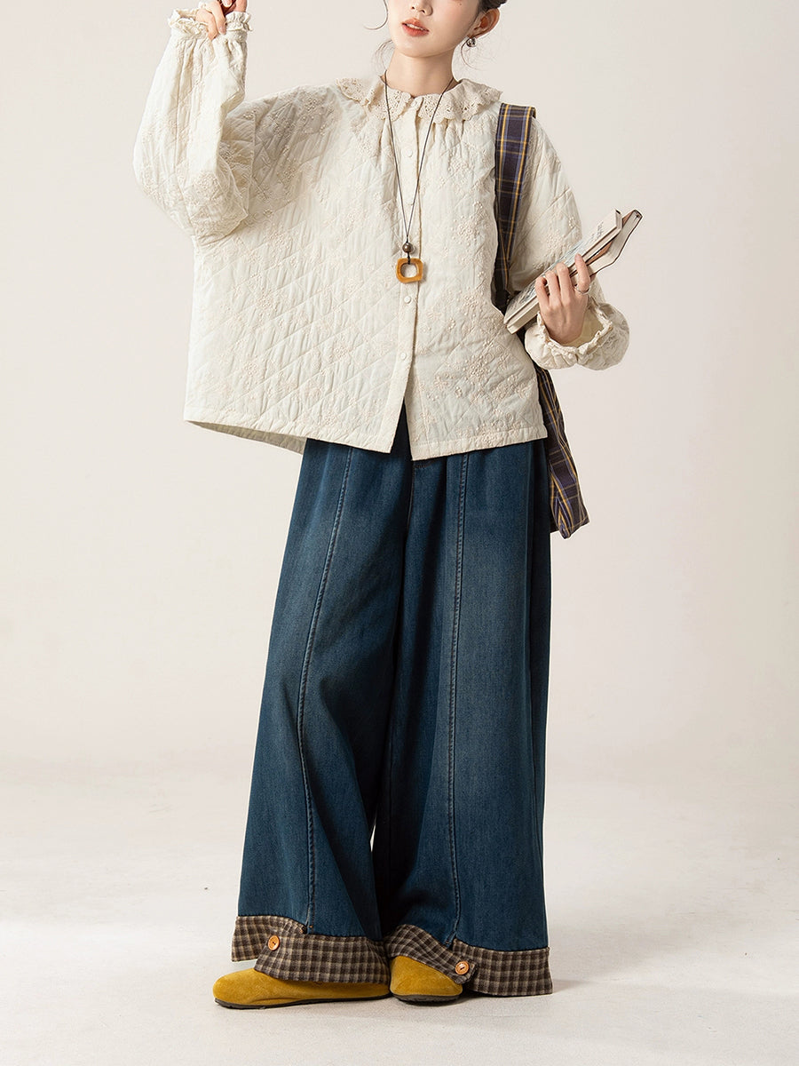 Women Artsy Autumn Embroidery Lace Collar Shirt