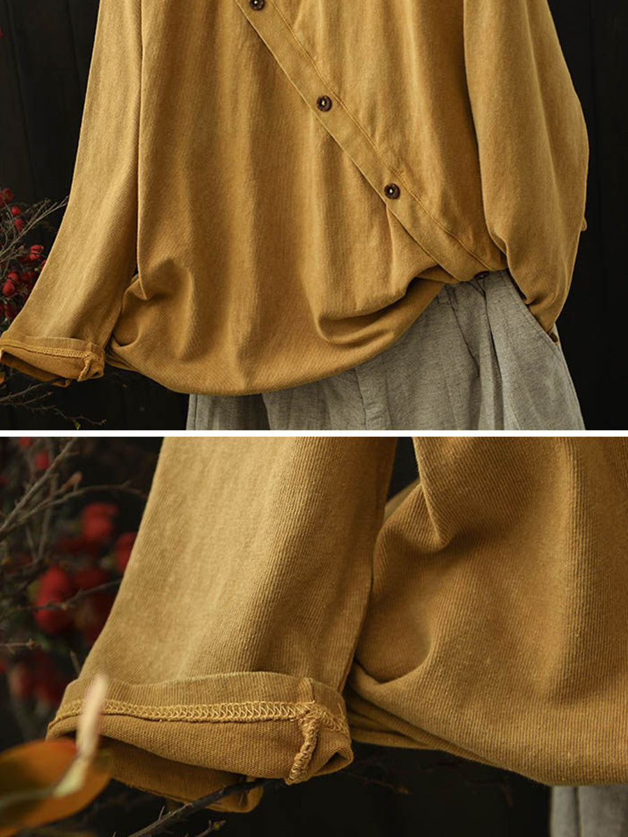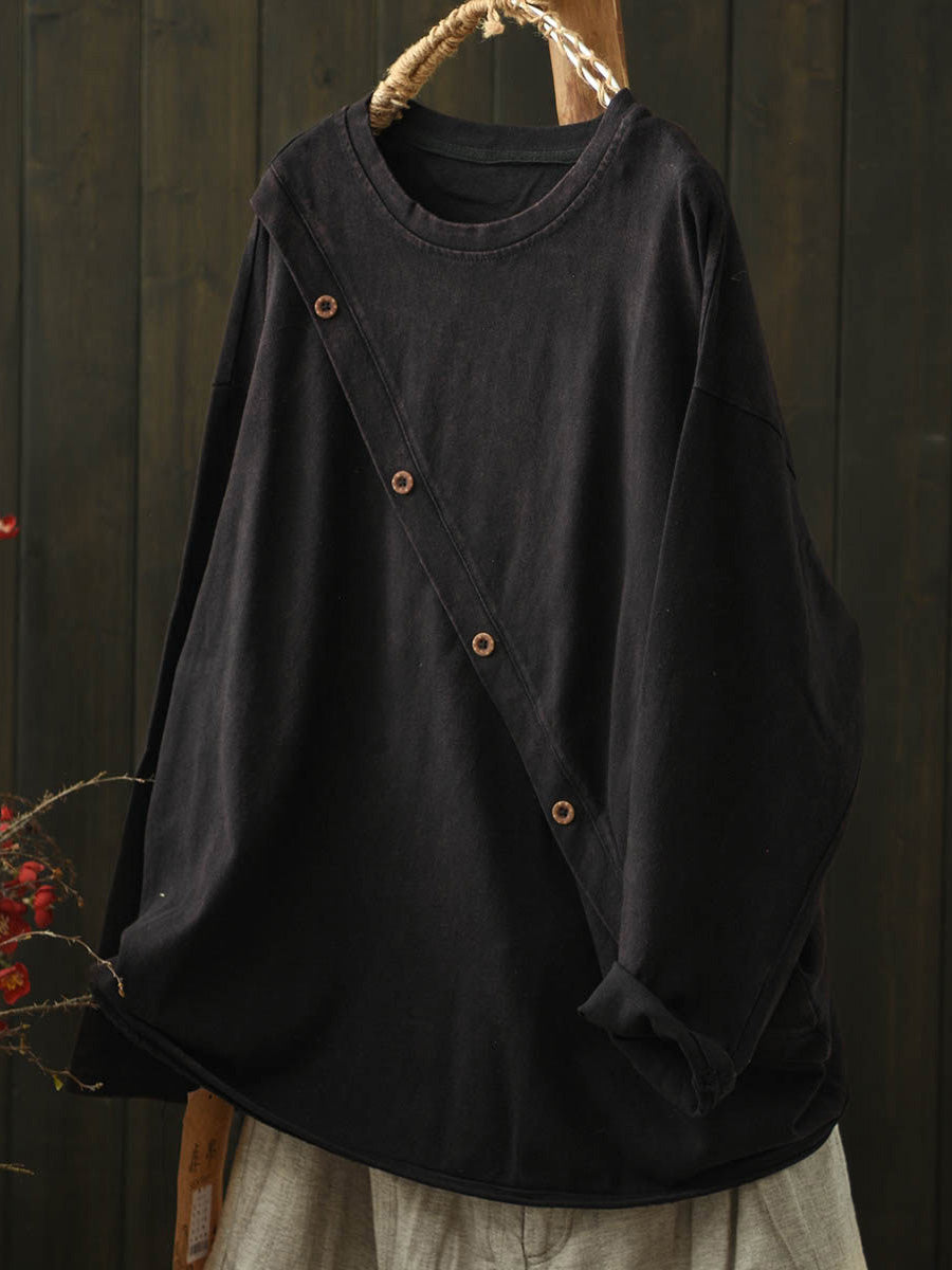 Women Artsy Autumn Slanted Button O-Neck Cotton Blouse
