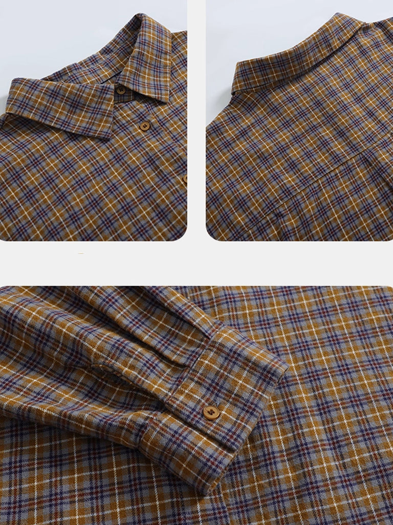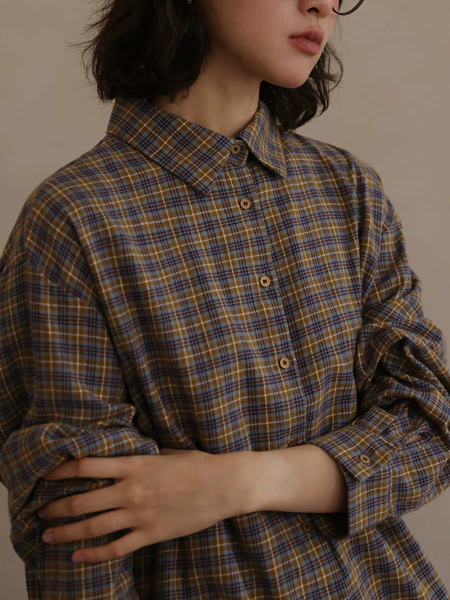 Women Artsy Plaid 100%Cotton Turn-down Collar Shirt