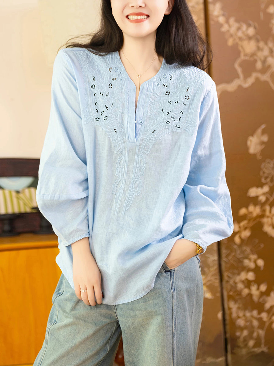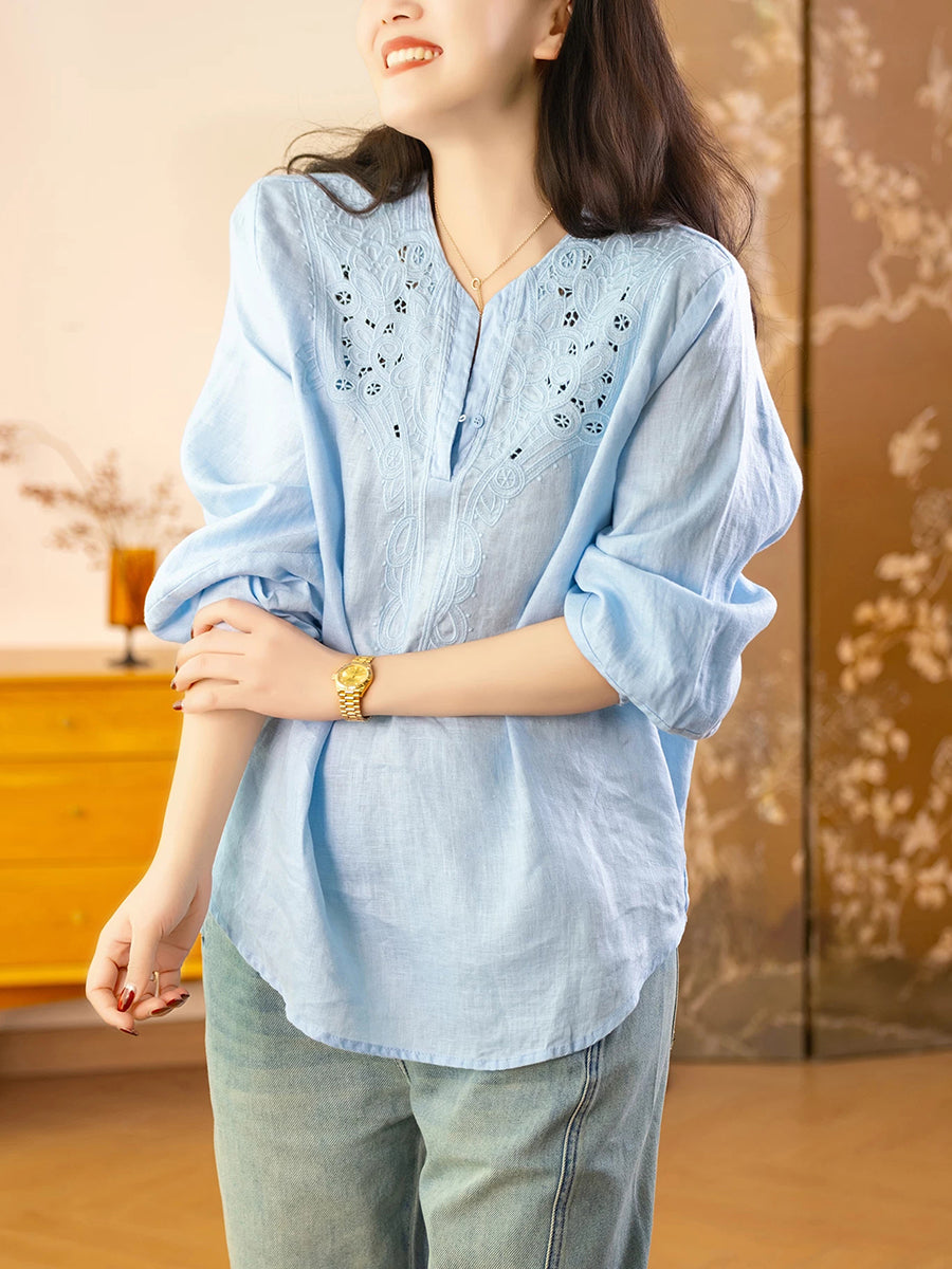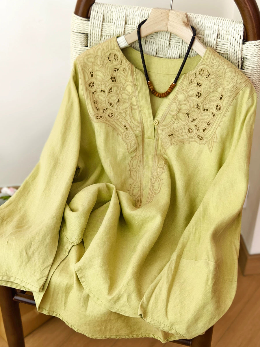 Women Artsy Spring Embroidery V-Neck 100%Linen Blouse
