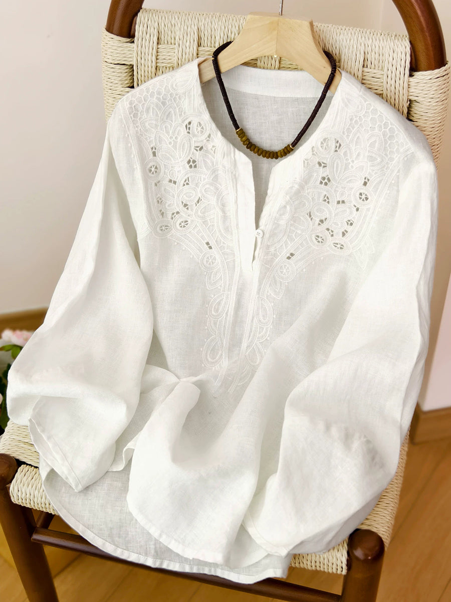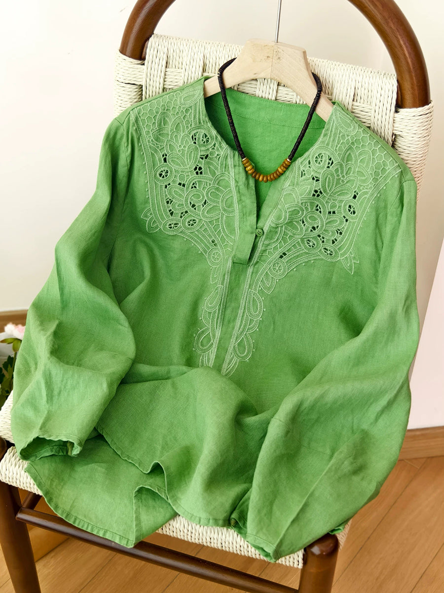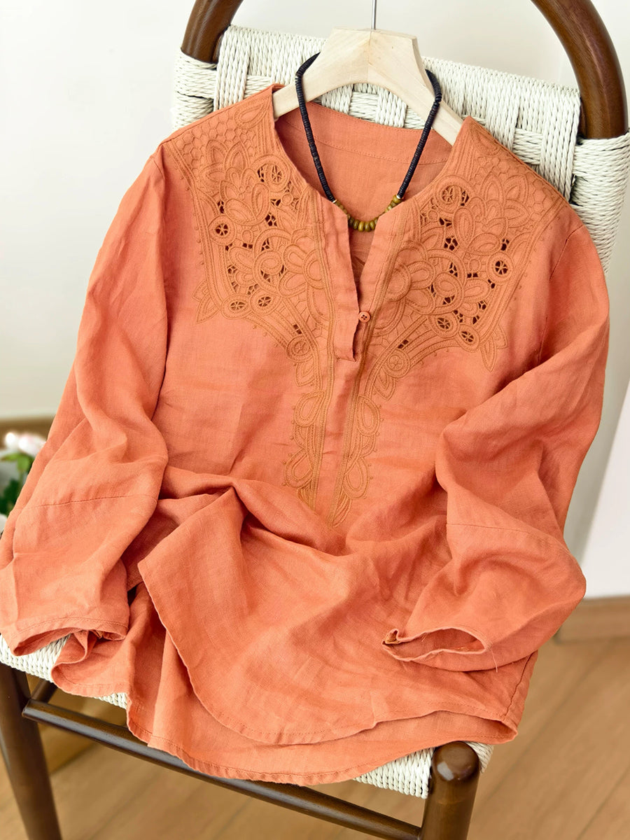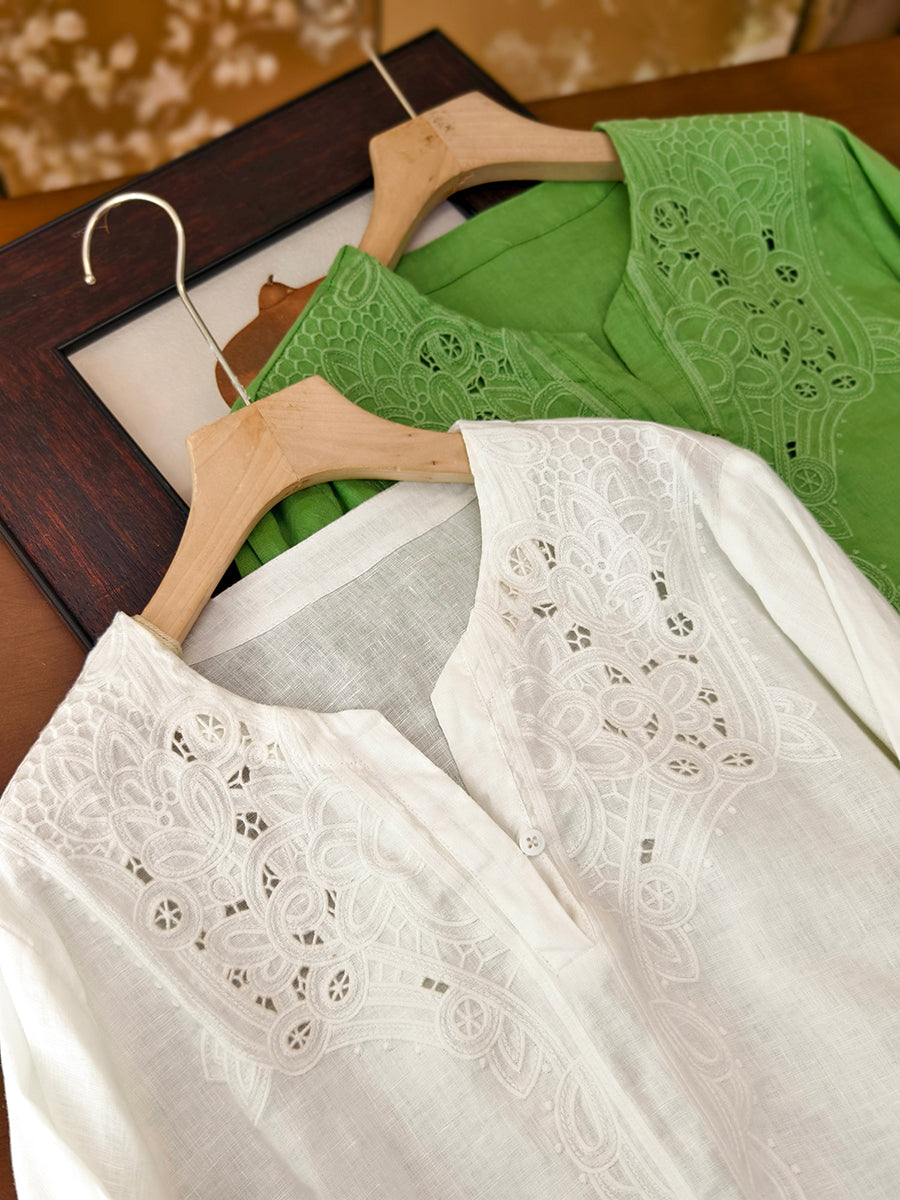 Women Artsy Spring Embroidery V-Neck 100%Linen Blouse