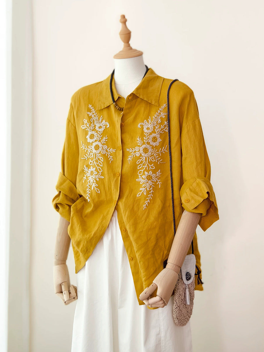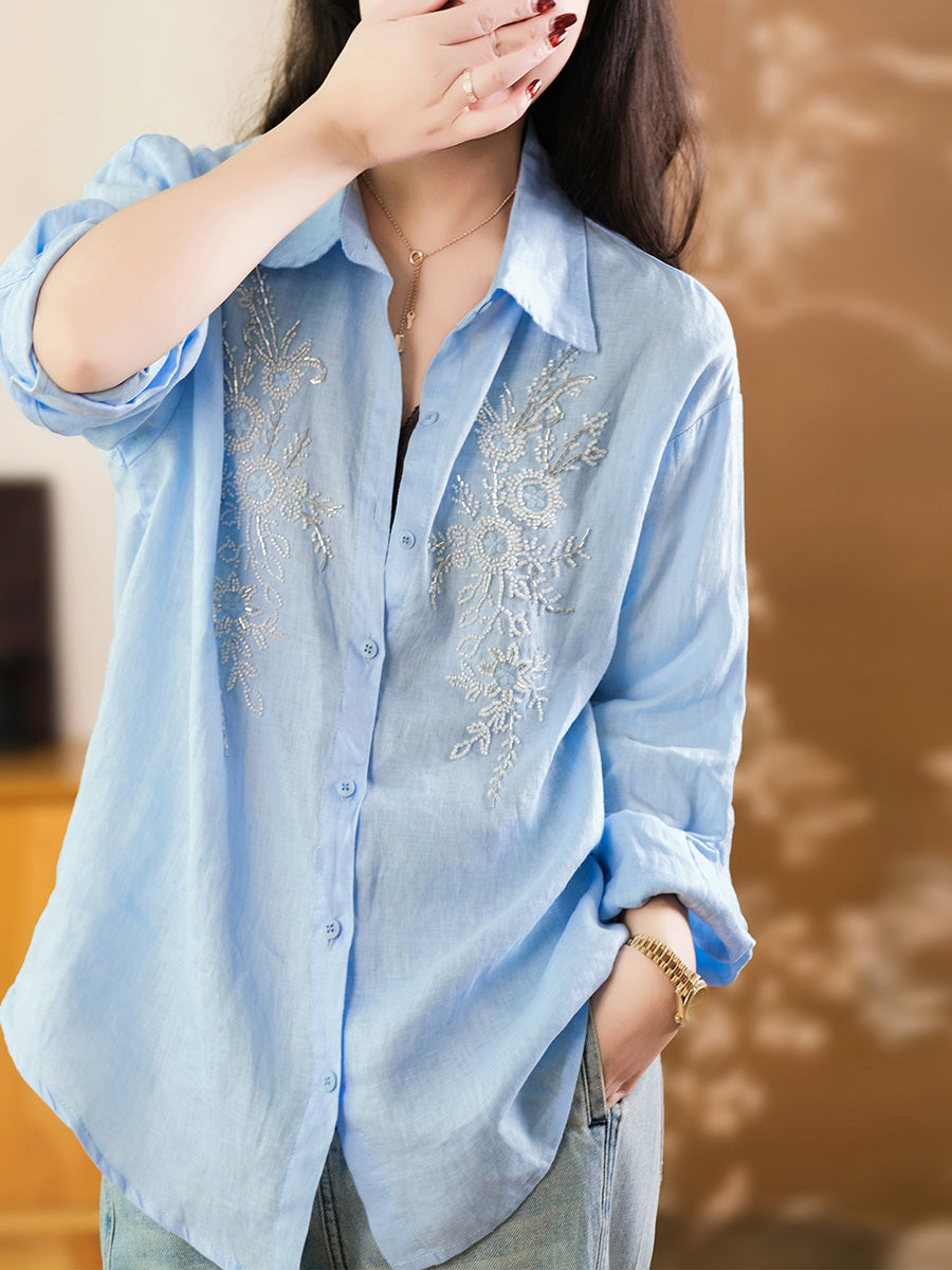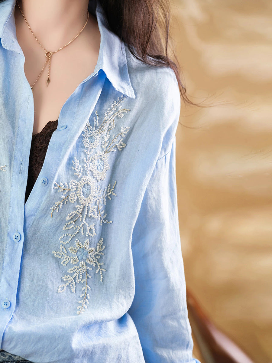 Women Artsy Summer Embroidery 100%Linen Blouse