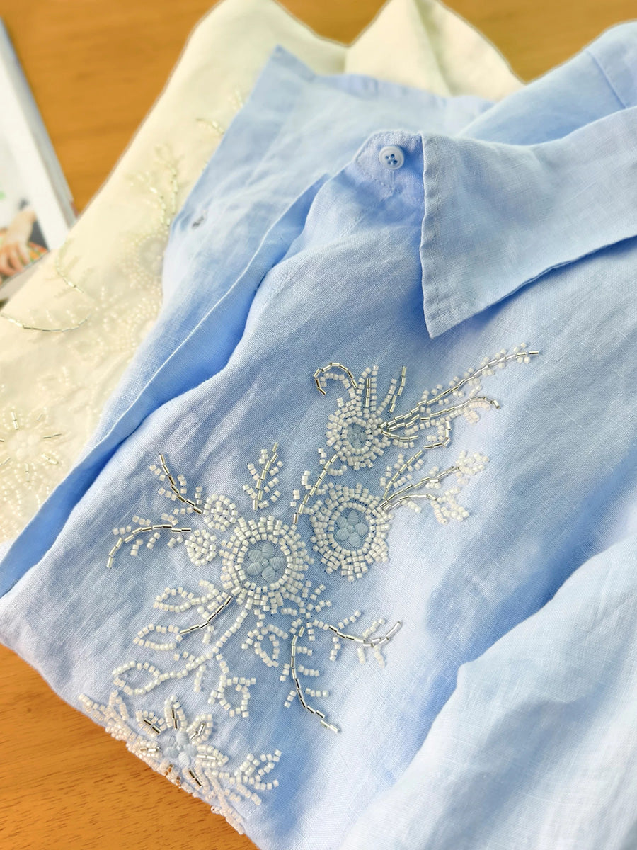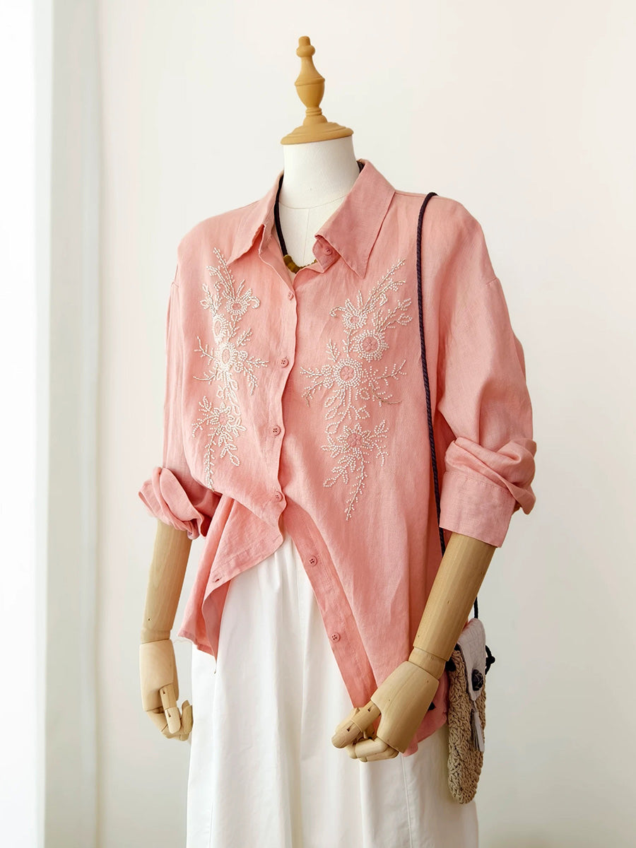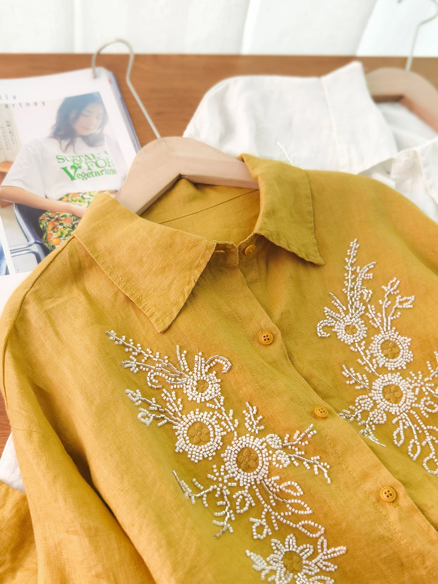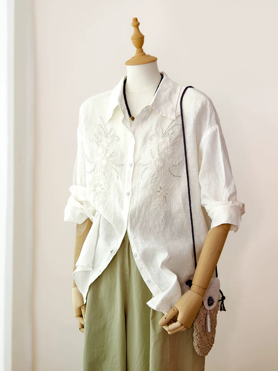 Women Artsy Summer Embroidery 100%Linen Blouse