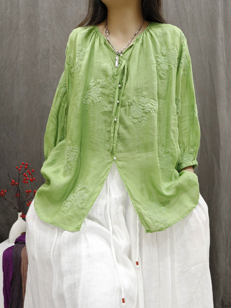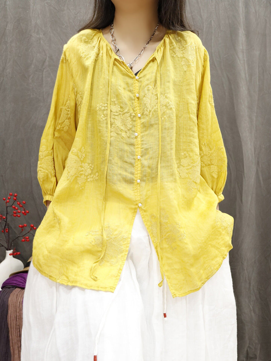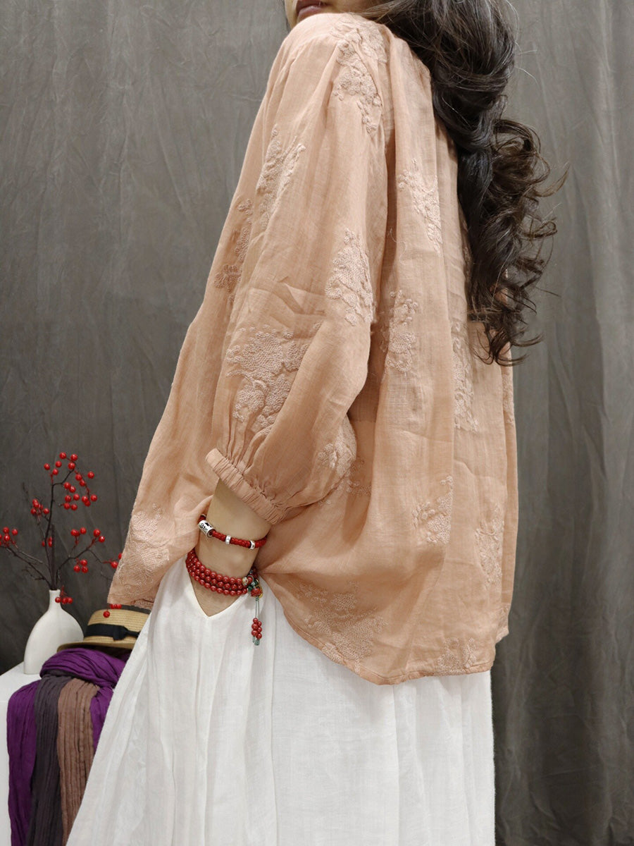 Women Artsy Summer Embroidery V-Neck 100%Ramie Blouse