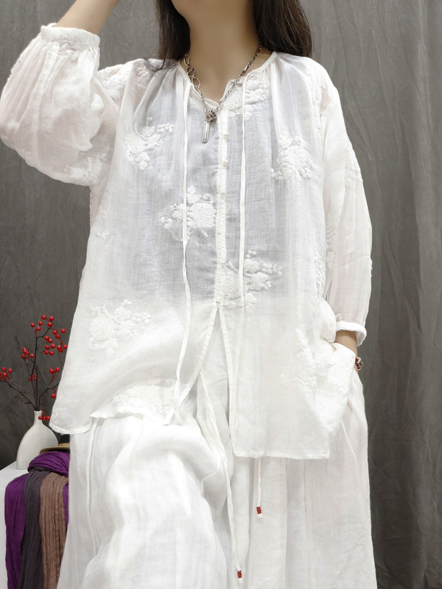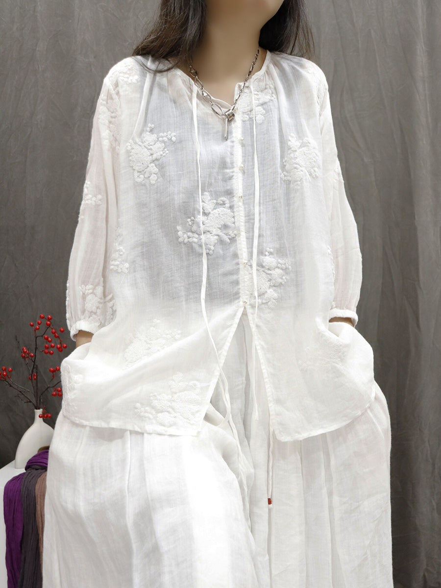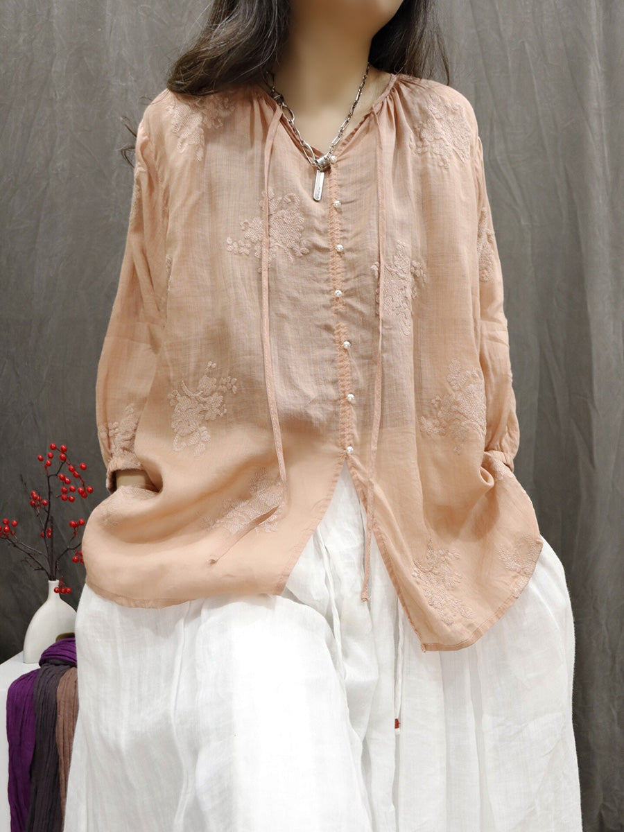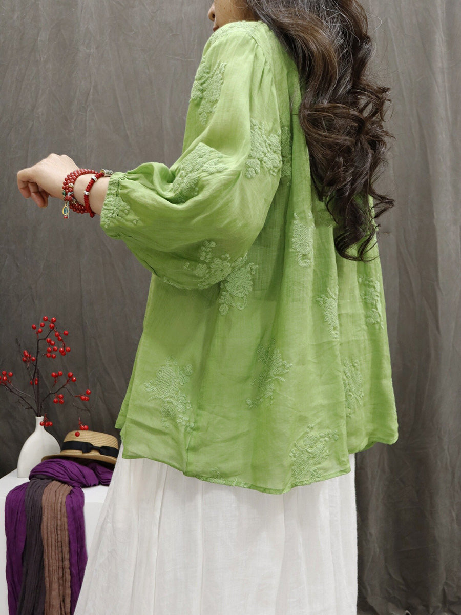 Women Artsy Summer Embroidery V-Neck 100%Ramie Blouse