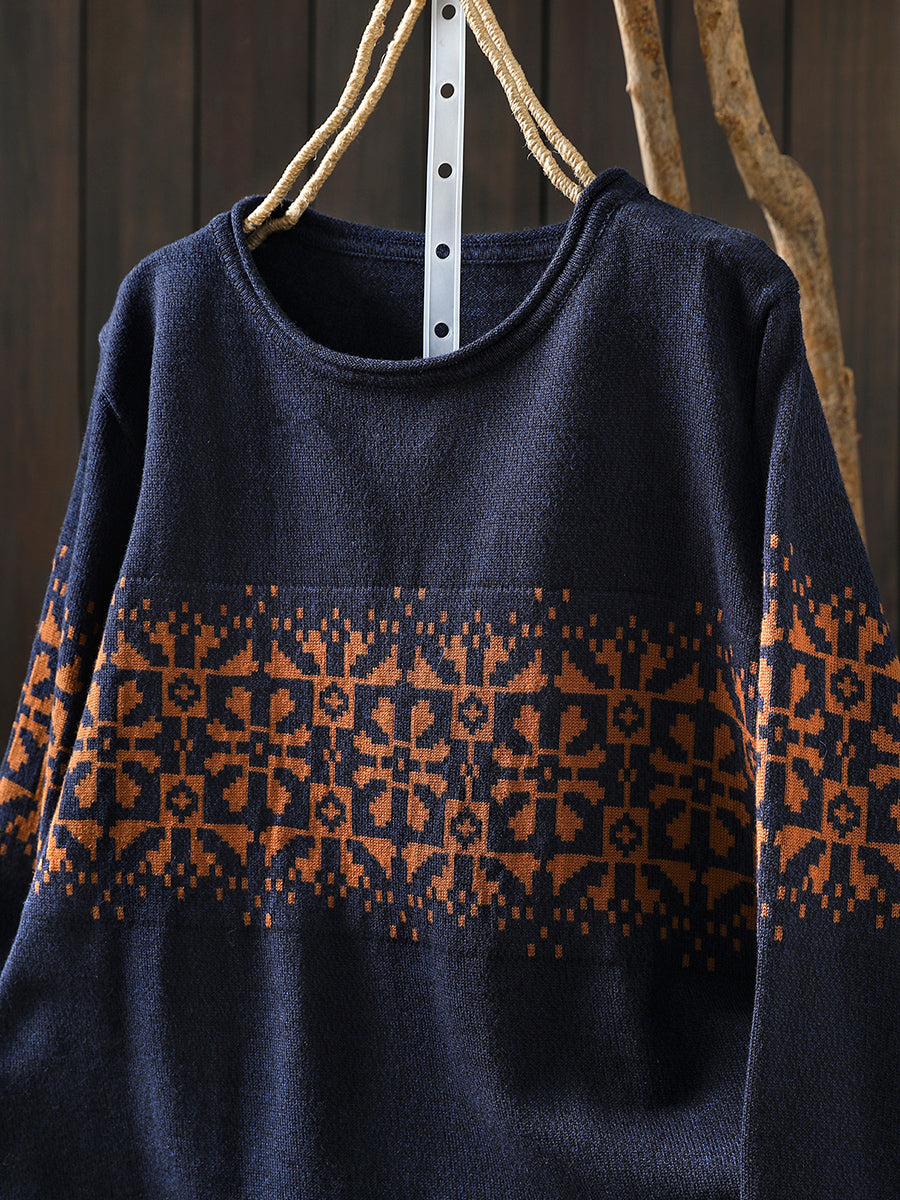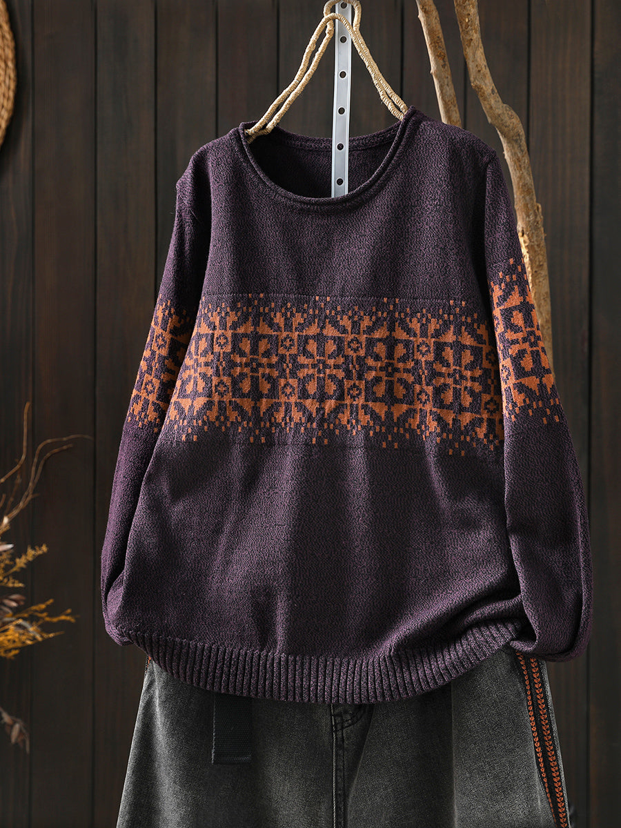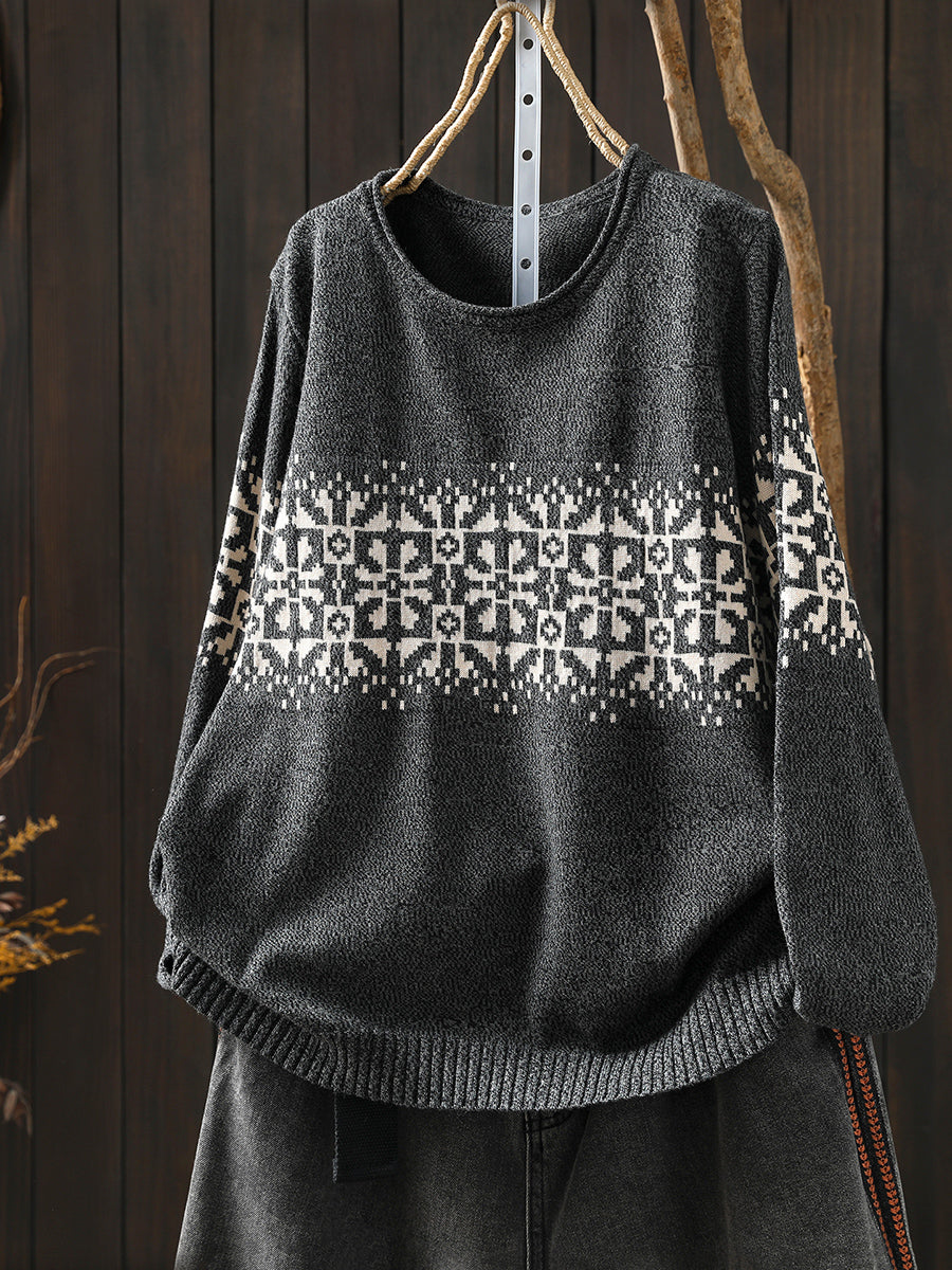 Women Autumn Artsy Flower Knitted O-Neck Sweater