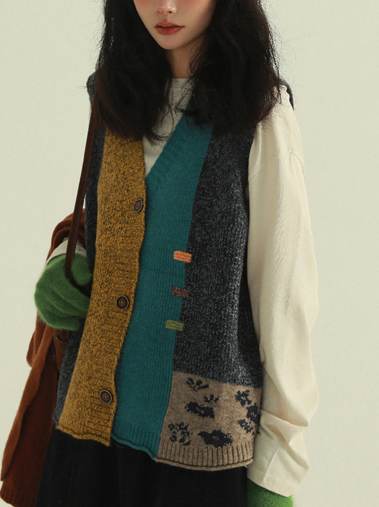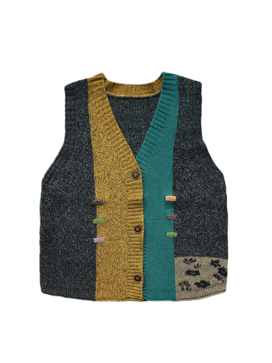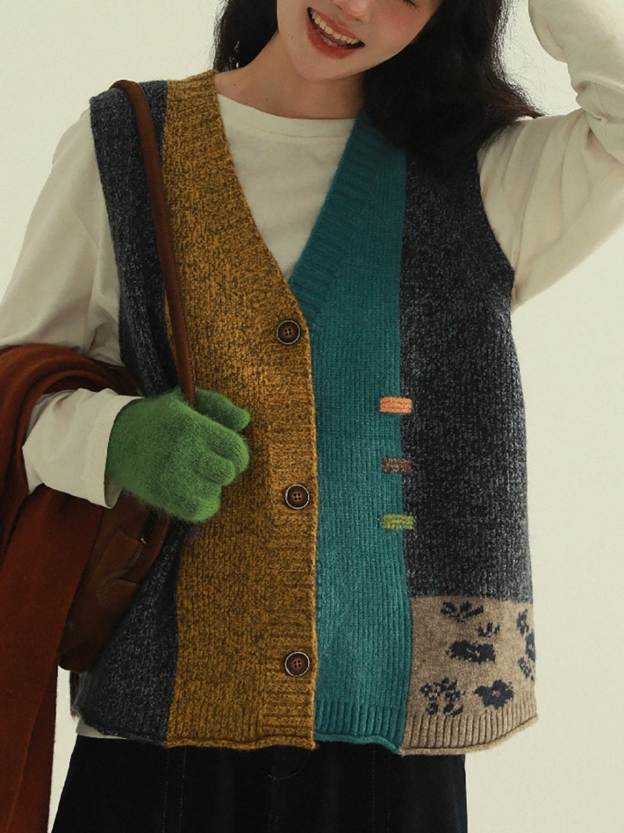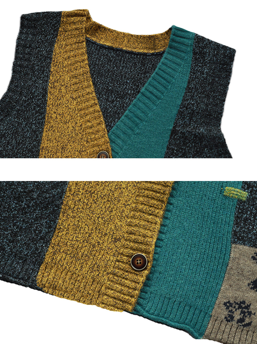 Women Autumn Artsy Patchwork V-Neck Knitted Vest