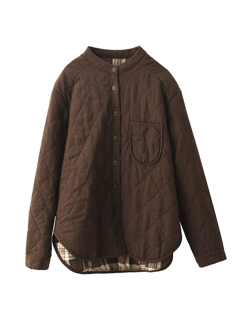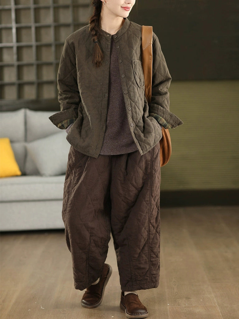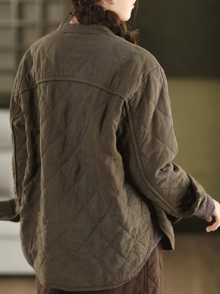 Women Autumn Pure Color 100%Linen Stand Collar Padded Jacket