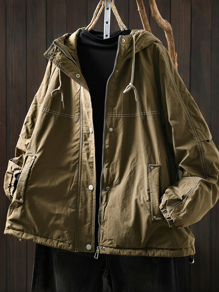 Women Autumn Retro Pure Color Hooded Padded Jacket