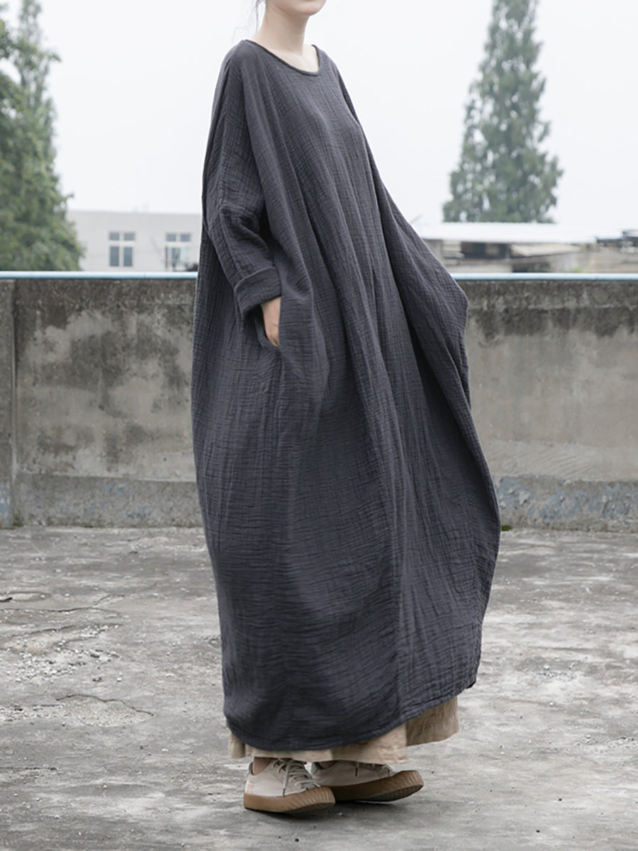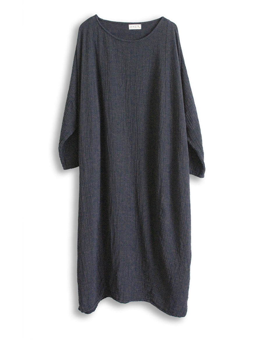 Women Casual Autumn Solid O-Neck Cotton Linen Dress