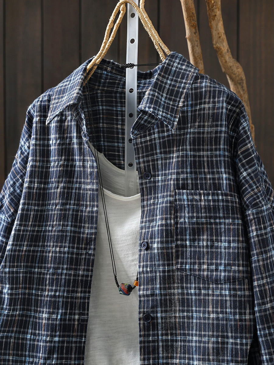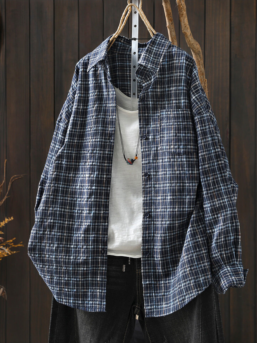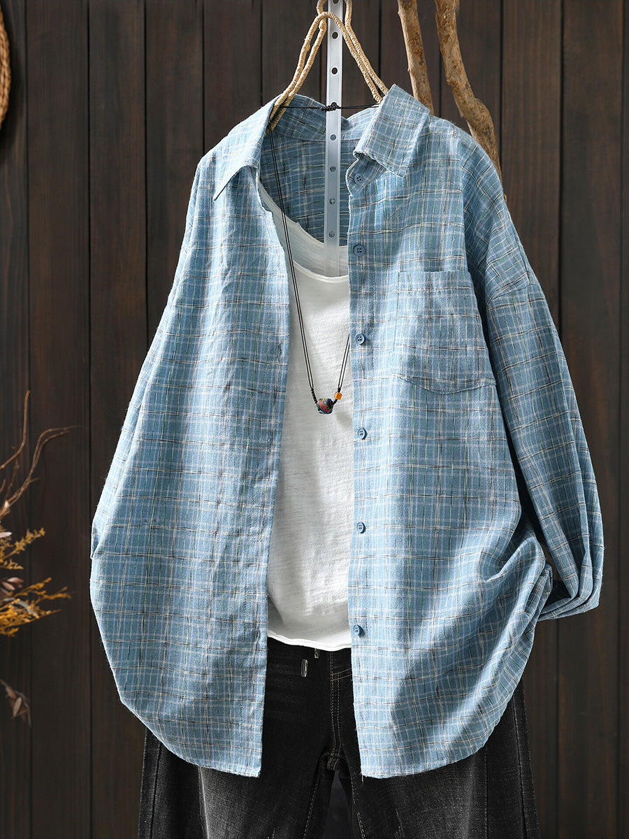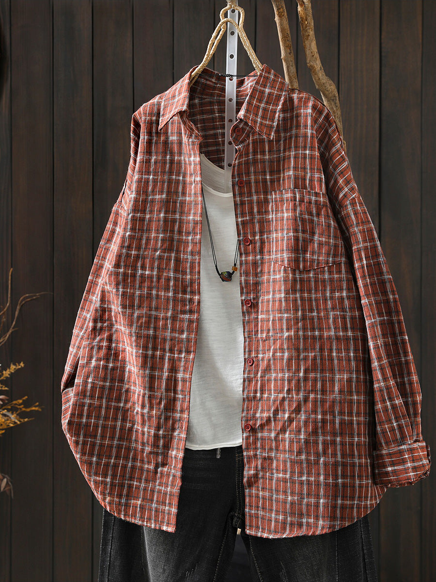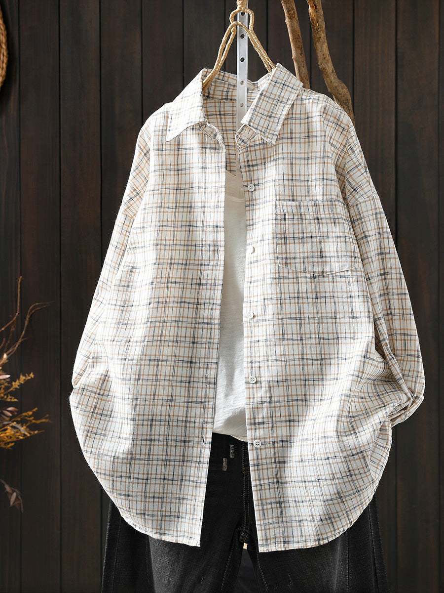 Women Spring Artsy 100%Cotton Plaid Turn-down Collar Shirt