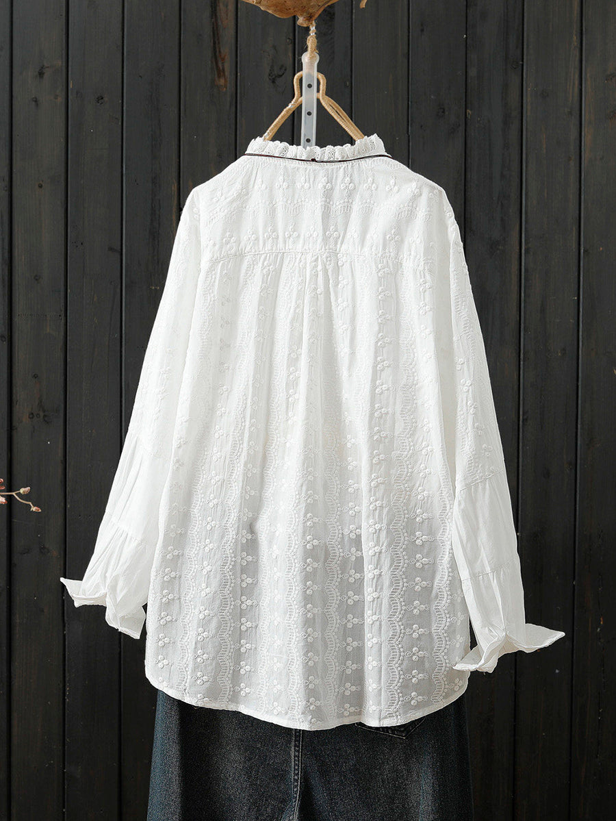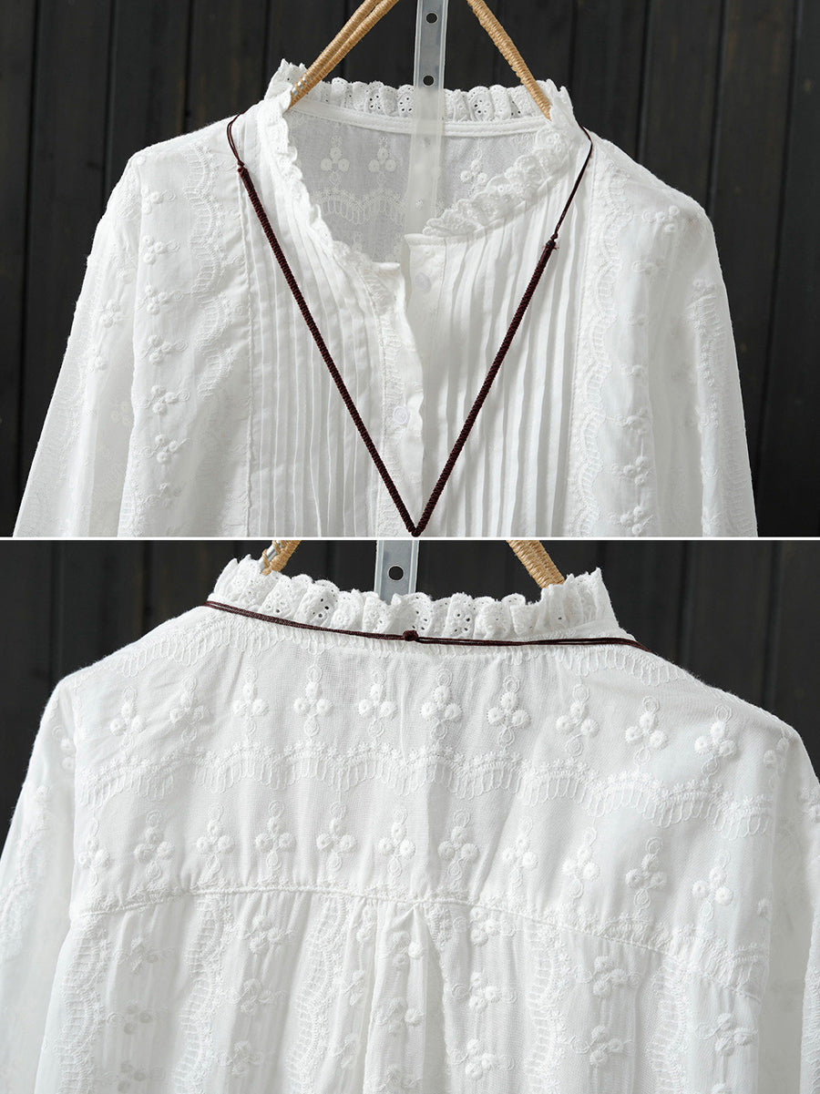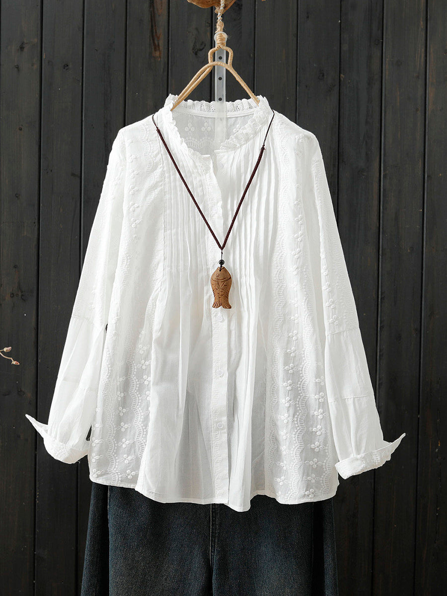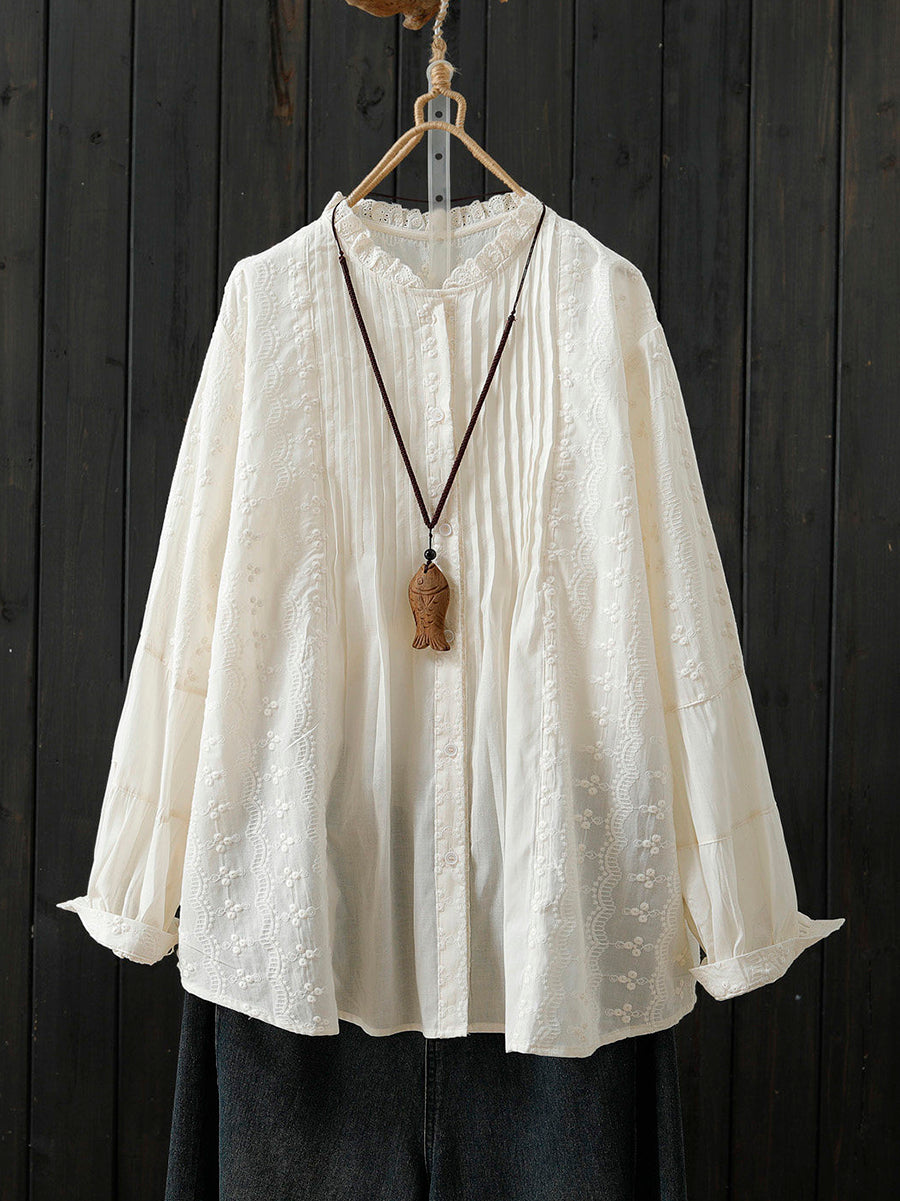 Women Spring Artsy Embroidery Shirred 100%Cotton Shirt