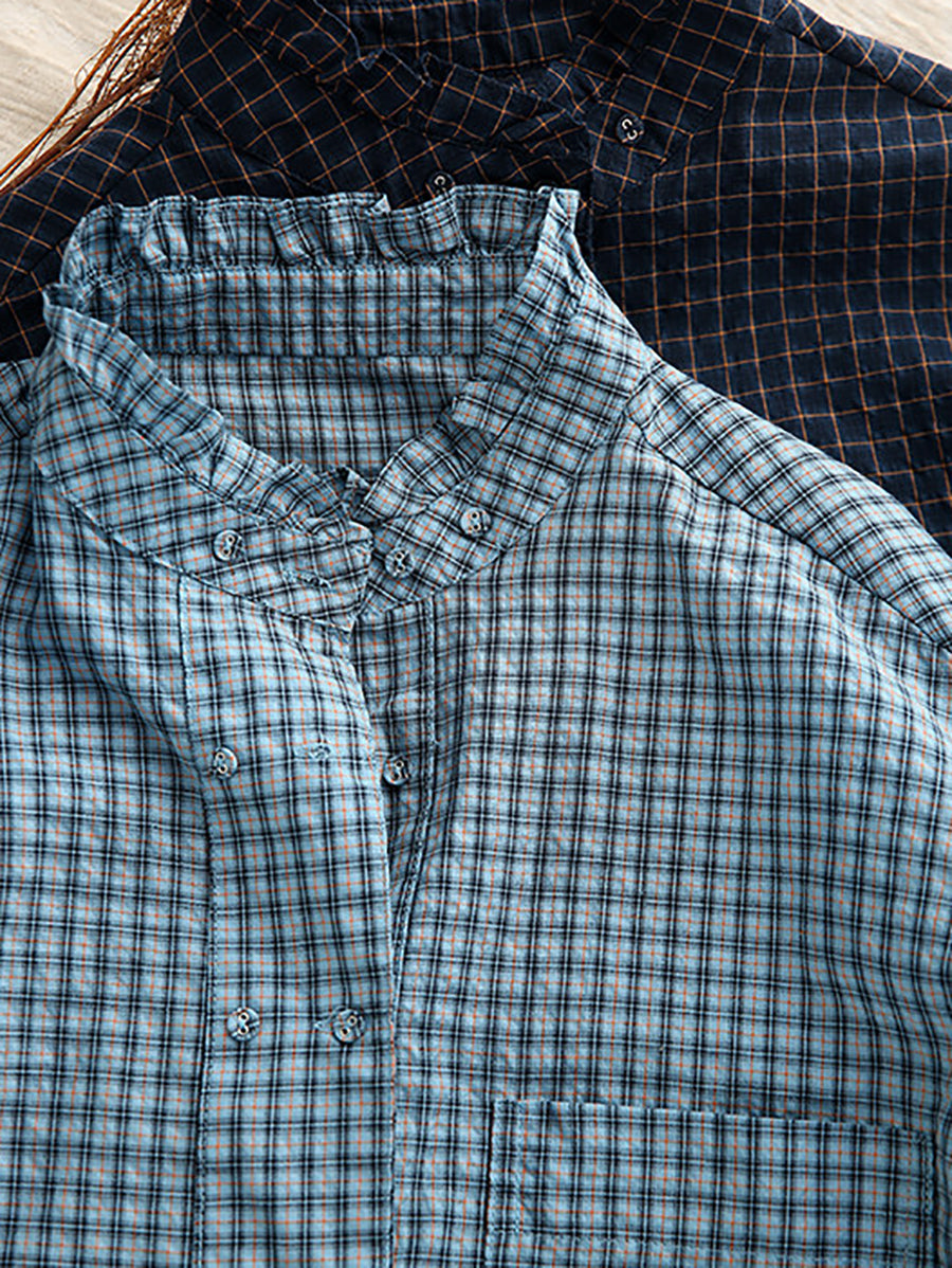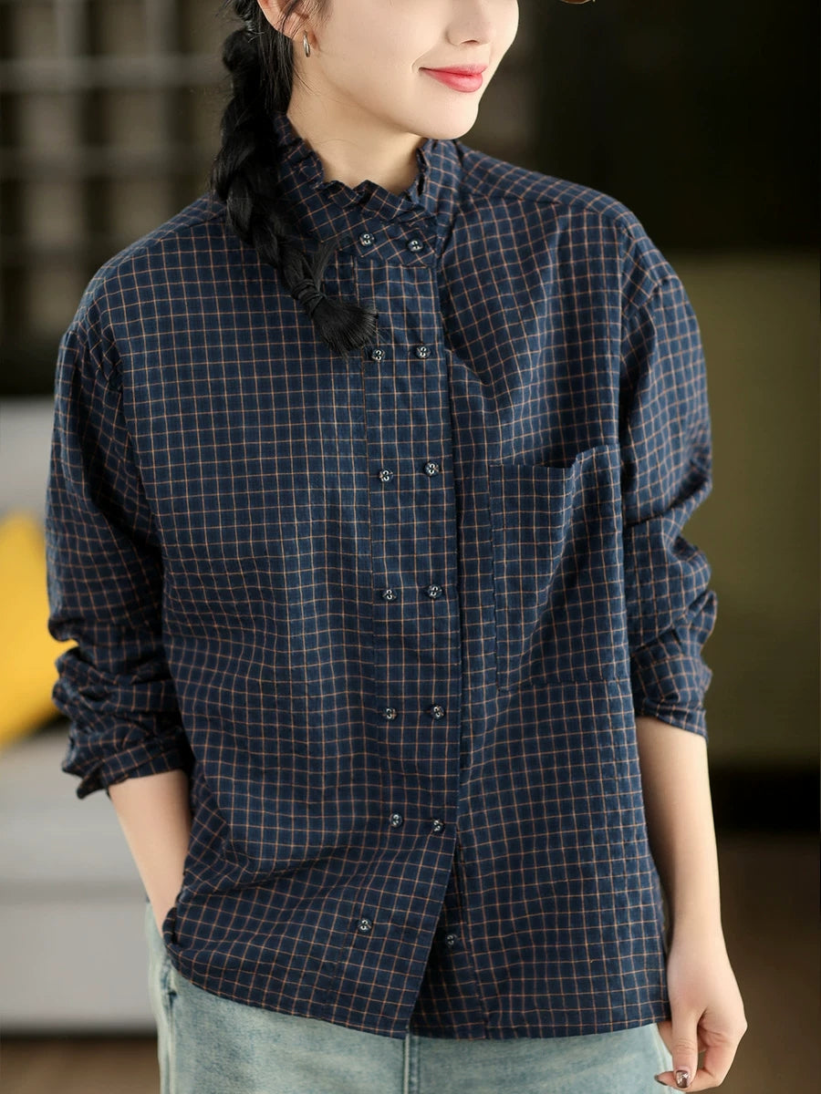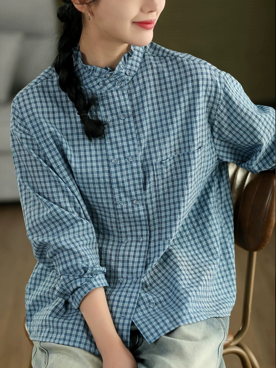 Women Spring Artsy Lattice Cotton Stand Collar Shirt