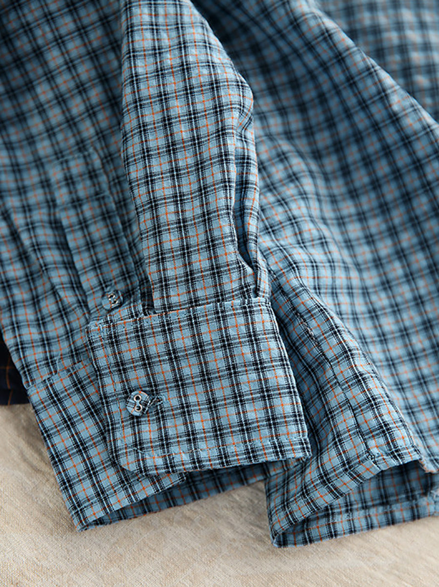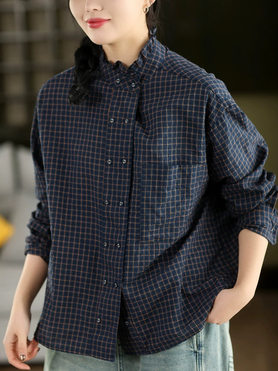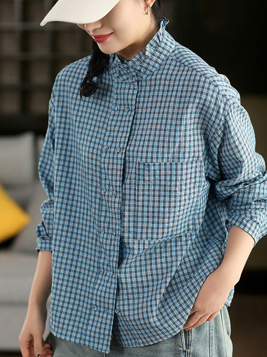 Women Spring Artsy Lattice Cotton Stand Collar Shirt