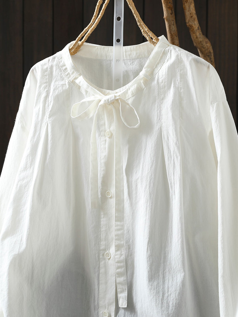 Women Spring Artsy Pure Color 100%Cotton Stand Collar Blouse