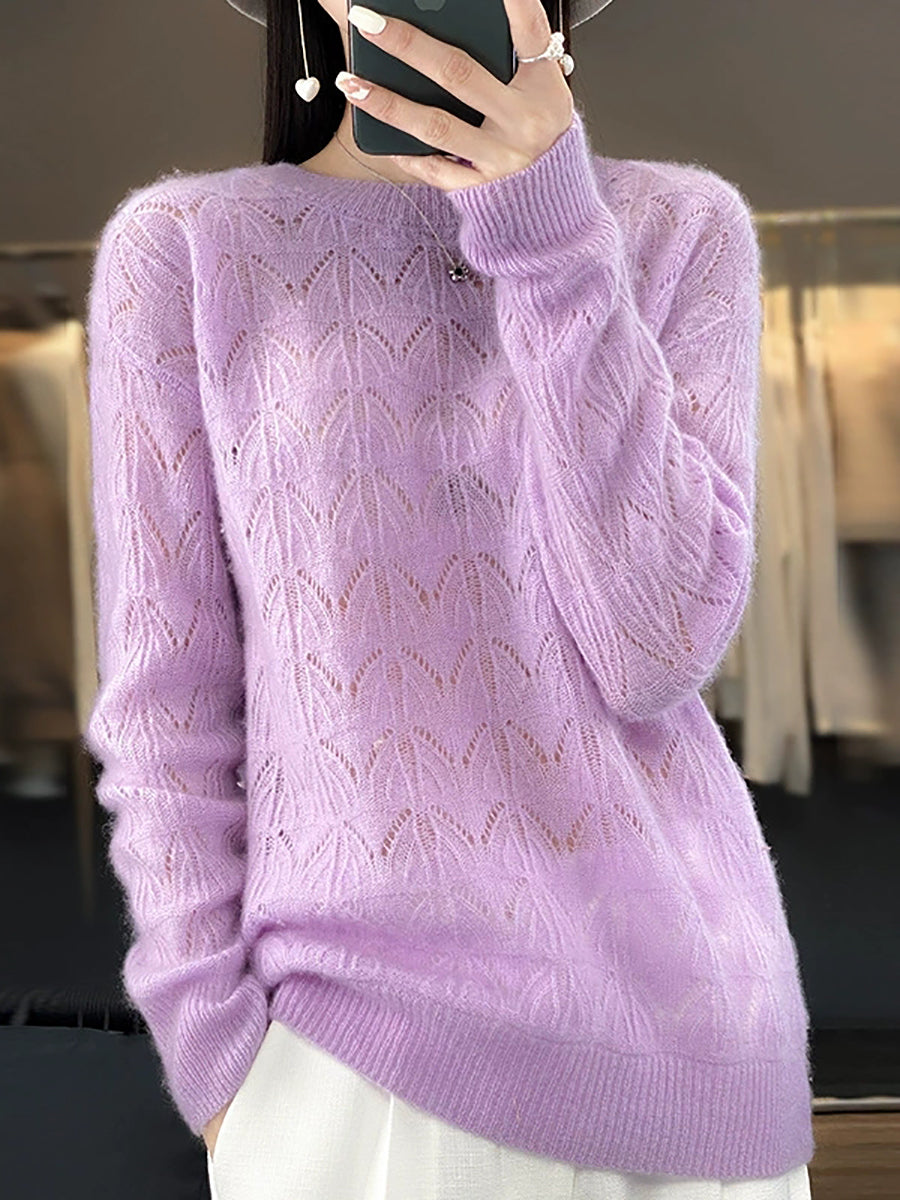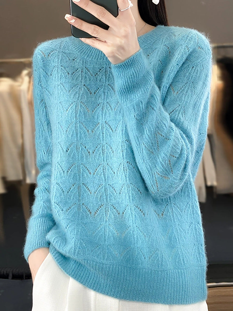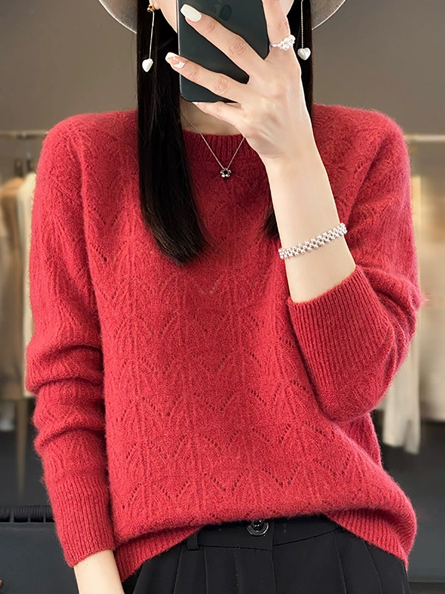 Women Spring Artsy Pure Color O-Neck Wool Sweater