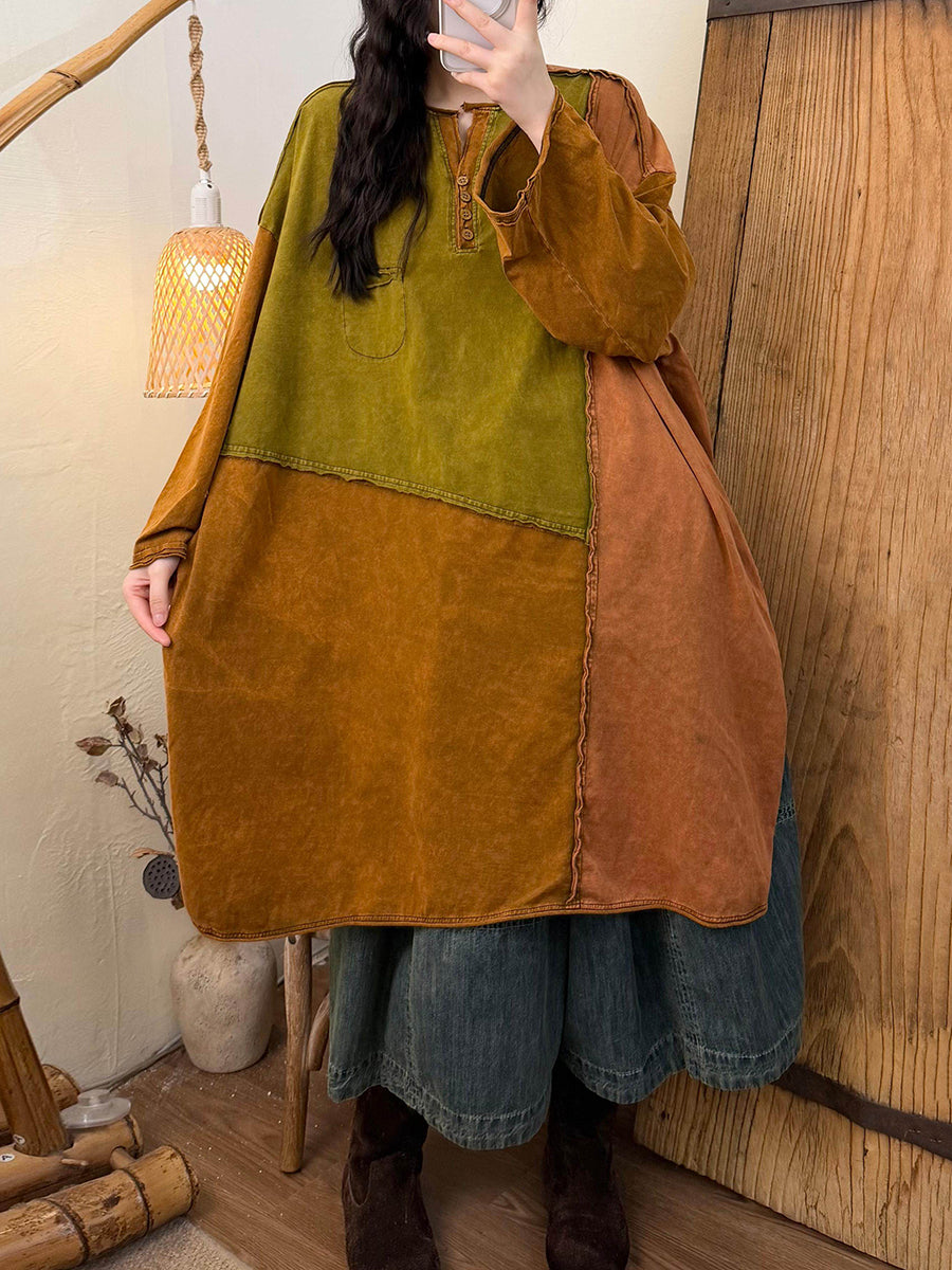 Women Spring Retro Colorblock Cotton Dress