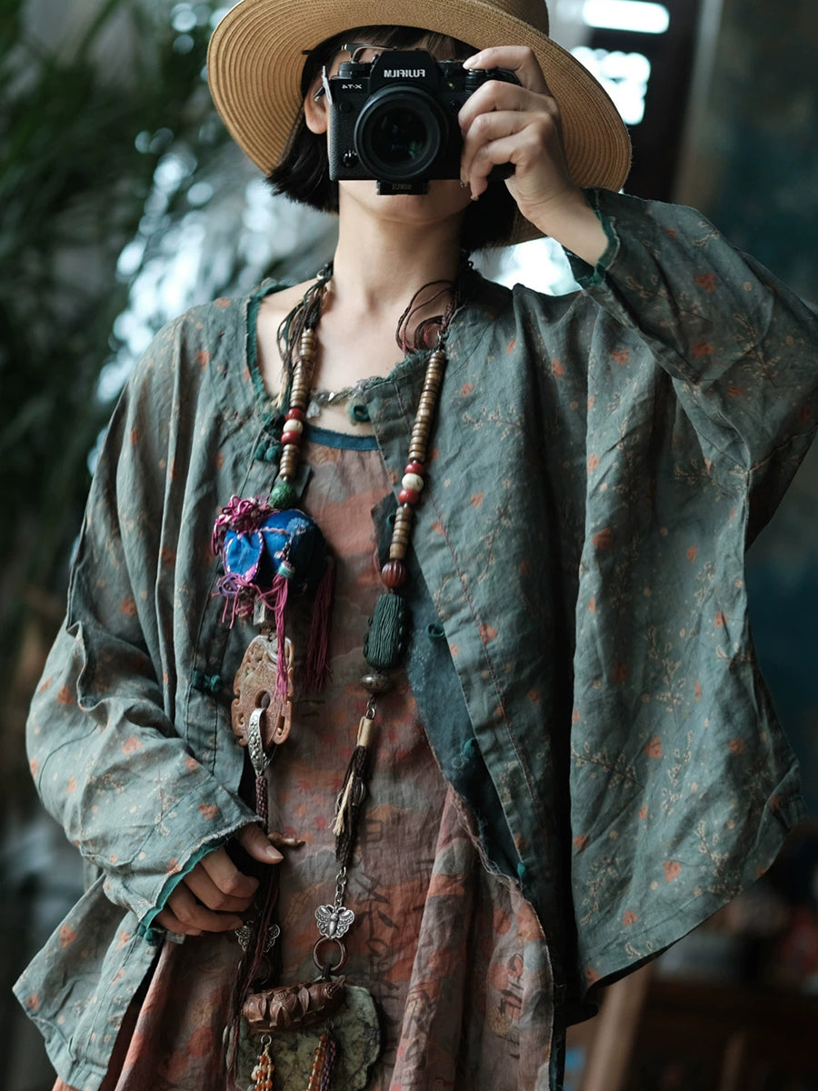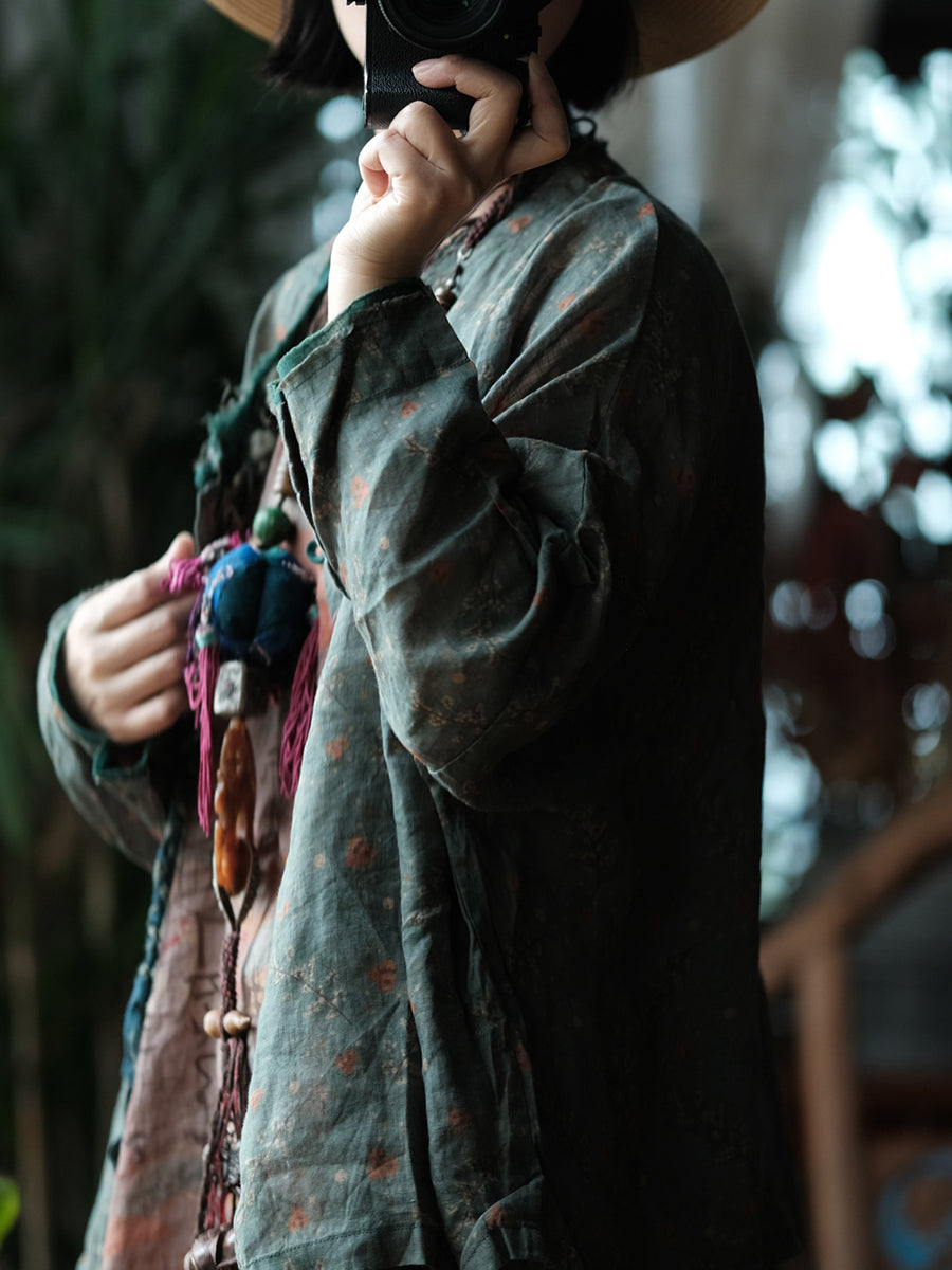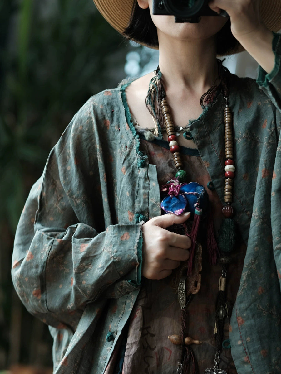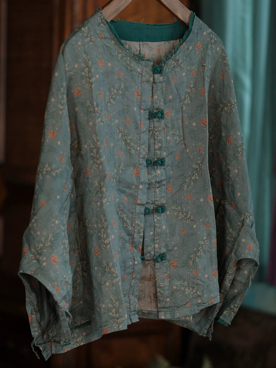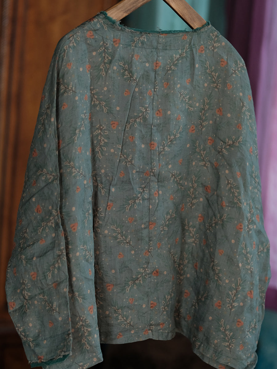 Women Spring Retro Floral O-Neck Linen Shirt
