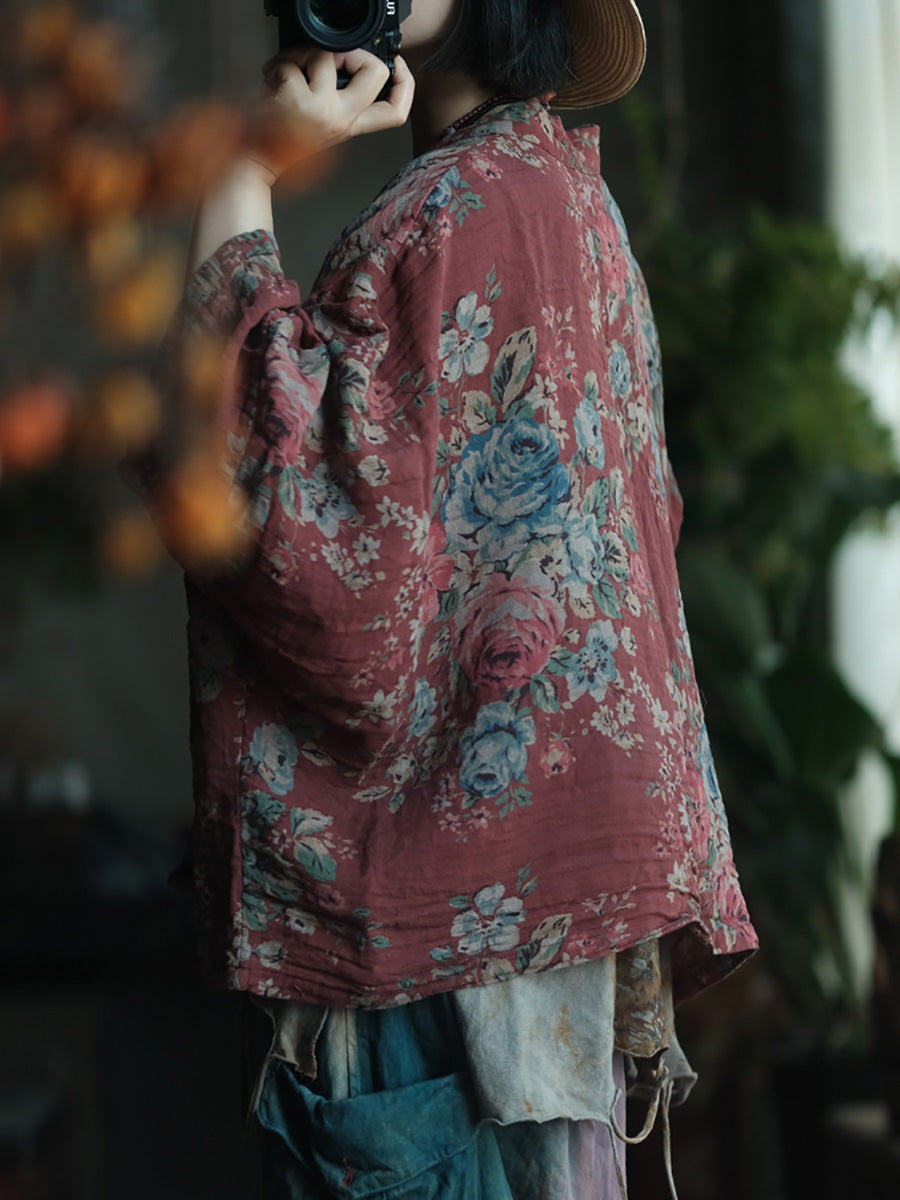 Women Spring Retro Flower V-Neck Cotton Shirt Coat