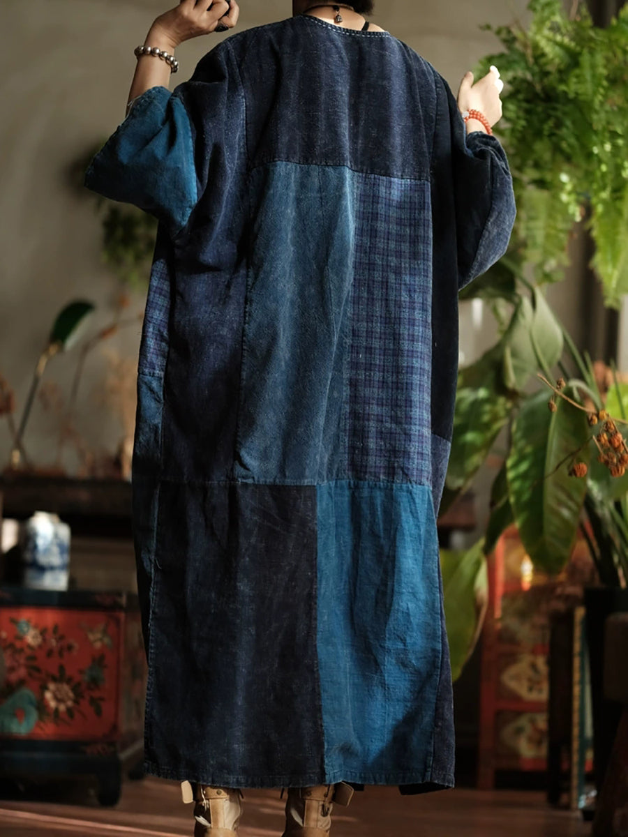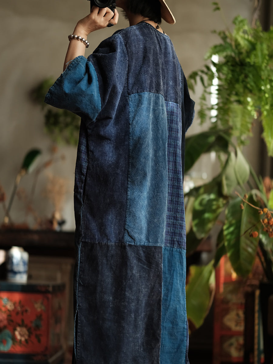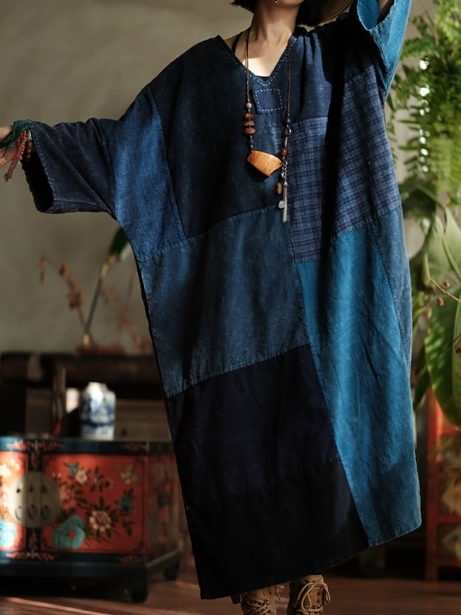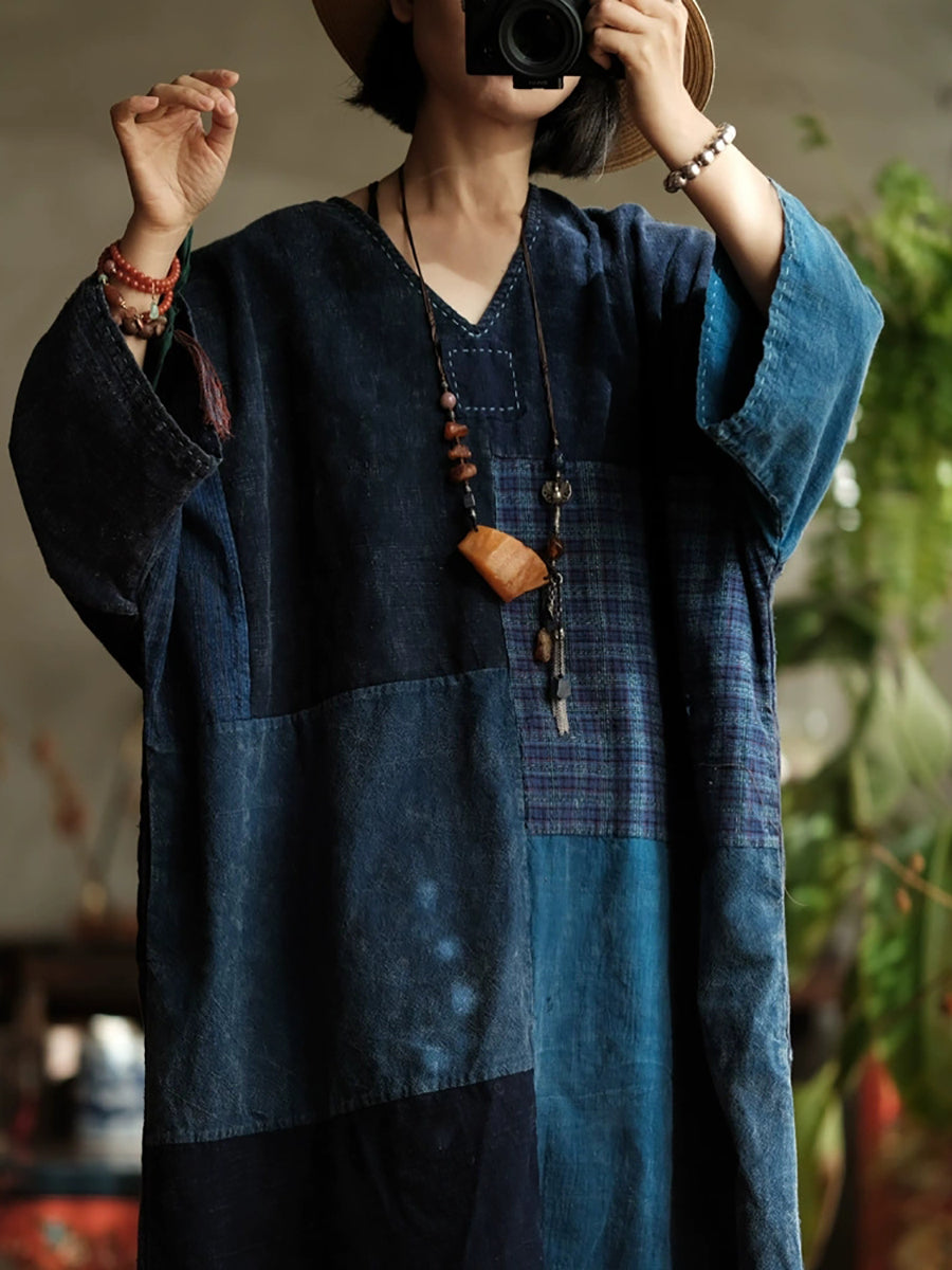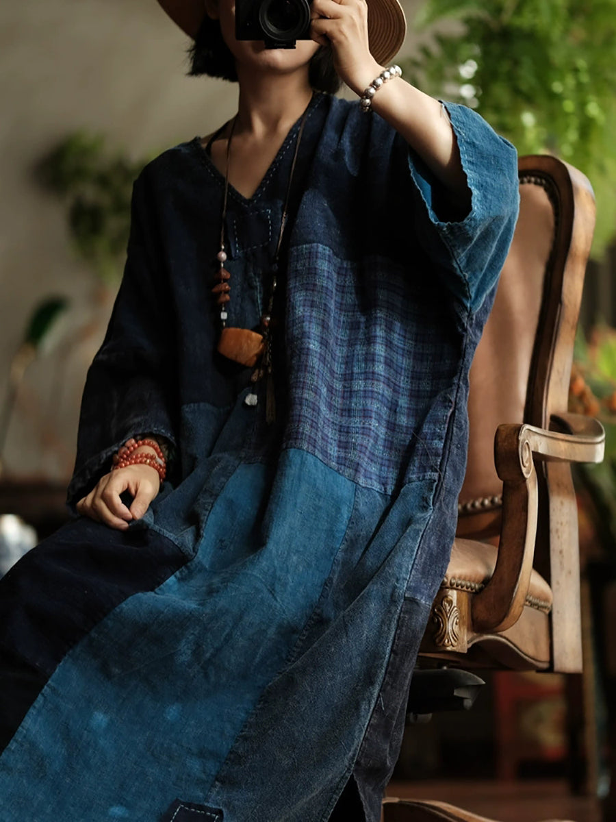 Women Spring Retro Patchwork V-Neck Cotton Dress