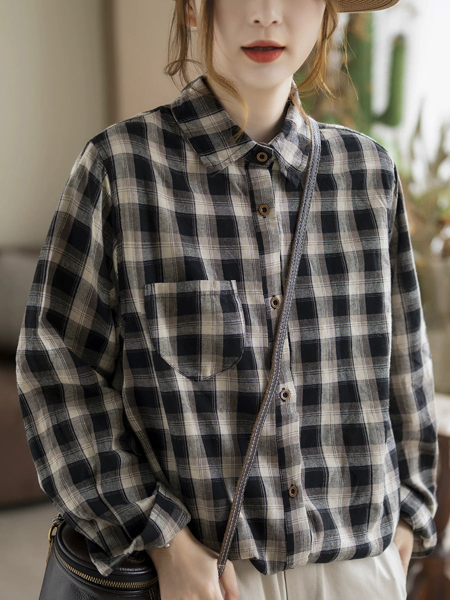 Women Spring Retro Plaid Cotton Turn-down Collar Shirt